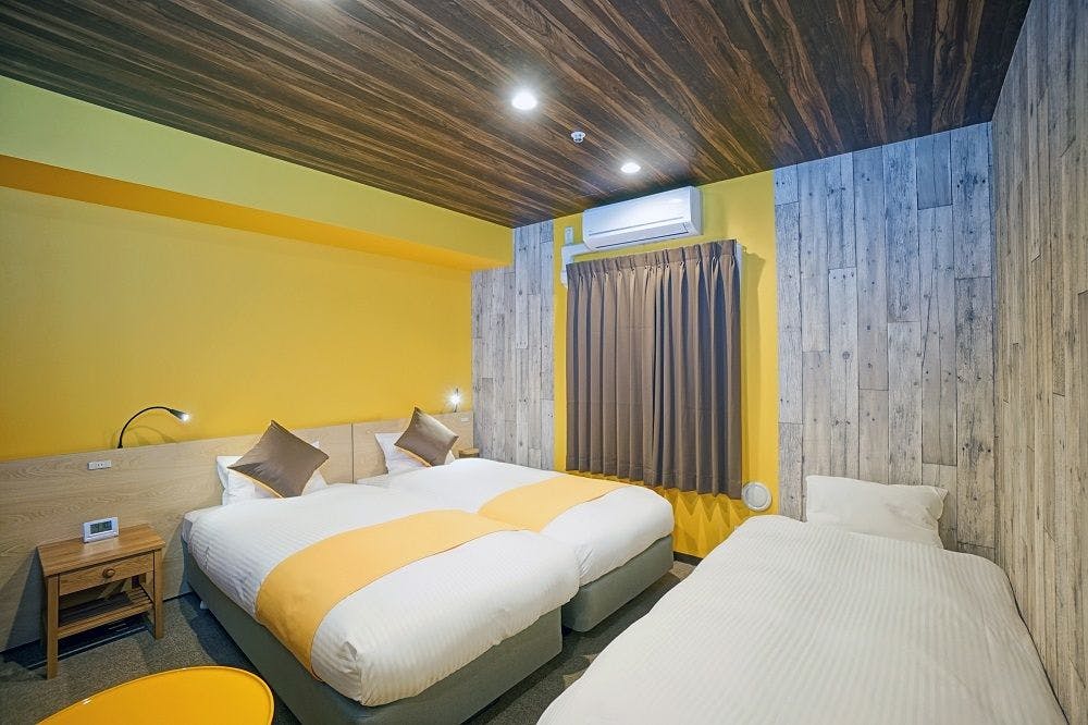 ワイドシングルベッド1台(110センチ幅)、セミダブルベッド1台(130センチ幅)、ユニットタイプ。無料のWi-Fi。2名様まで添い寝可(未就学児まで)