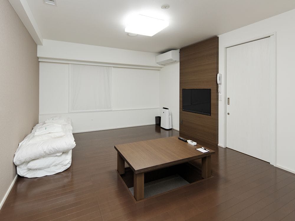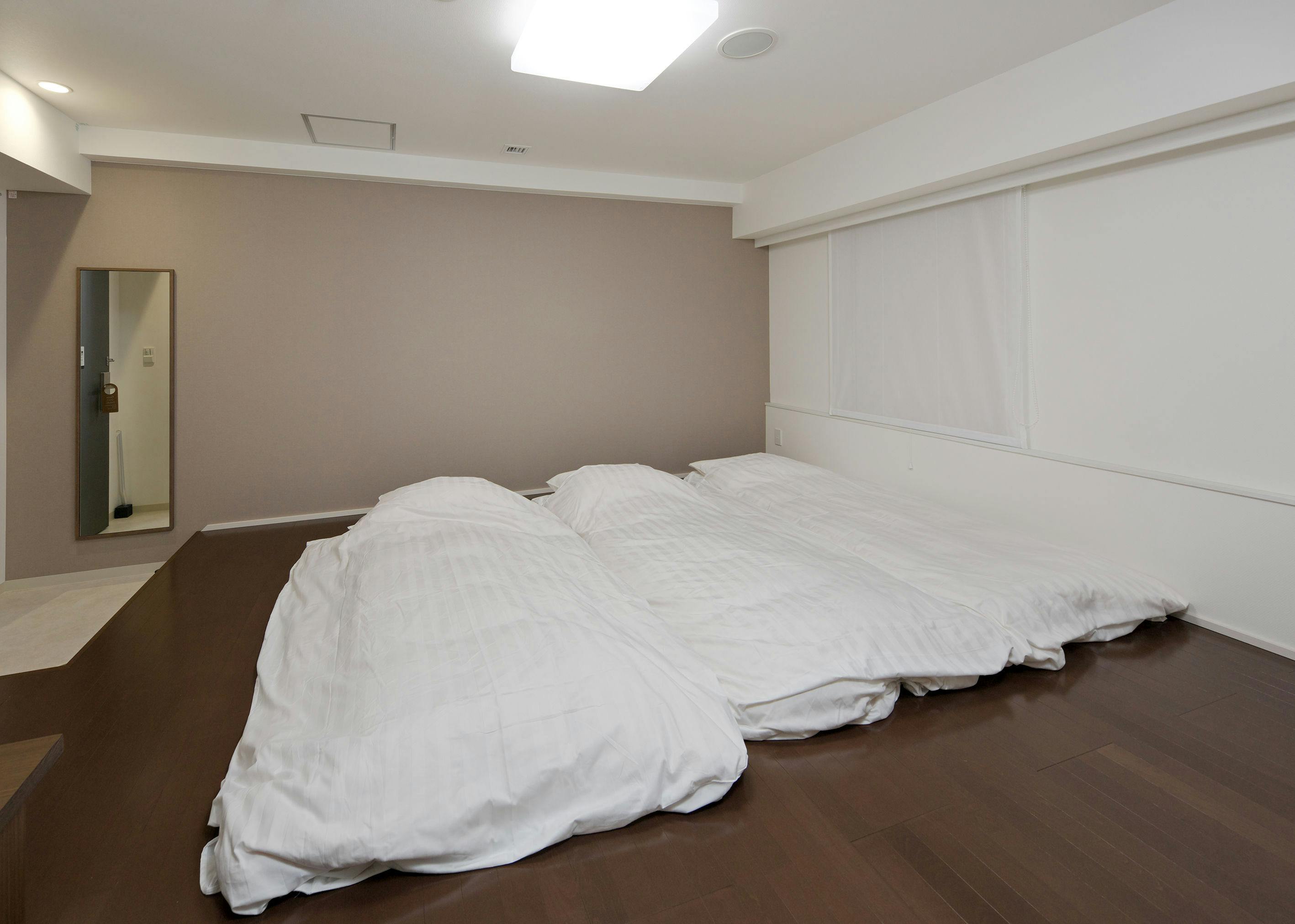パレットルームとは、クツを脱いで過ごす、掘りごたつ式のフローリングのお部屋です。床全体をフラットにでき、テーブルや座イス、布団のレイアウトをお好みで変更できます。布団幅:95cmお布団を敷いた状態でのチェックインをご希望の方は、ご予約時に「宿へのコメント欄」へご記入下さいませ。