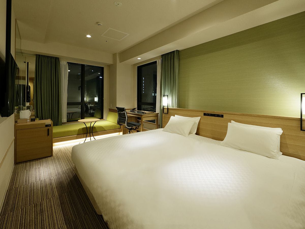 【面積】15平米 【収容人数】1名(大人)【ベッドサイズ】ダブルサイズ(1,500mm)シモンズベッドx1台【客室設備】こあがりソファ、デスク、48インチ液晶テレビ、無料Wi-Fi