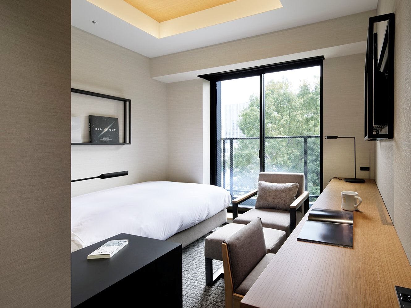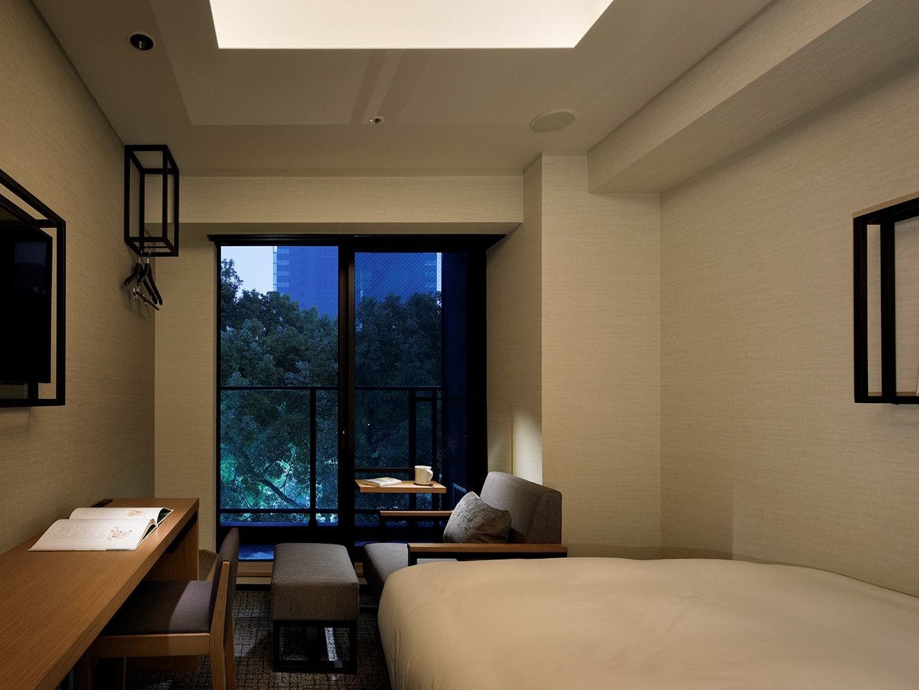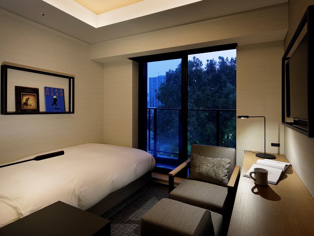 シンプルで機能的なシングルルームに、公園を見下ろすバルコニーをプラス。読書に疲れたら、夜風を浴びながらひと休み。そんな、ちょっと贅沢な読書体験をお届けします。歯ブラシが客室に常設からレセプション提供に変わります。