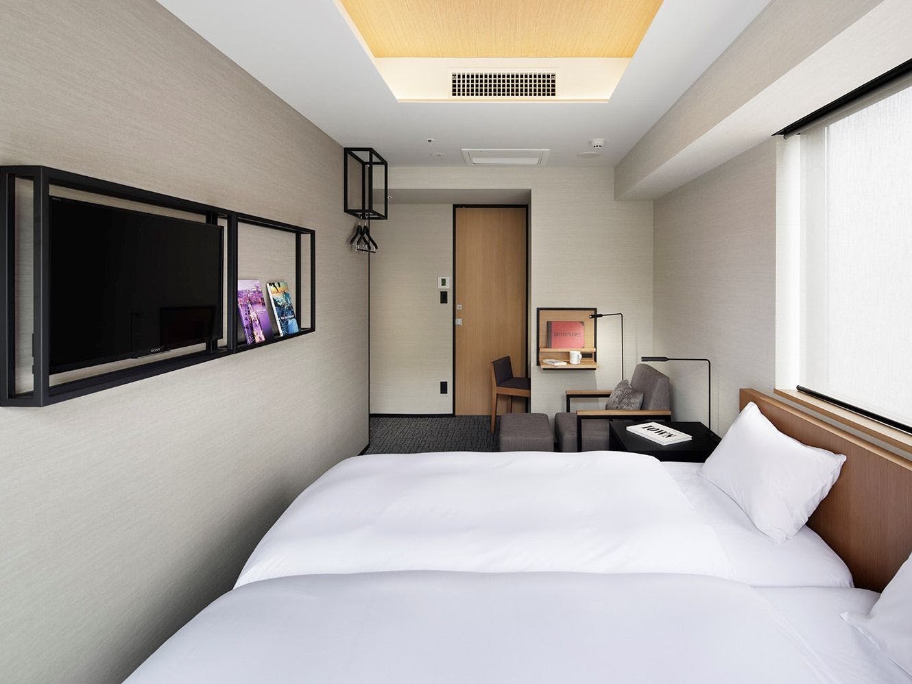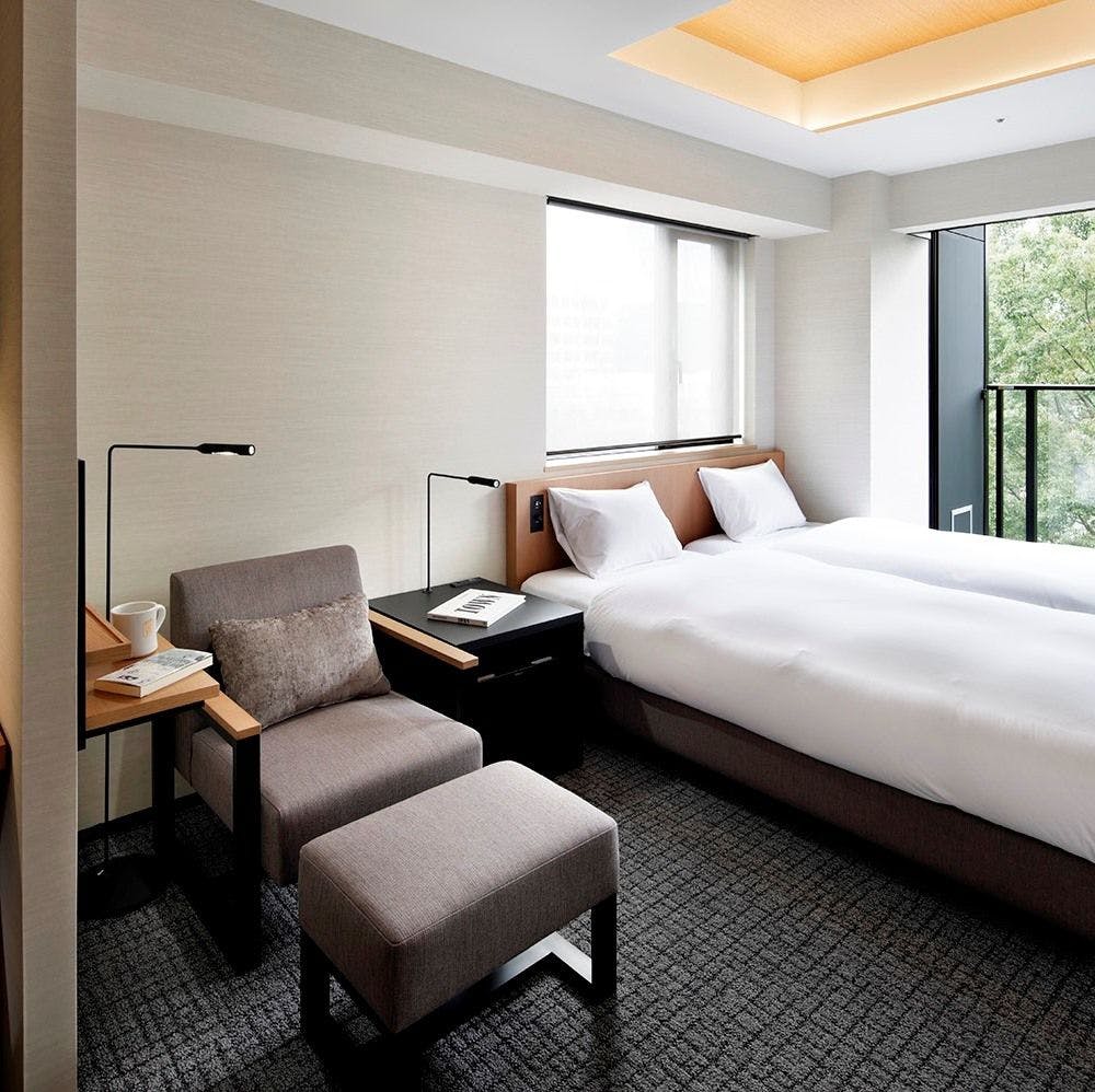 本を読むためのソファーやバルコニーのある空間に、2台のベッドを設置した、2名様で快適にお過ごしいただけるツインルームです。歯ブラシが客室に常設からレセプション提供に変わります。