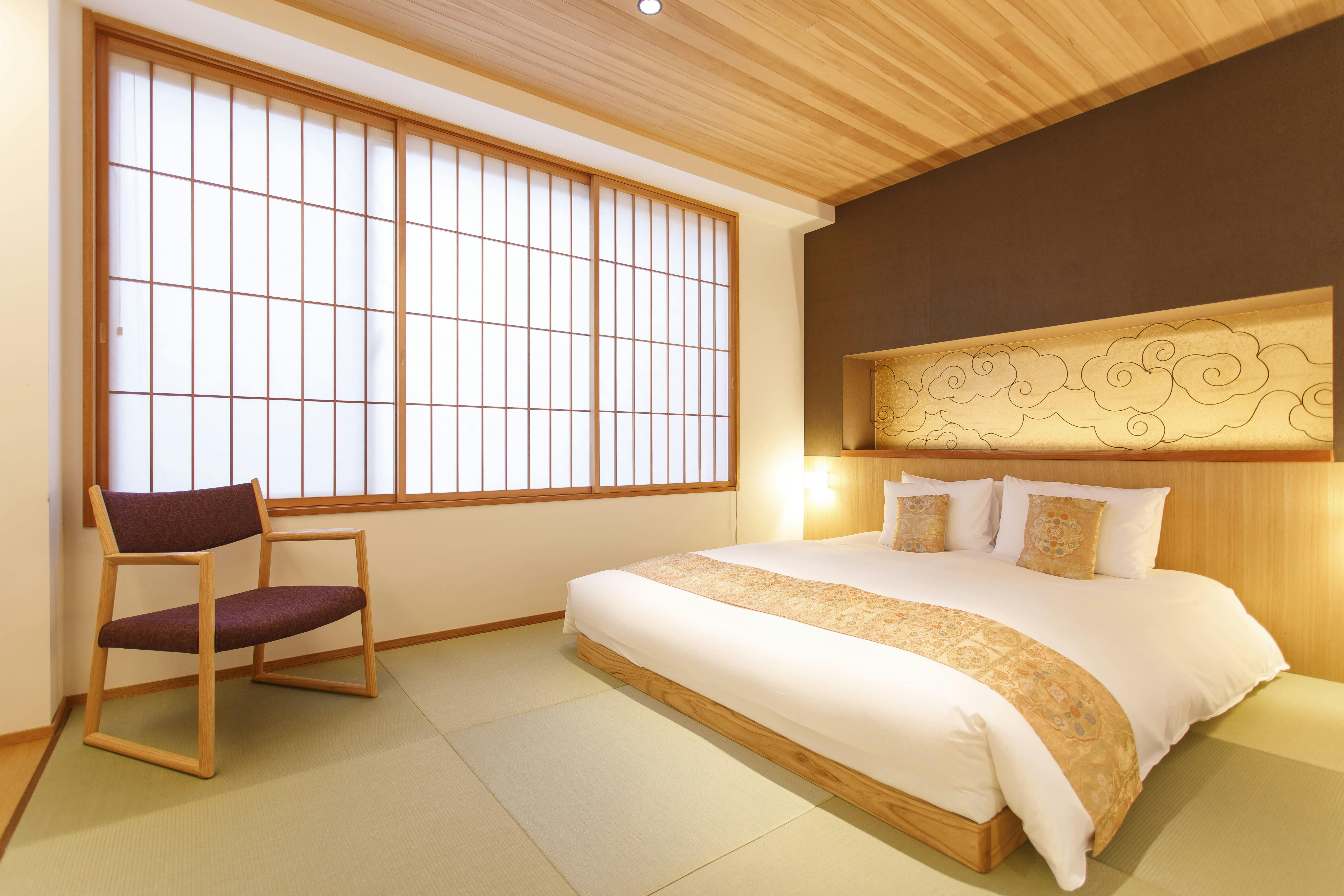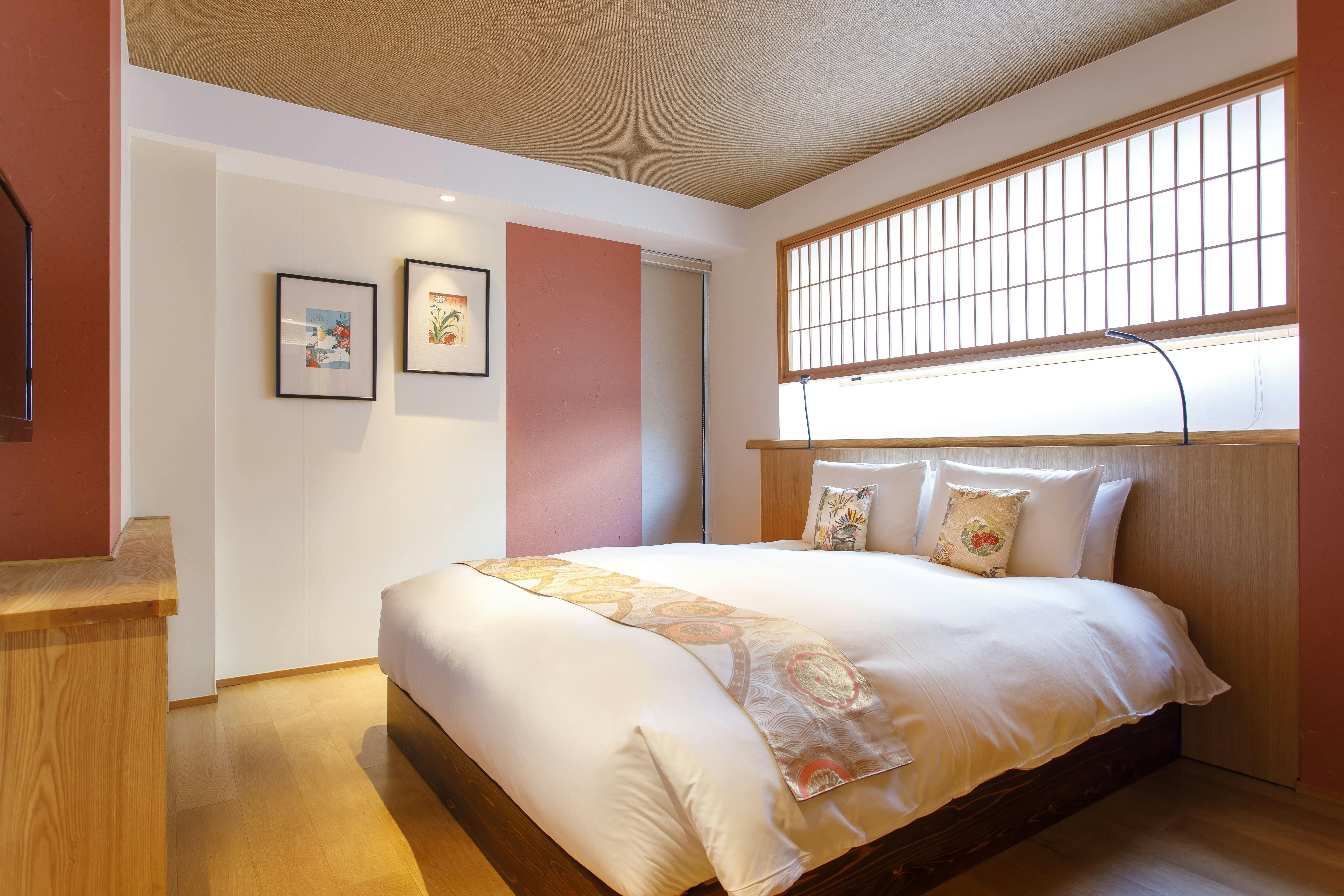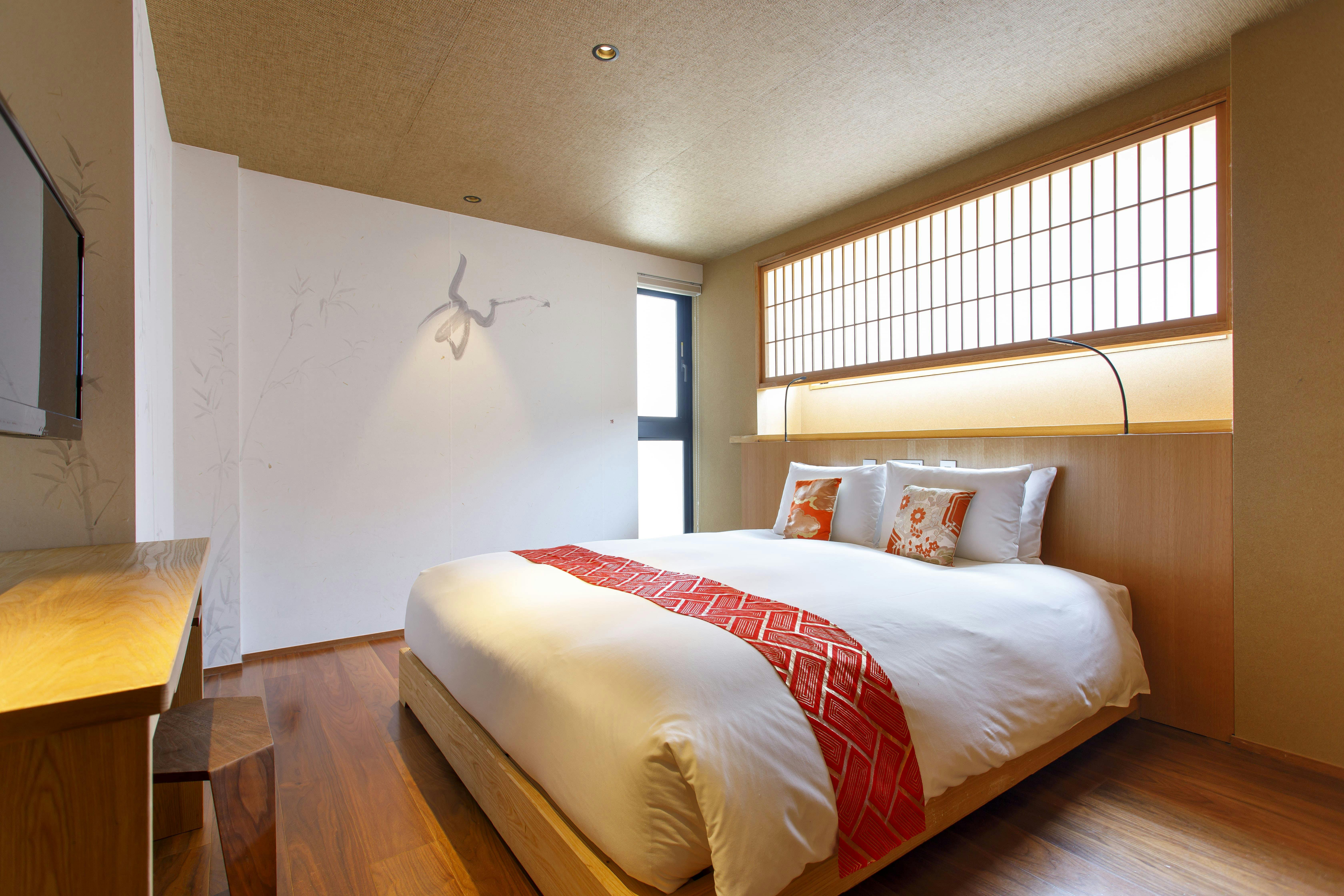クイーンベッドでゆったりと眠れる客室は伝統的な町家の雰囲気を楽しみながら、こだわりのアメニティ、設備を揃え快適さを提供します。