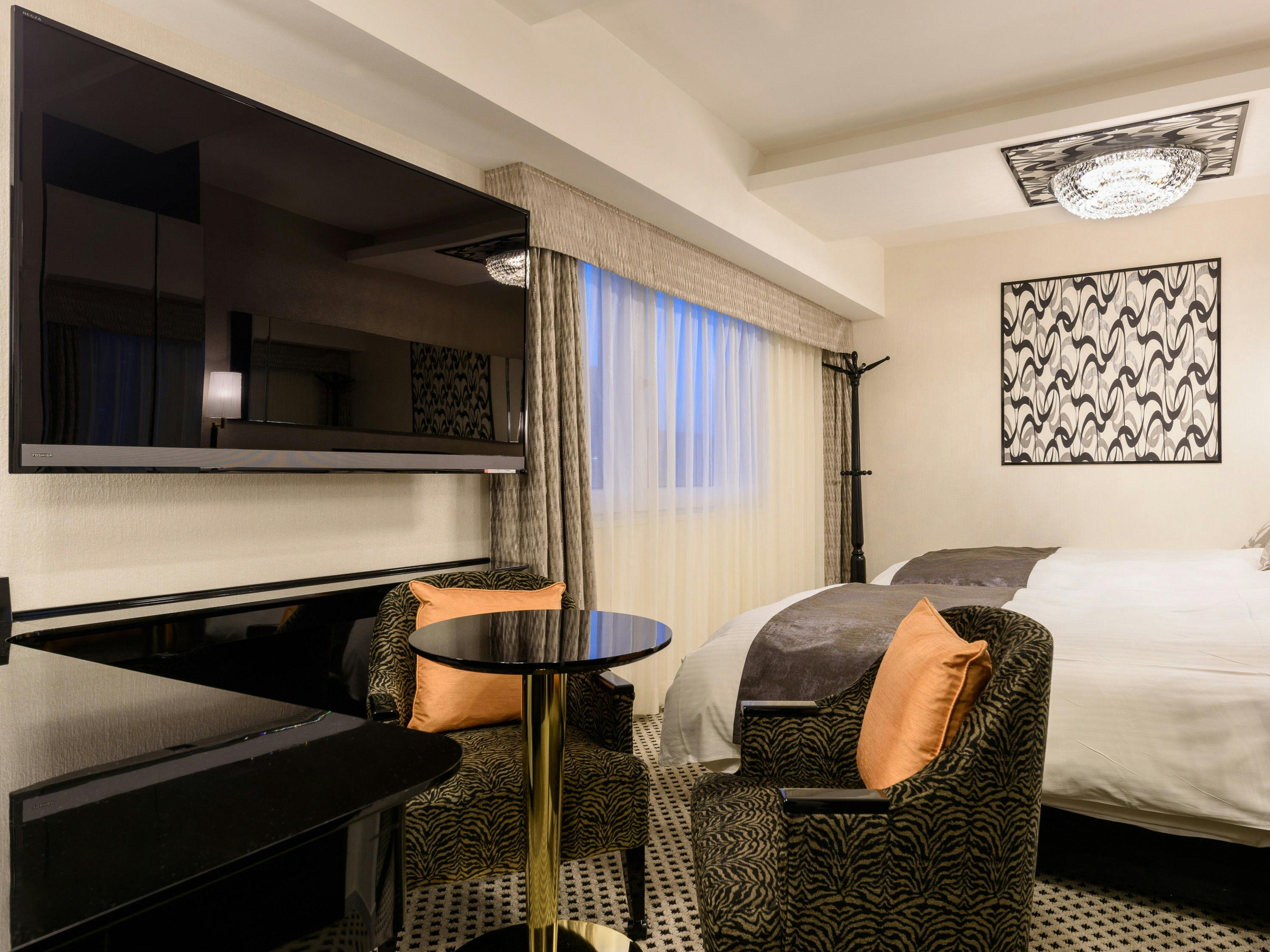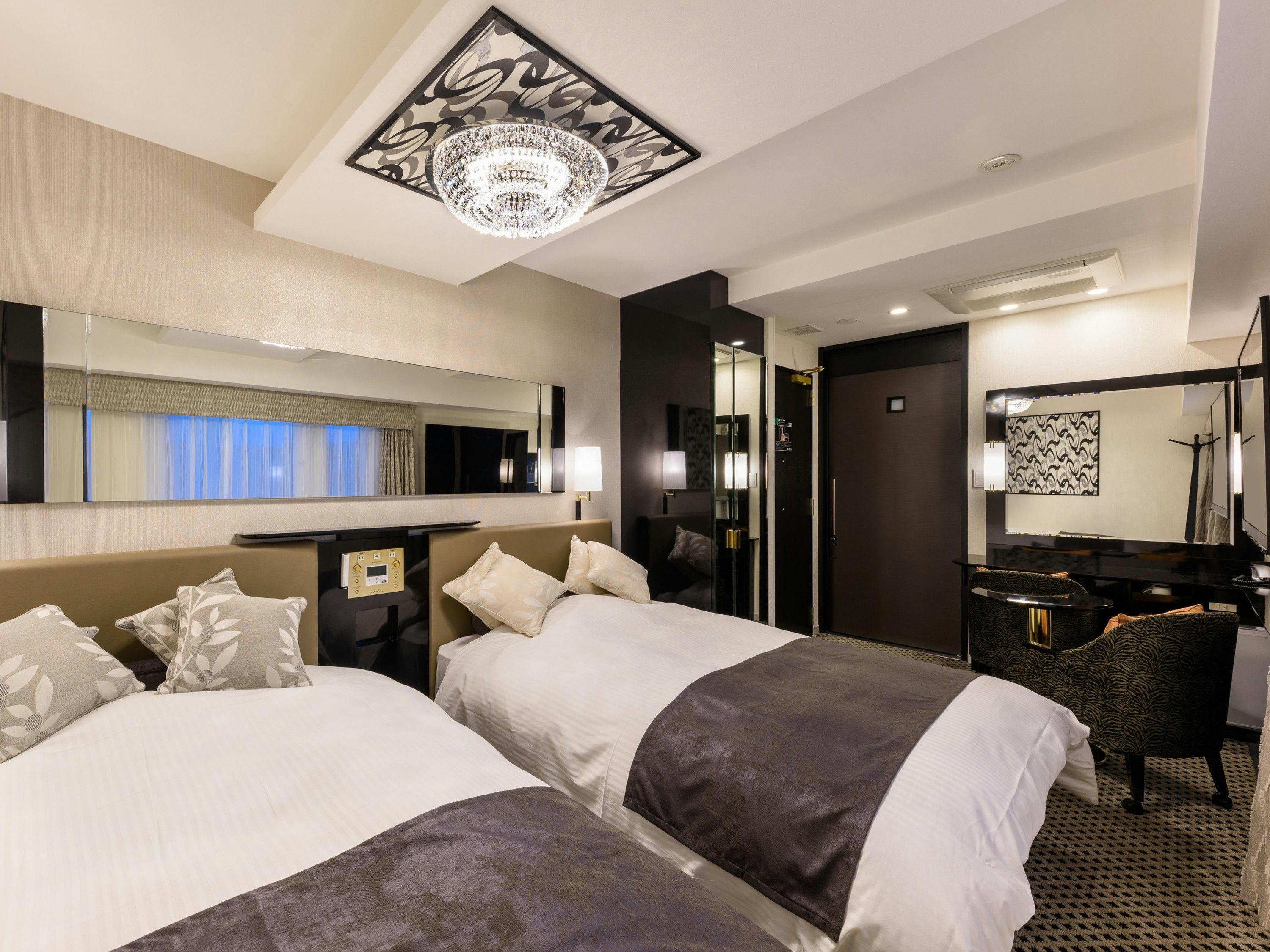 ●広さ21.8平米/ベッド幅122cm×2台●58型液晶テレビ●携帯、スマホの充電に便利な枕元コンセント・USBポート●Wi-Fi、LAN接続無料●完全遮光、断熱遮熱カーテン●シーリングライト採用●リモコン類を集約した枕元集中コントローラー●温水洗浄便座(ウォシュレット)●ふんわりやわらか羽毛布団●オリジナル3Dメッシュまくら【Air Relax】●ハイグレードアメニティ(歯ブラシ、レザーなど)