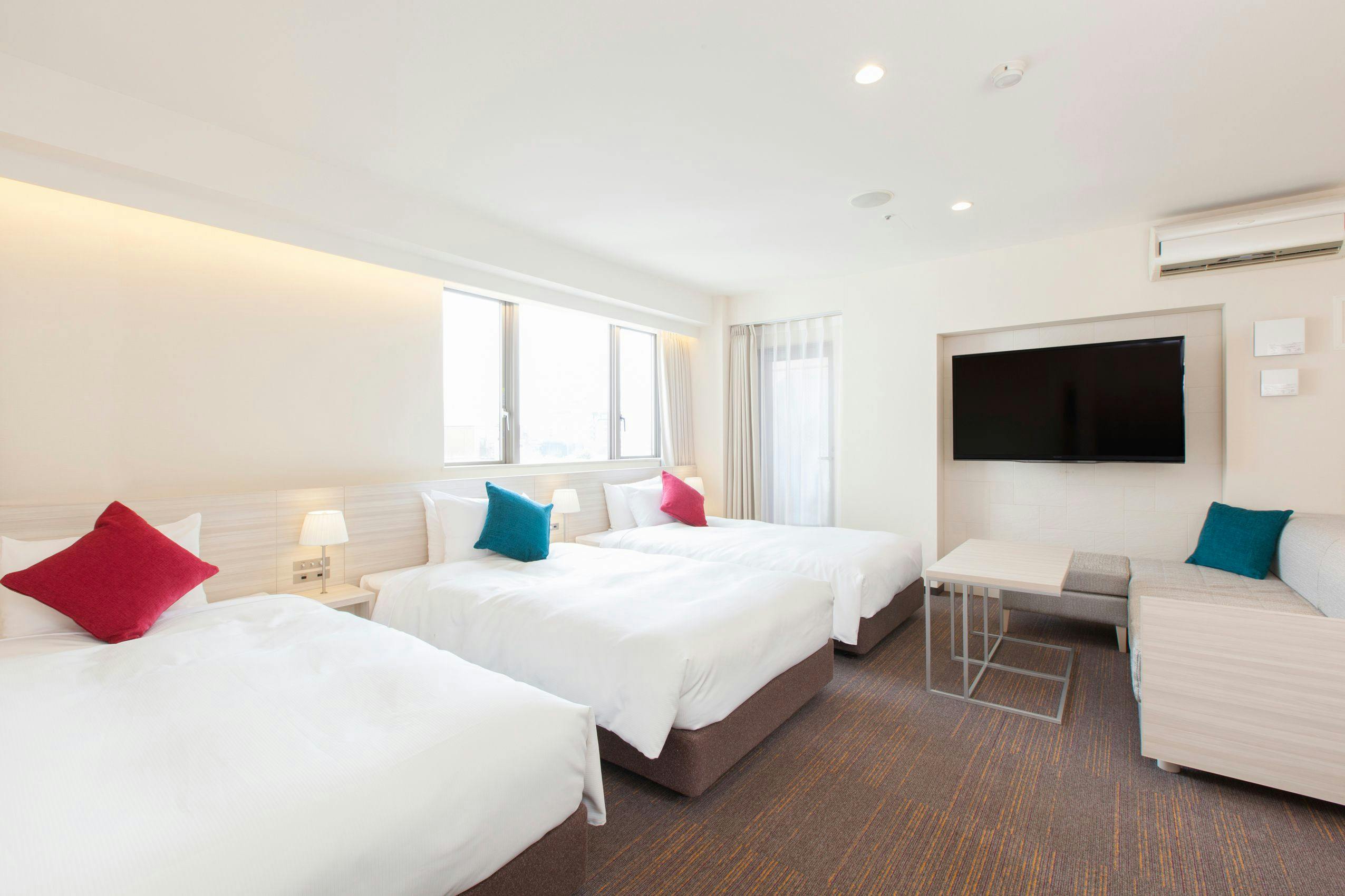 待望のトリプルルーム!37平米の広々とした客室に1100mmのベッド3つと、洗濯乾燥機、ミニキッチンを配置!ご家族や仲間との旅行におすすめです!トリプルルームにはソファベッドも完備していますので、4人での滞在もOK!!