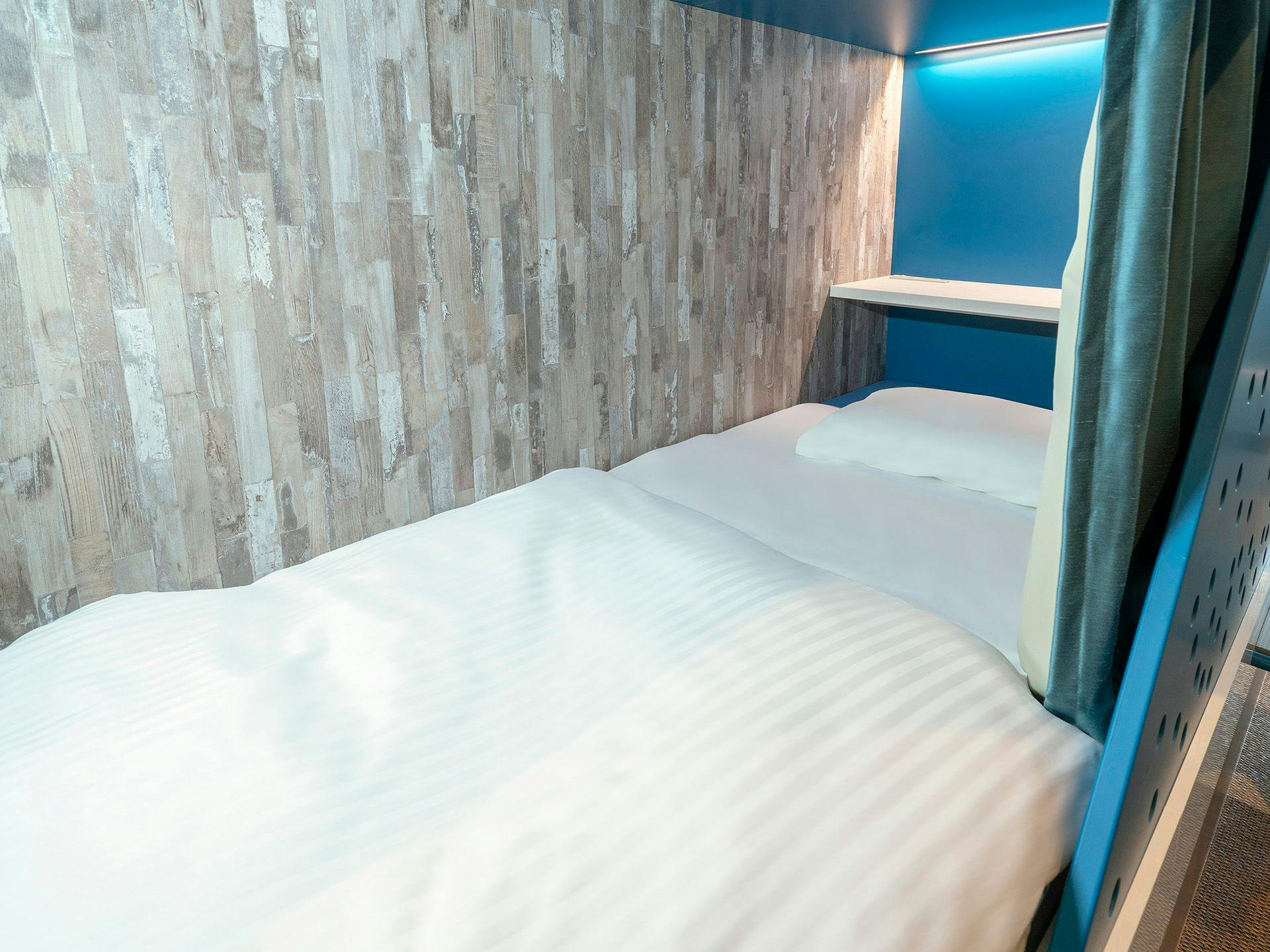 それぞれのベットのベットヘッドには読書灯や充電用USBポート<Type-A>付きコンセント、足元にはラック、鍵付きボックスが備え付けられています。遮光カーテンを閉めればプライベート空間になります。(男女同室でご利用いただけます・18歳未満・添い寝のご利用不可)