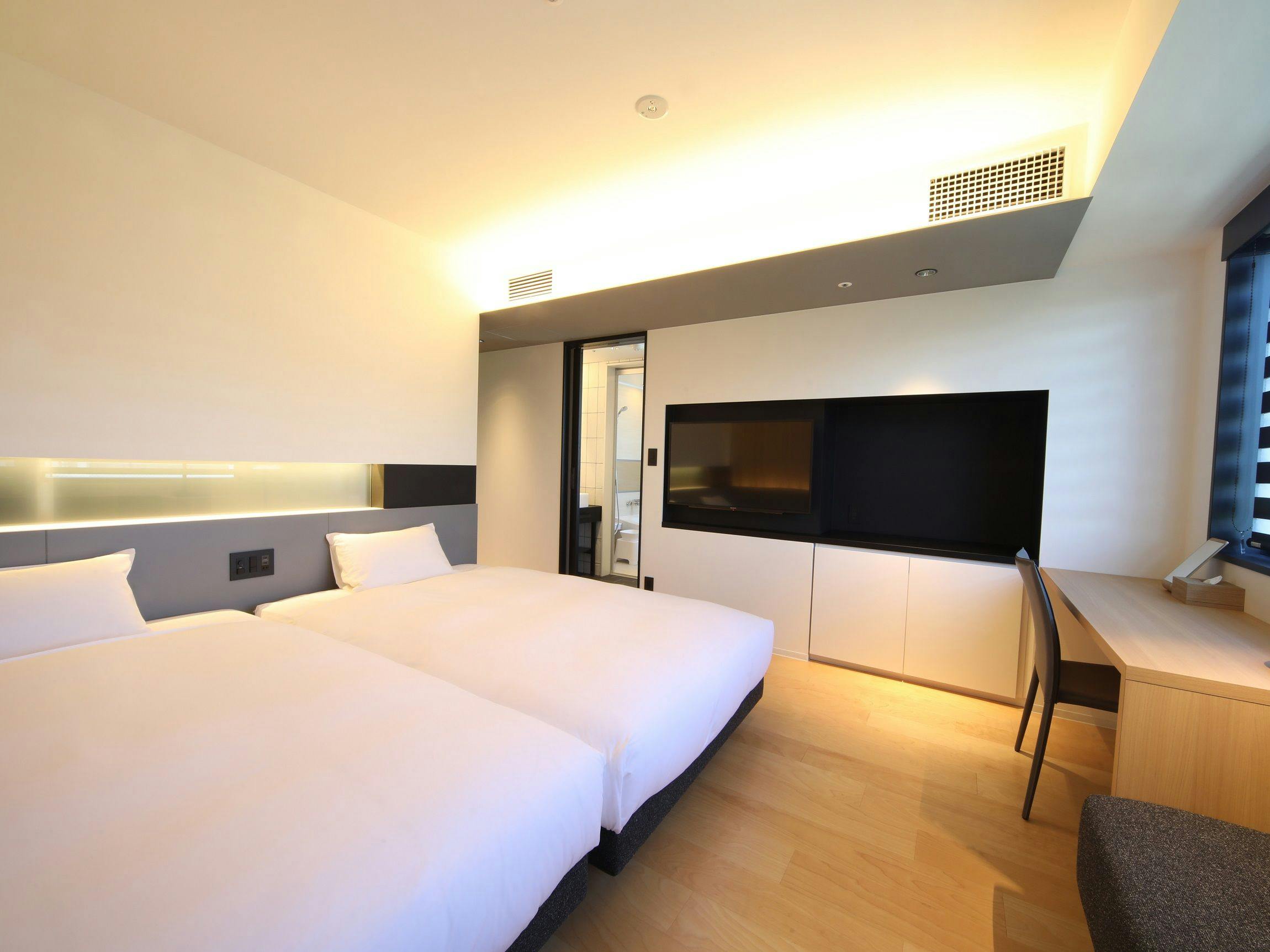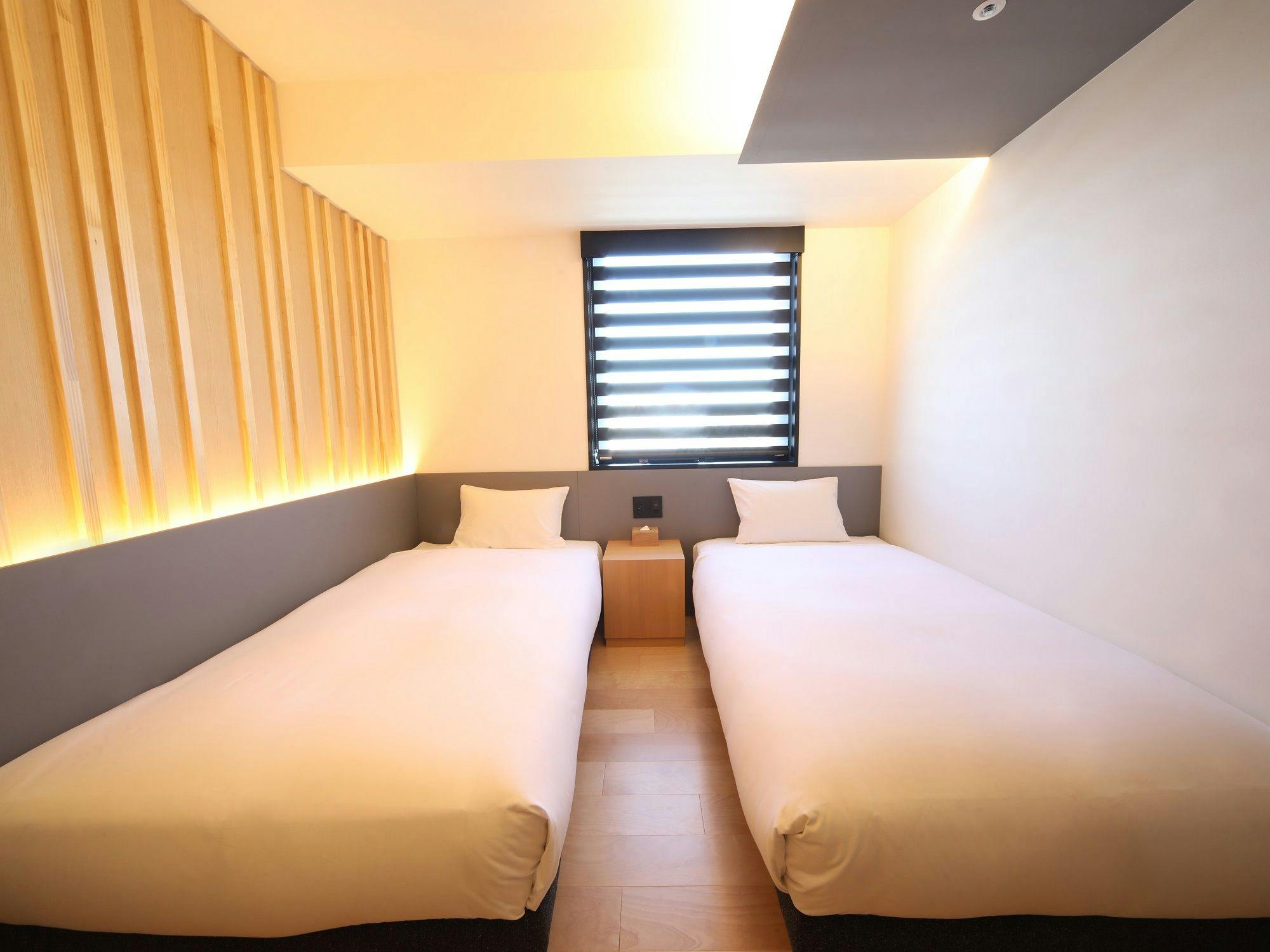 ・16平米【ベッド幅100cm×2】(定員2名)アンドルームス名古屋栄で一番ポピュラーなツインルームです。シンプルながら機能的な空間は、2名様で快適にお過ごしいただけます。歯ブラシが客室に常設からレセプション提供に変わります。