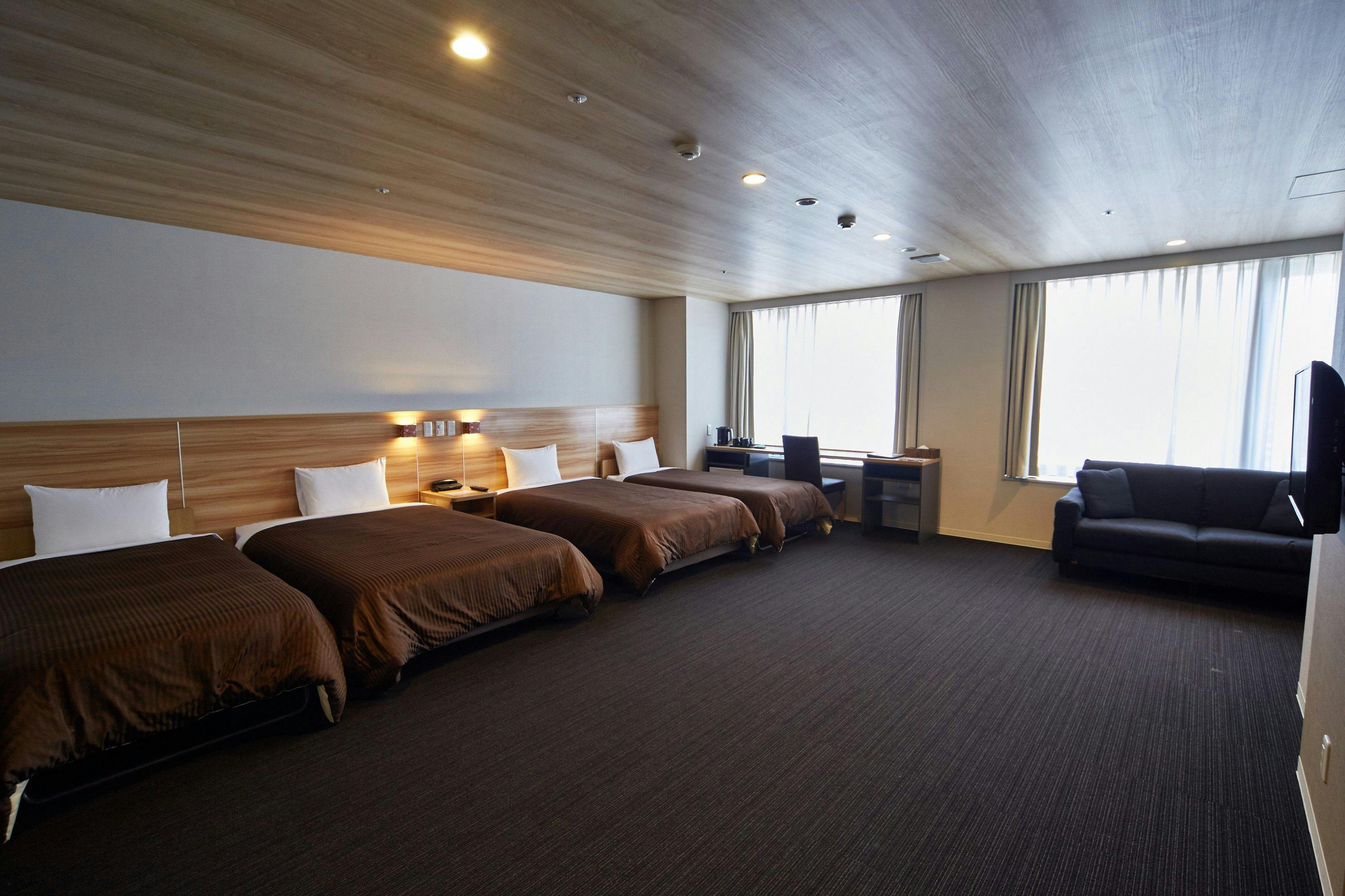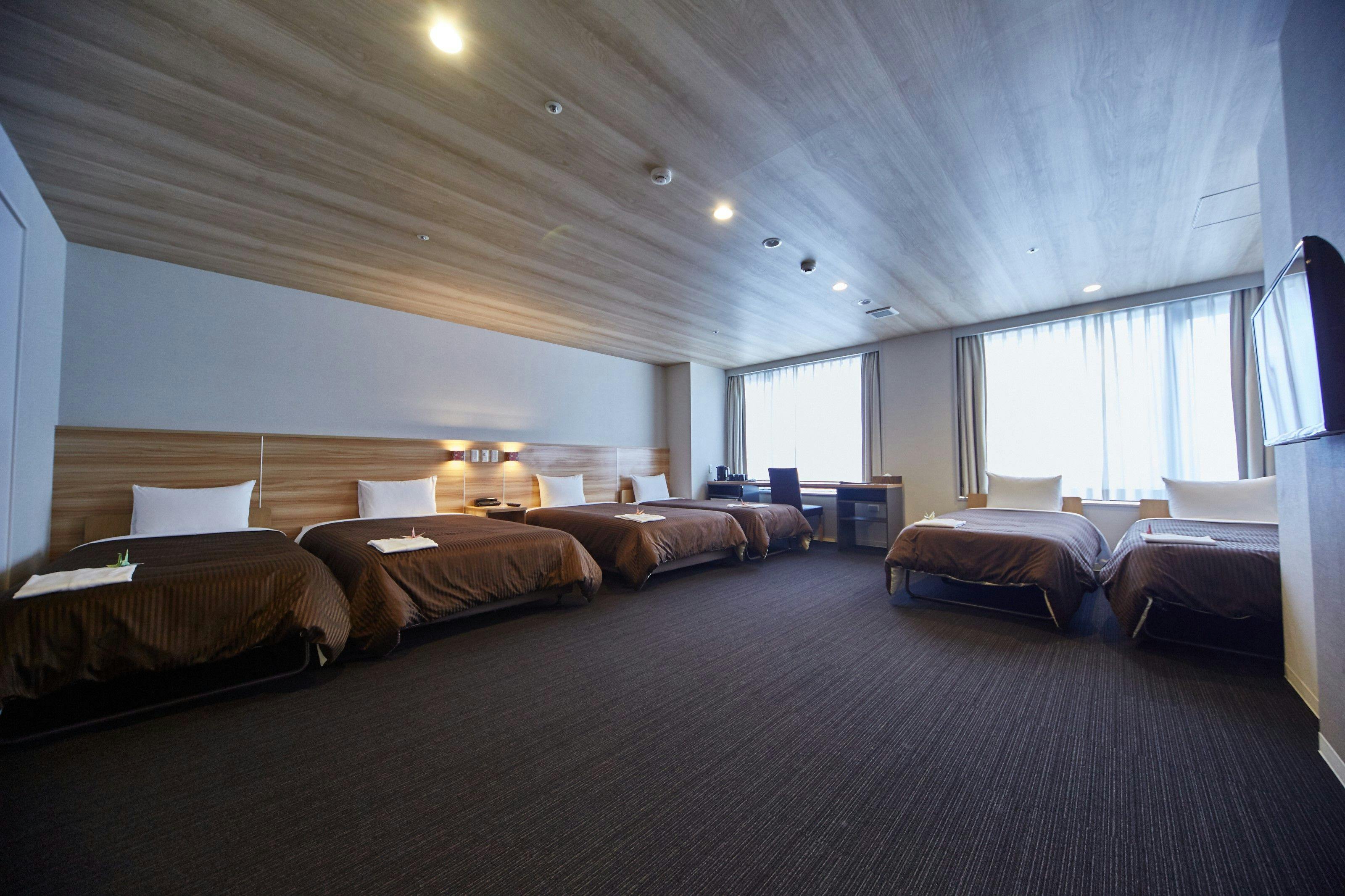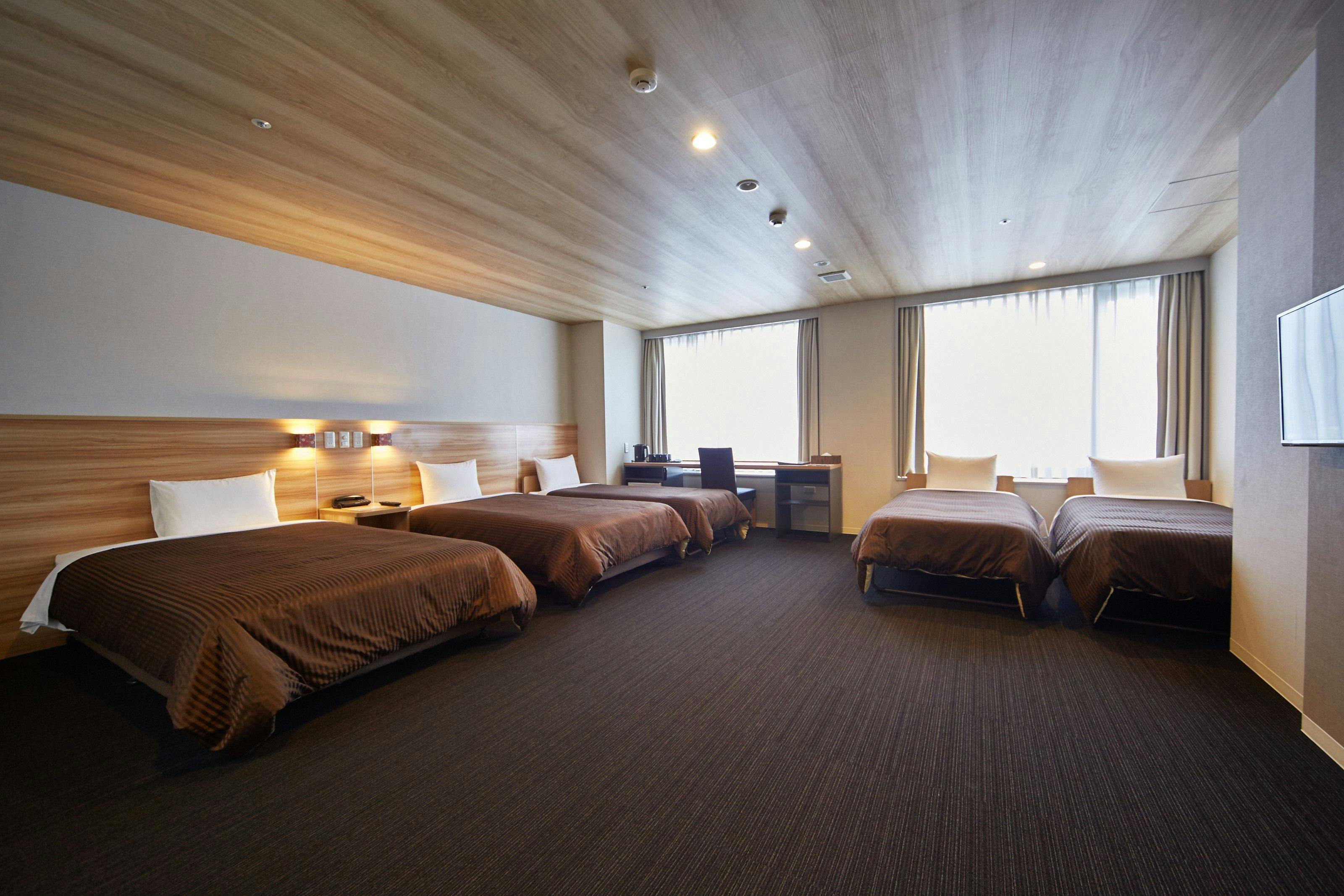 4名様でもごゆっくりお寛ぎ頂けるよう40平米の広々としたお部屋。■客室設備・ベッドサイズ:120×200×2台、エキストラベッド:120×180×2台・冷蔵庫完備(中身は空)・壁掛けテレビ・ドライヤー・電気ケトル■フロントにて貸出(いずれも数に限りがございます)・ズボンプレッサー・消臭スプレー・加湿器・爪切り・体温計