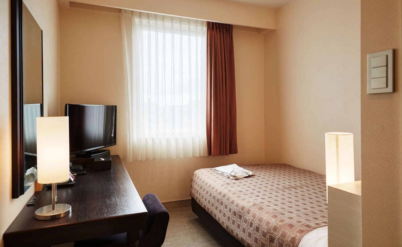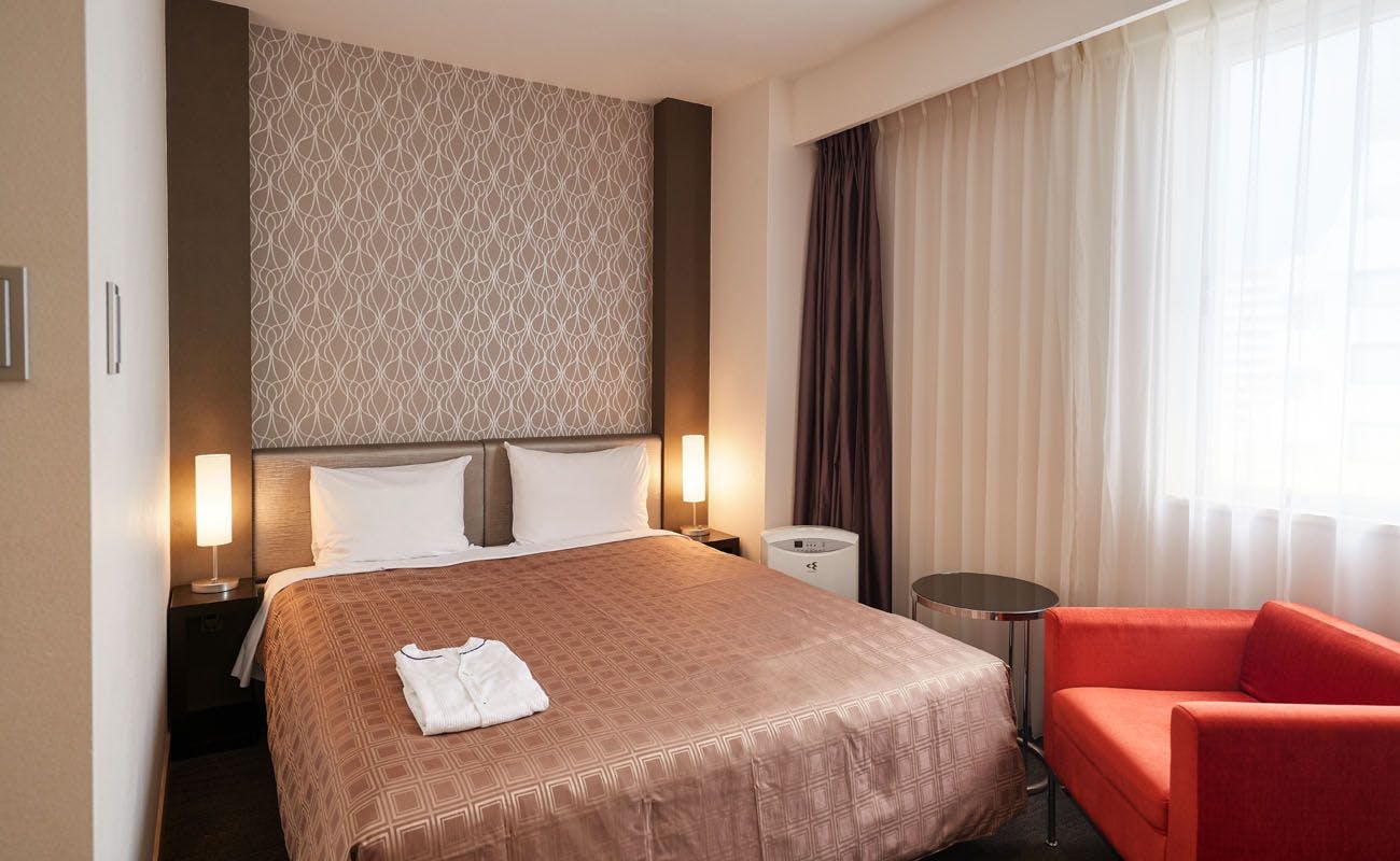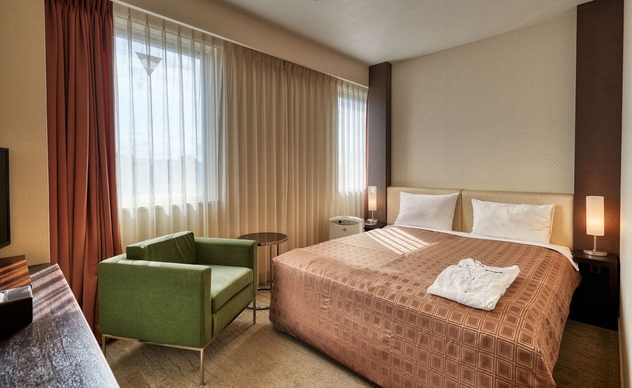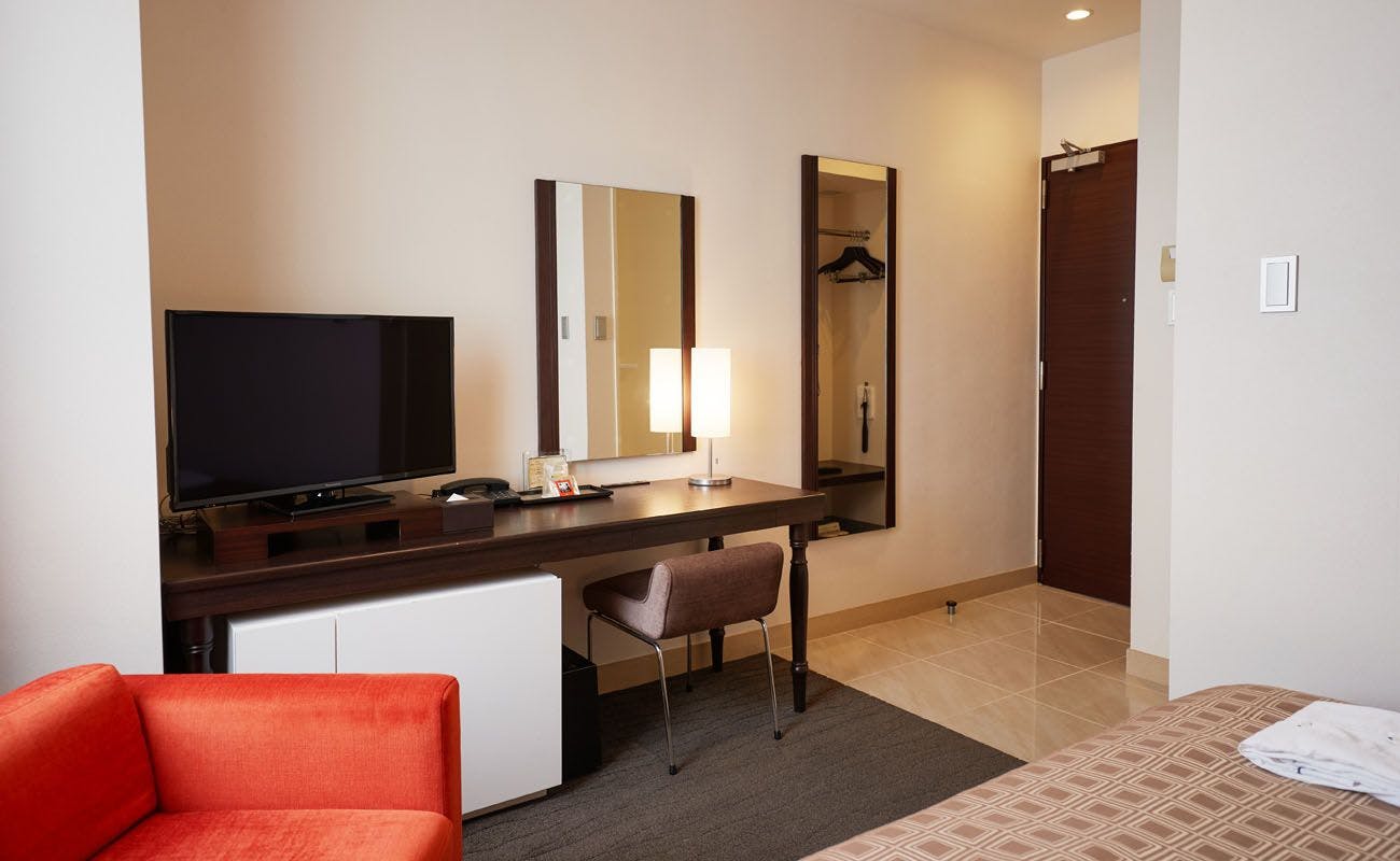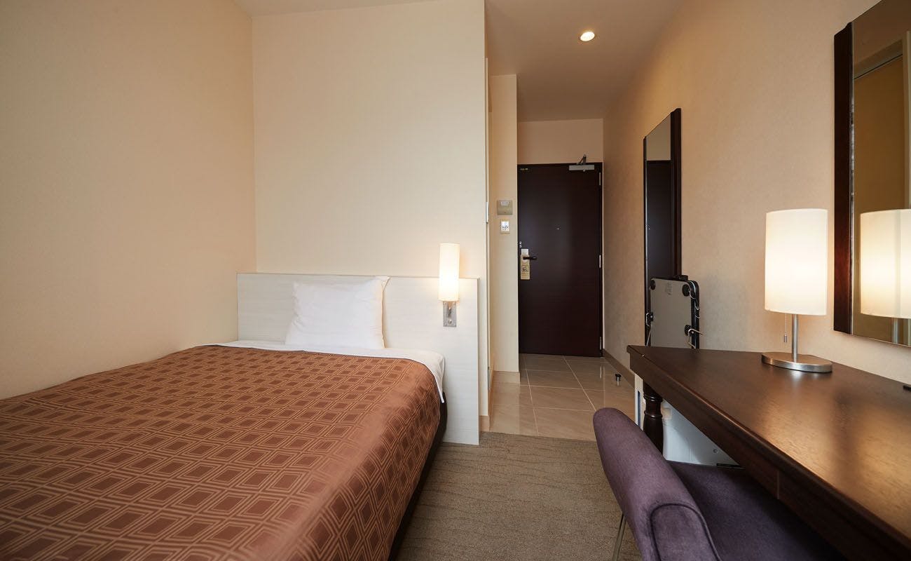 広さ約16平米 ベッド仕様160cm×200cmの客室です。【客室設備】26インチ液晶TV・冷蔵庫(空)・ズボンプレッサー・ドライヤー・電気ケトル・空気清浄機・インターネット接続(無料)・温水シャワートイレ
