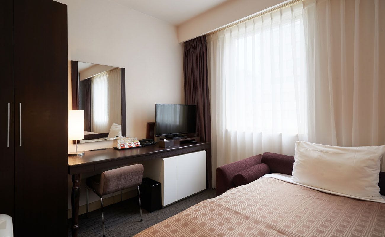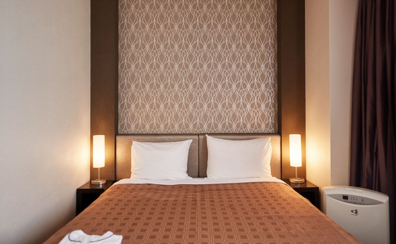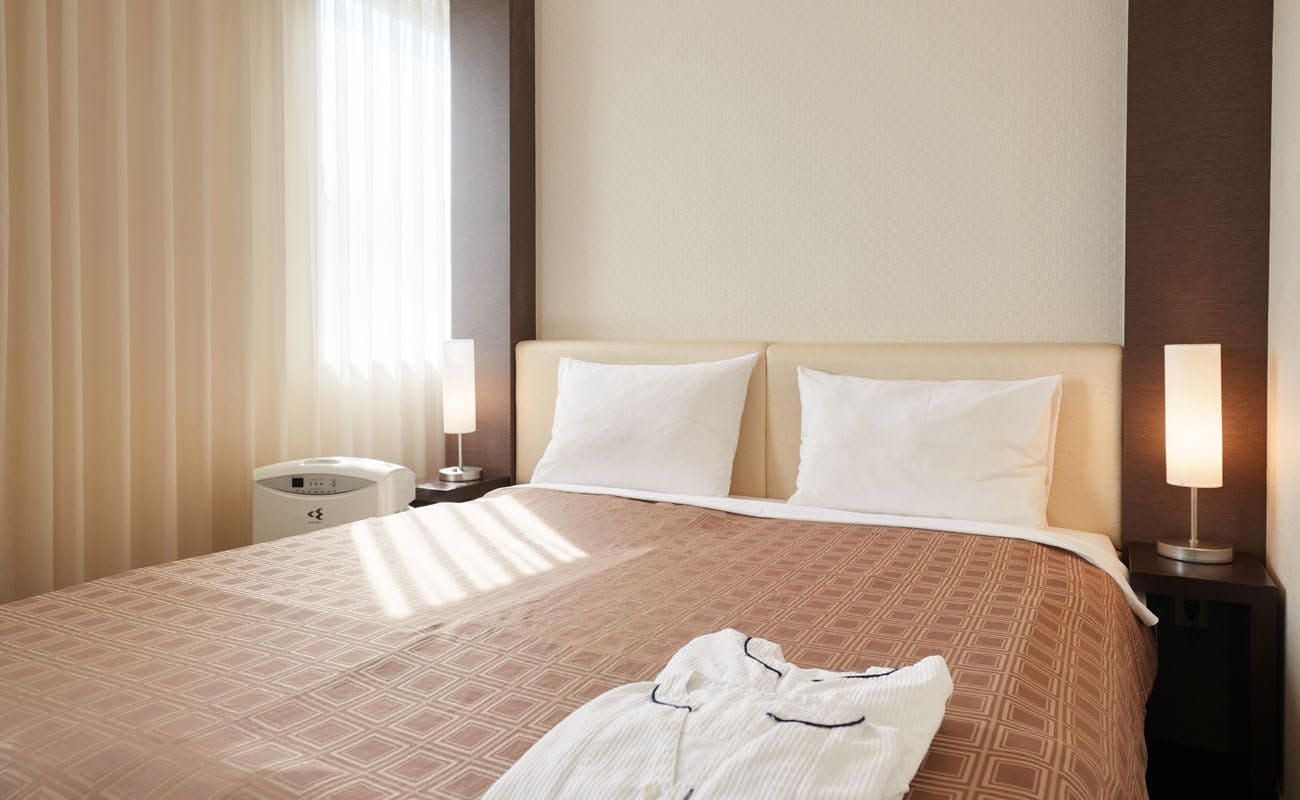 広さ約15.5平米 ベッド仕様160cm×200cmのルーム【客室設備】26インチ液晶TV・冷蔵庫(空)・ズボンプレッサー・ドライヤー・電気ケトル・空気清浄機・インターネット接続(無料)・温水シャワートイレ