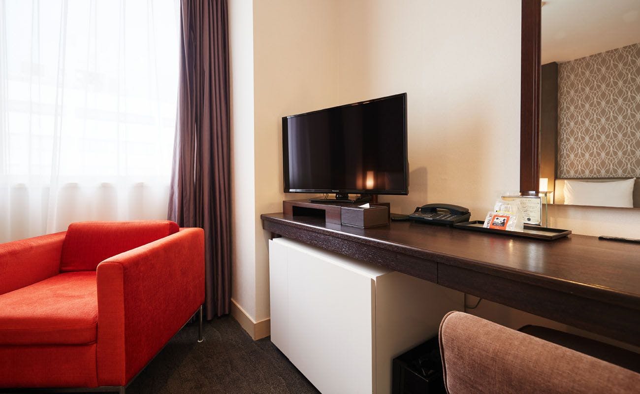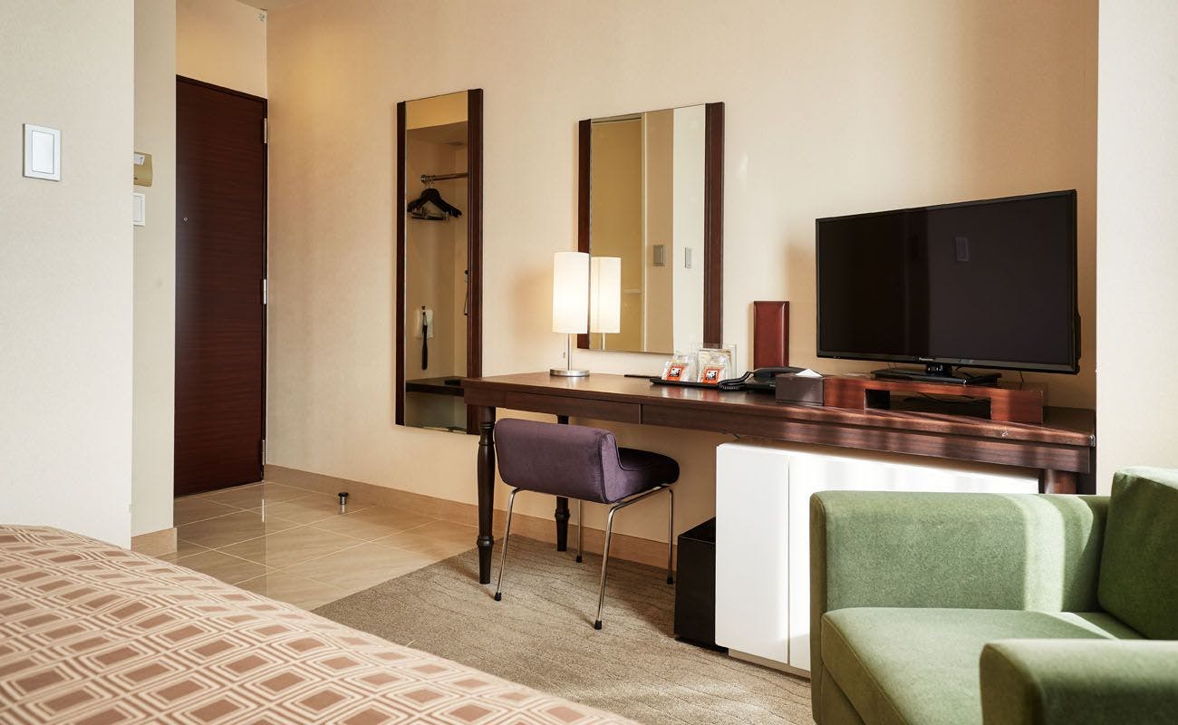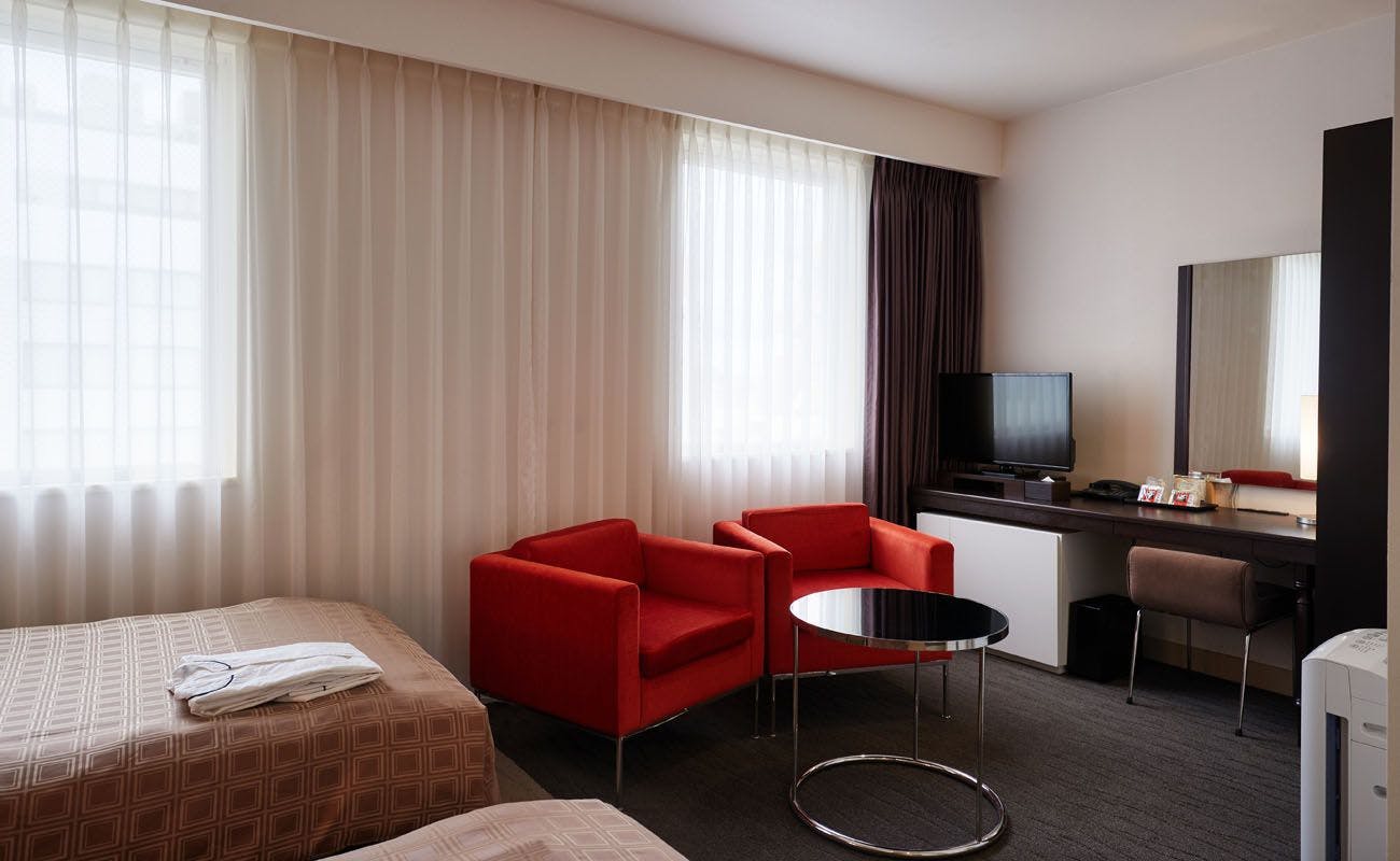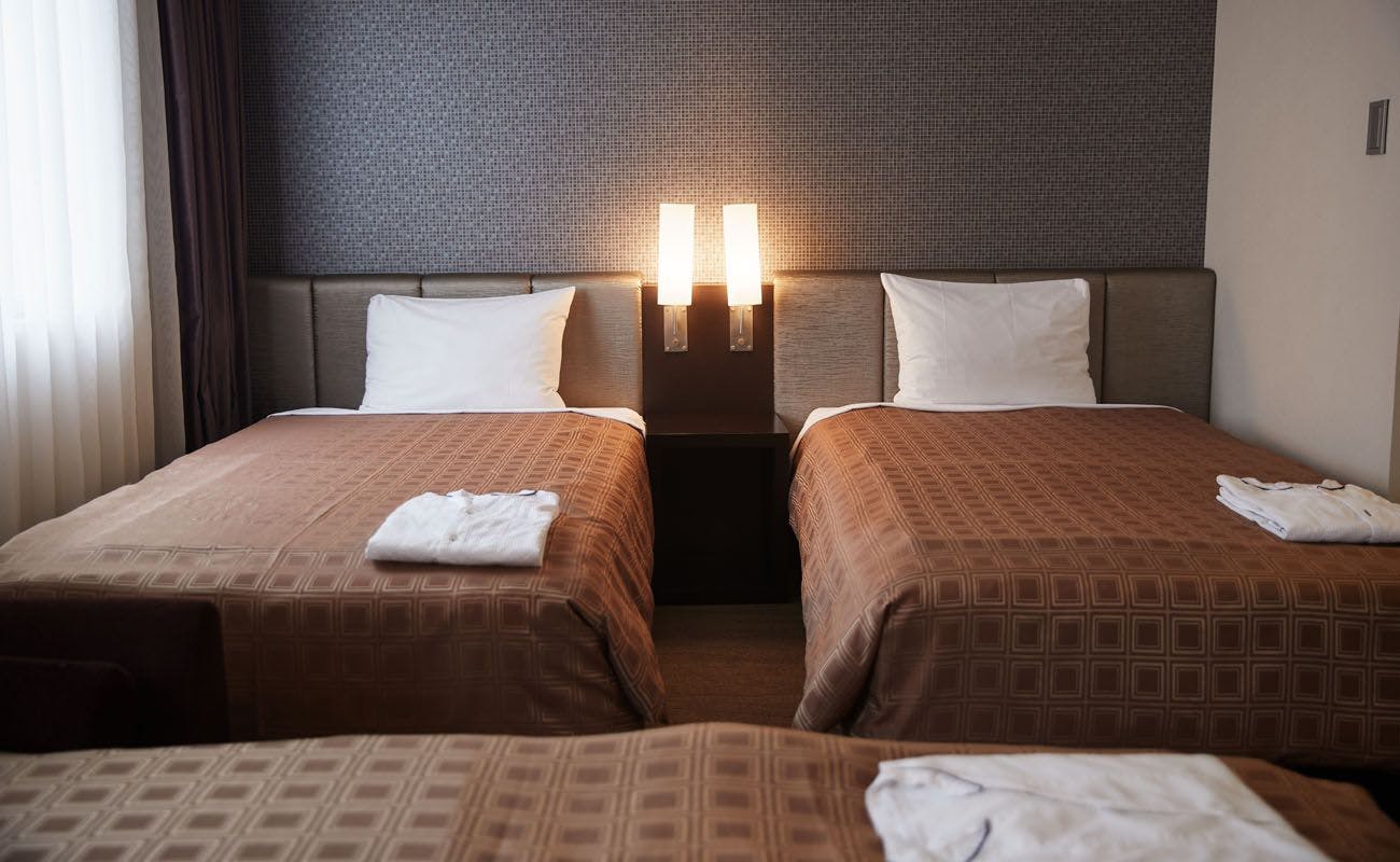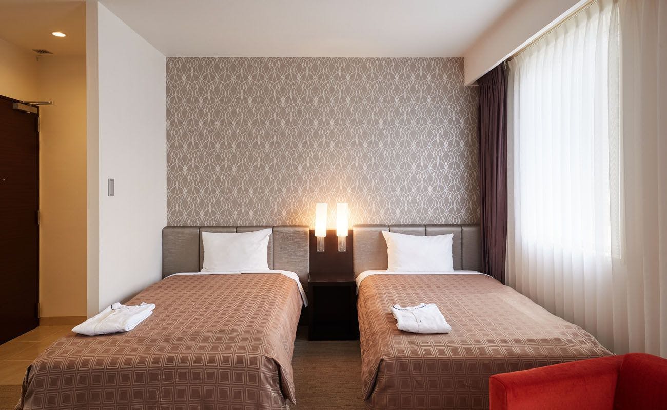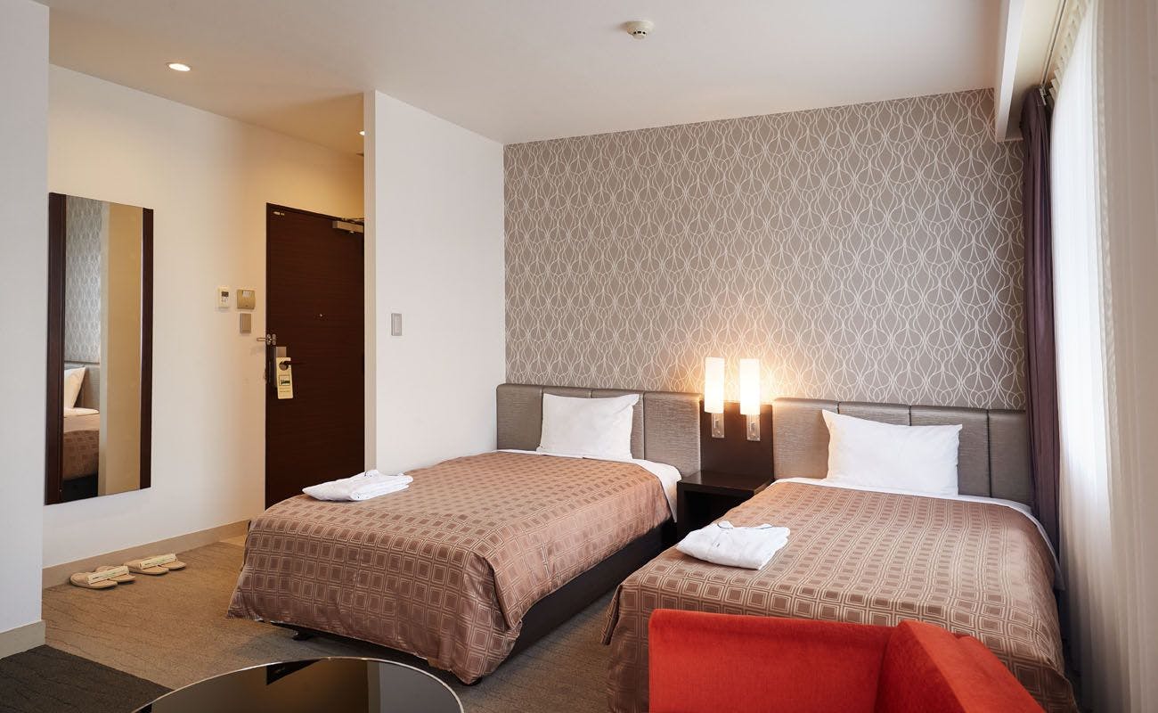広さ約22平米 ベッド仕様110cm×200cm×2台のツインルーム【客室設備】26インチ液晶TV・冷蔵庫(空)・ズボンプレッサー・ドライヤー・電気ケトル・空気清浄機・インターネット接続(無料)・温水シャワートイレ