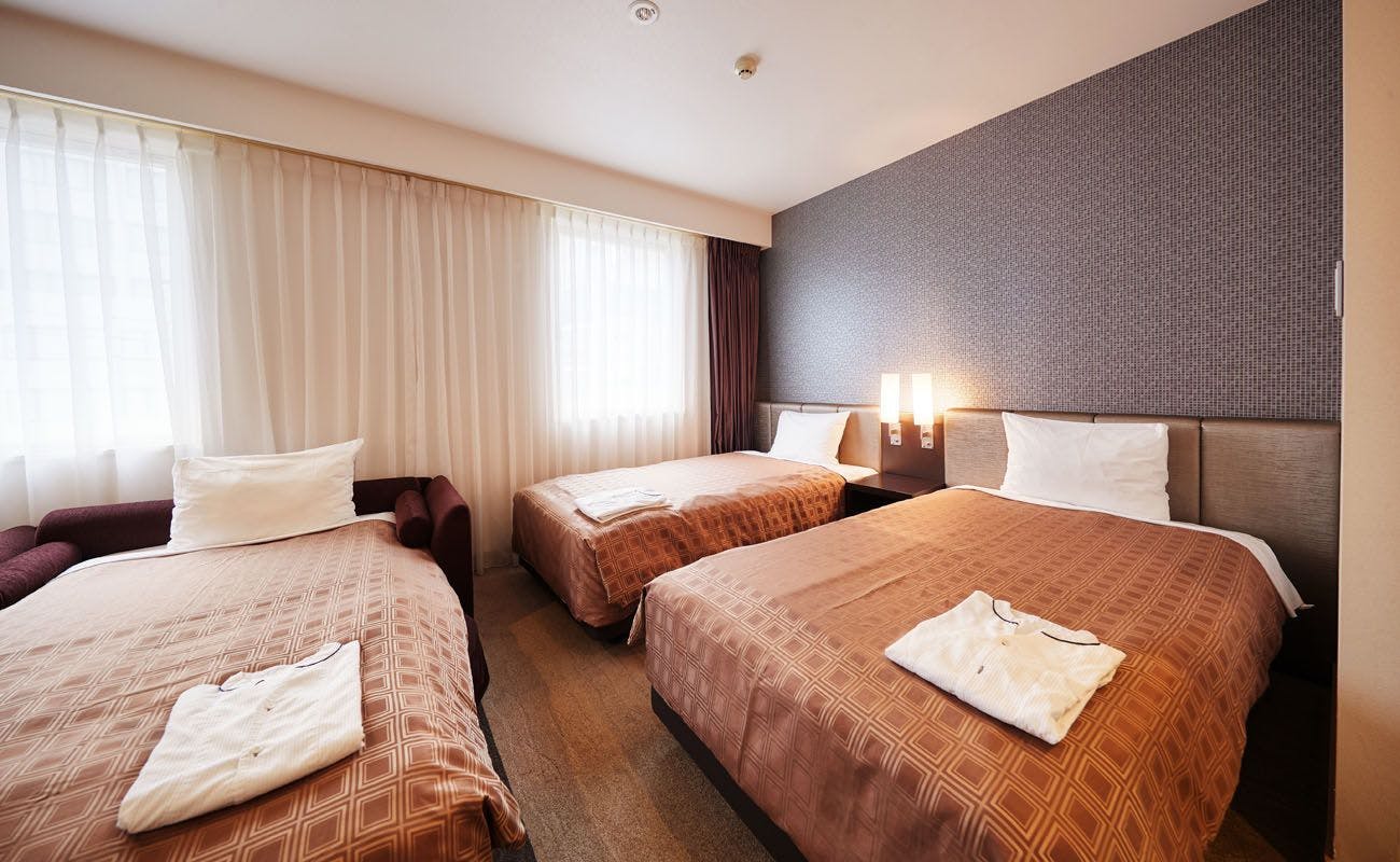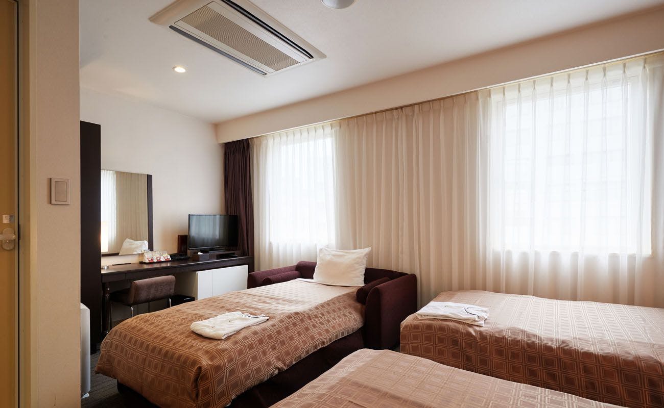 ツインルームにハウザー(ソファーベッド)を追加したトリプルユースとなります。【客室設備】26インチ液晶TV・冷蔵庫(空)・ズボンプレッサー・ドライヤー・電気ケトル・空気清浄機・インターネット接続(無料)・温水シャワートイレ