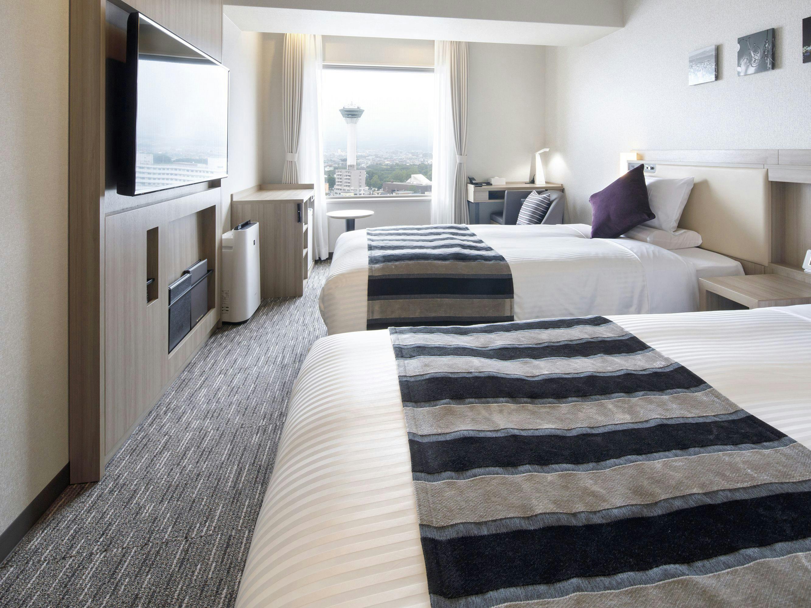 広さ:27平米 ベッド幅:120cm×2台 3名様でご利用の場合エキストラベッド×1台追加市電「五稜郭公園前」から徒歩1分全室WiFi完備全室加湿器付空気清浄機完備【小学生まで添い寝無料】大人3名 小学生(添い寝)2名まで宿泊可。お子様がベッド1台ご利用の場合は通常料金がかかります。「大人1名」としてご予約ください。