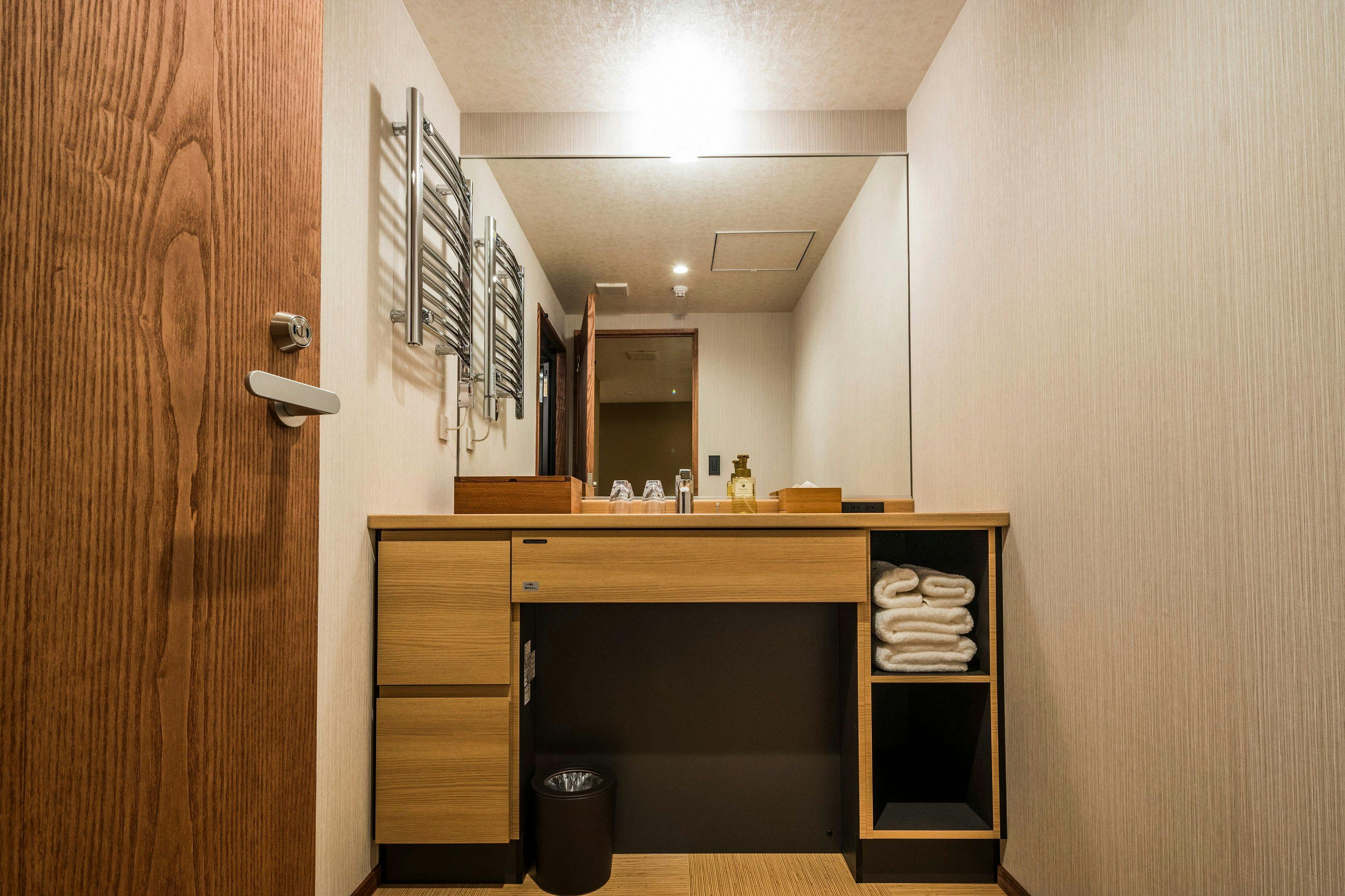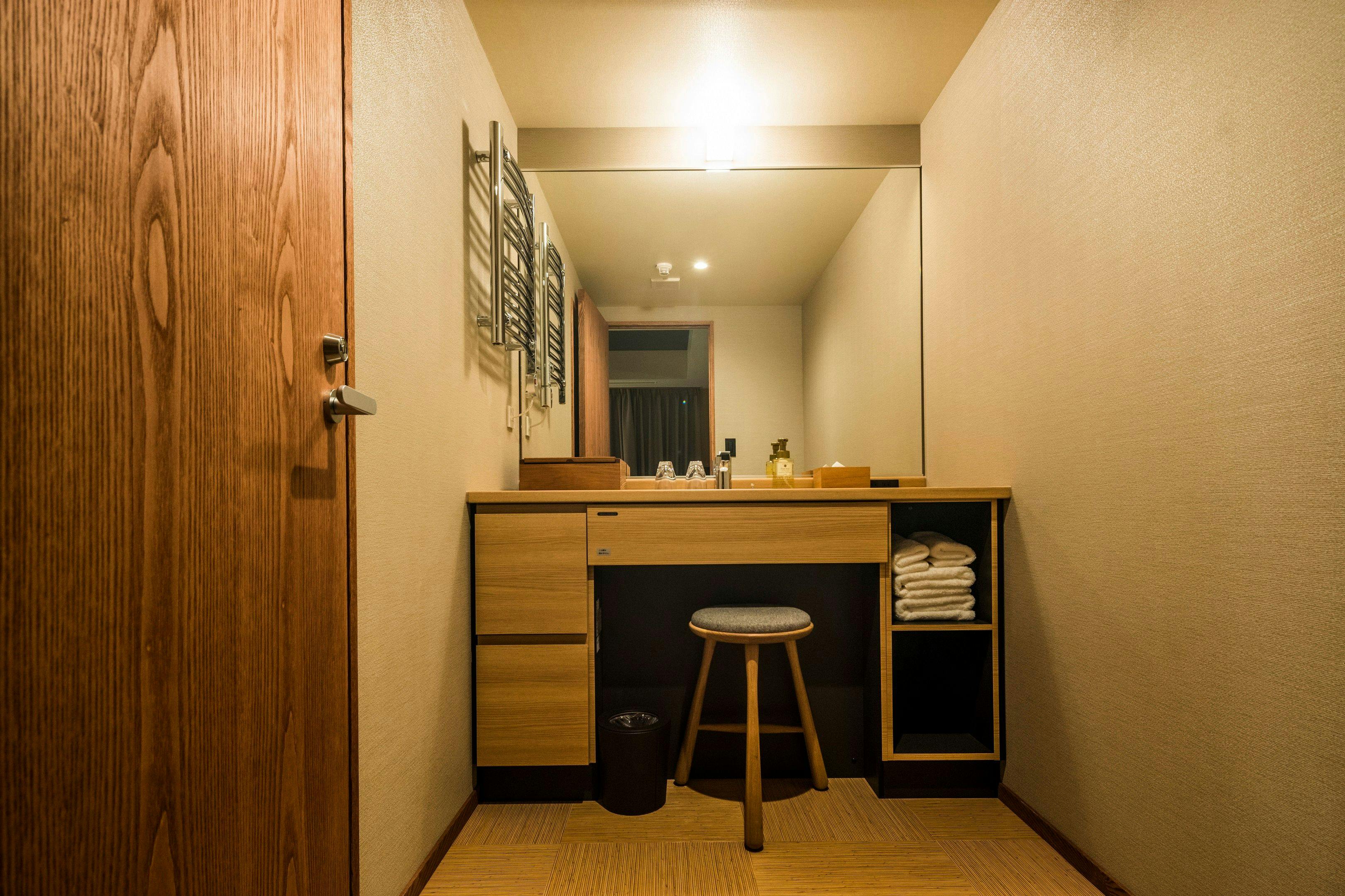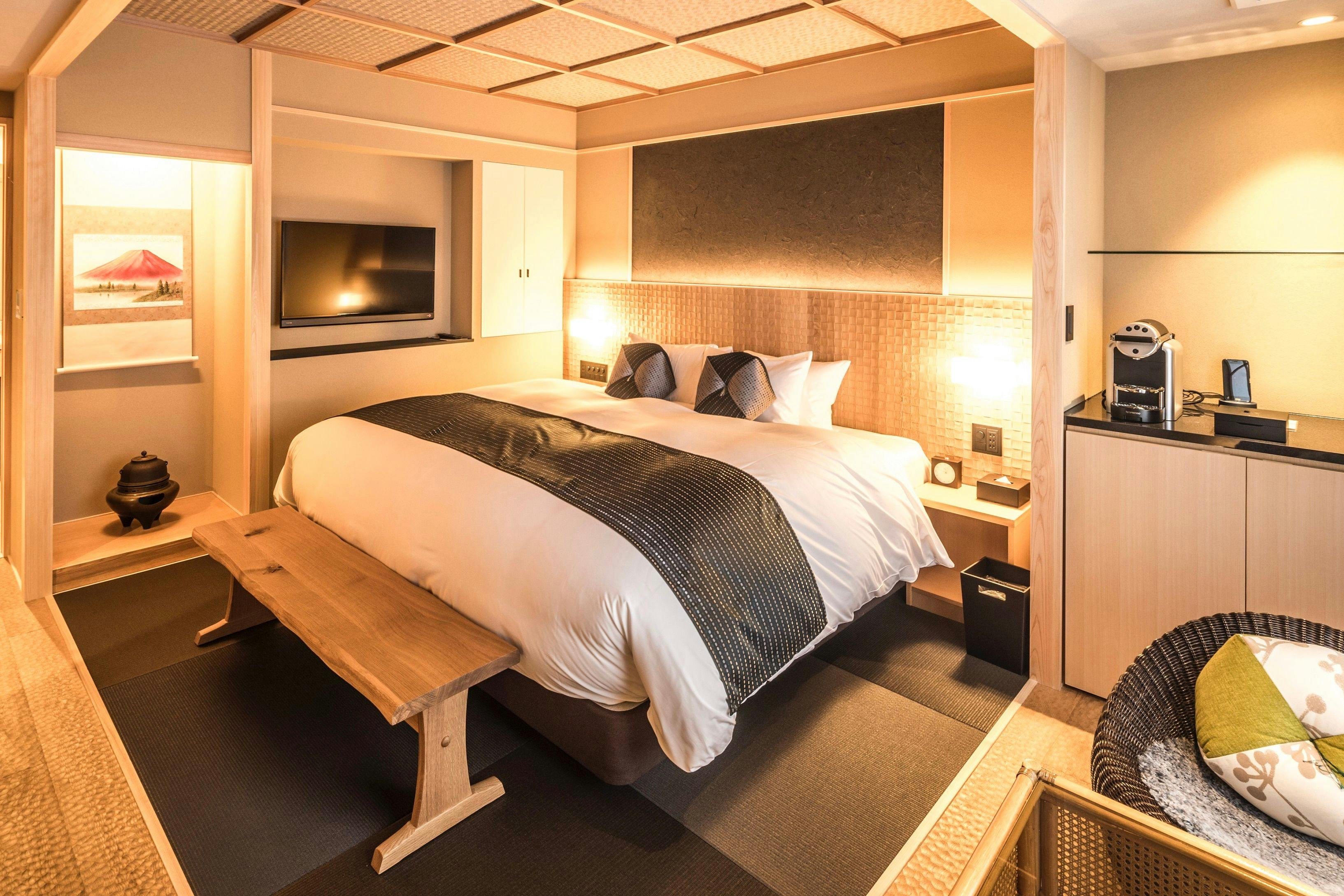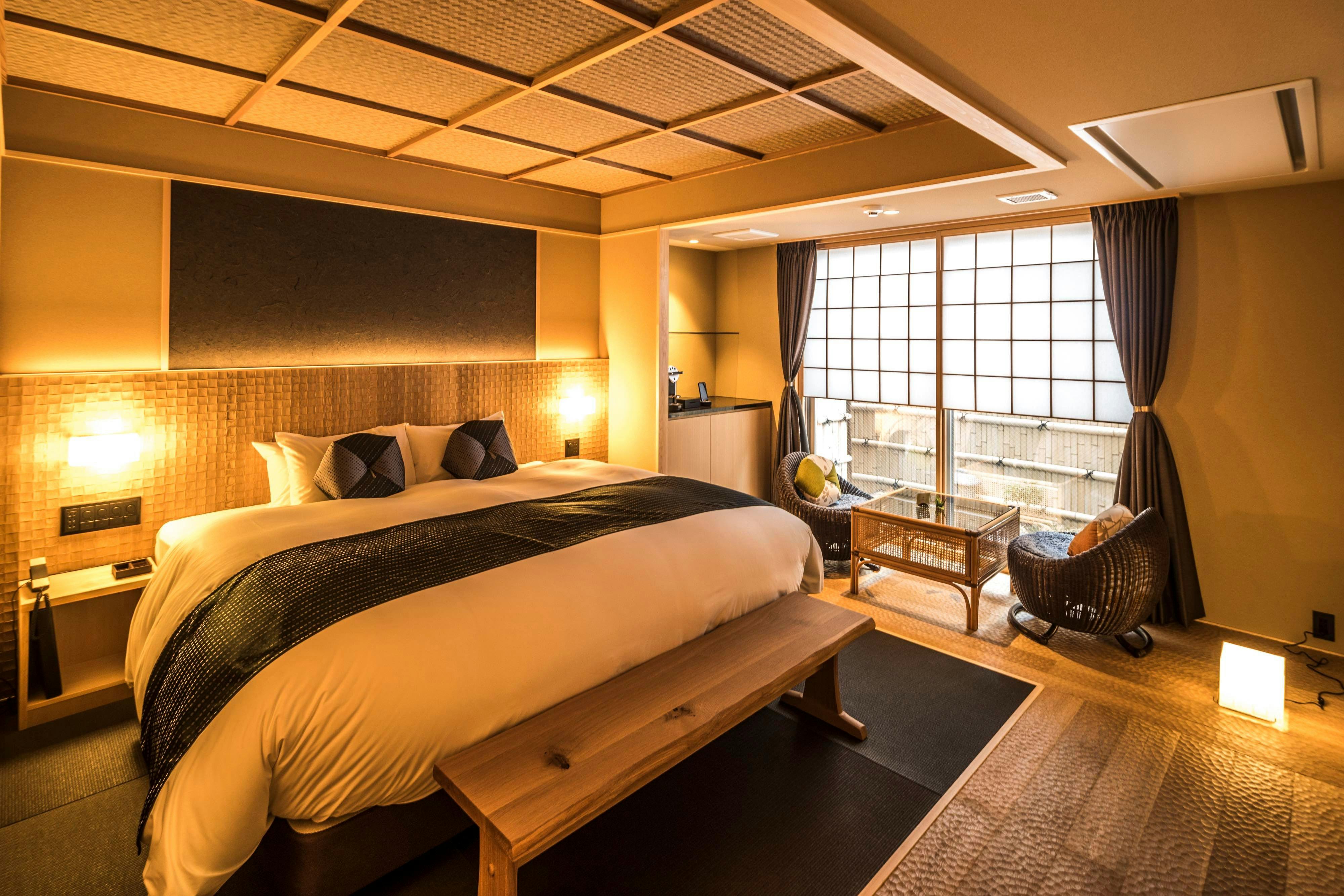 京都らしい木の温もりを活かした、和モダンな上質な空間。ゆとりある超キングサイズベッドや38平米の広めの室内は、ゆったり過ごせる古都での癒しの非日常体験を演出します。幅200×丈200センチのシモンズ社製キングサイズベッドを完備。お二人様でもごゆっくりお寛ぎ頂けます。嬉しい!バス・トイレ完全セパレートネスプレッソマシーン完備食後などにお楽しみくださいませ。