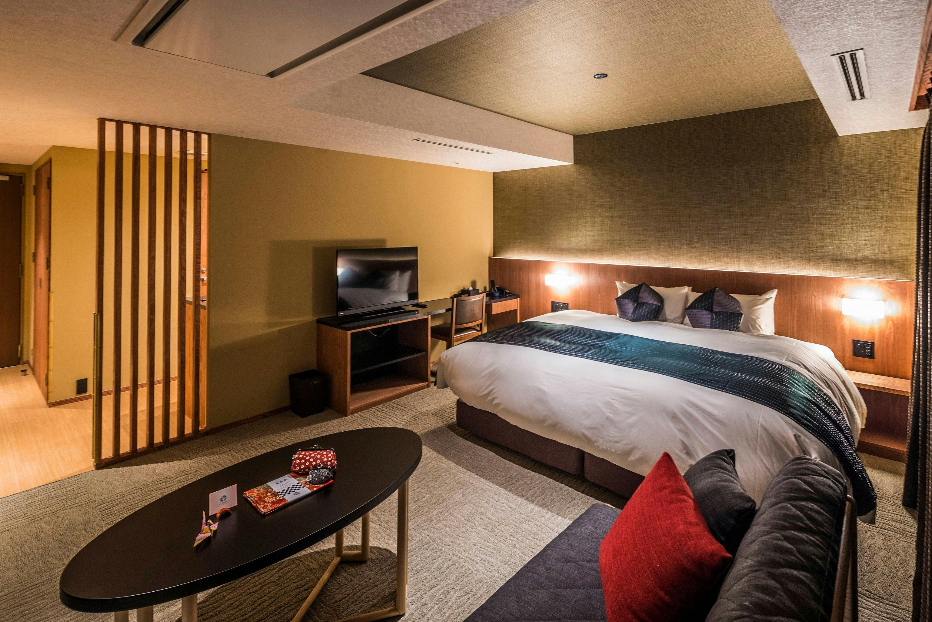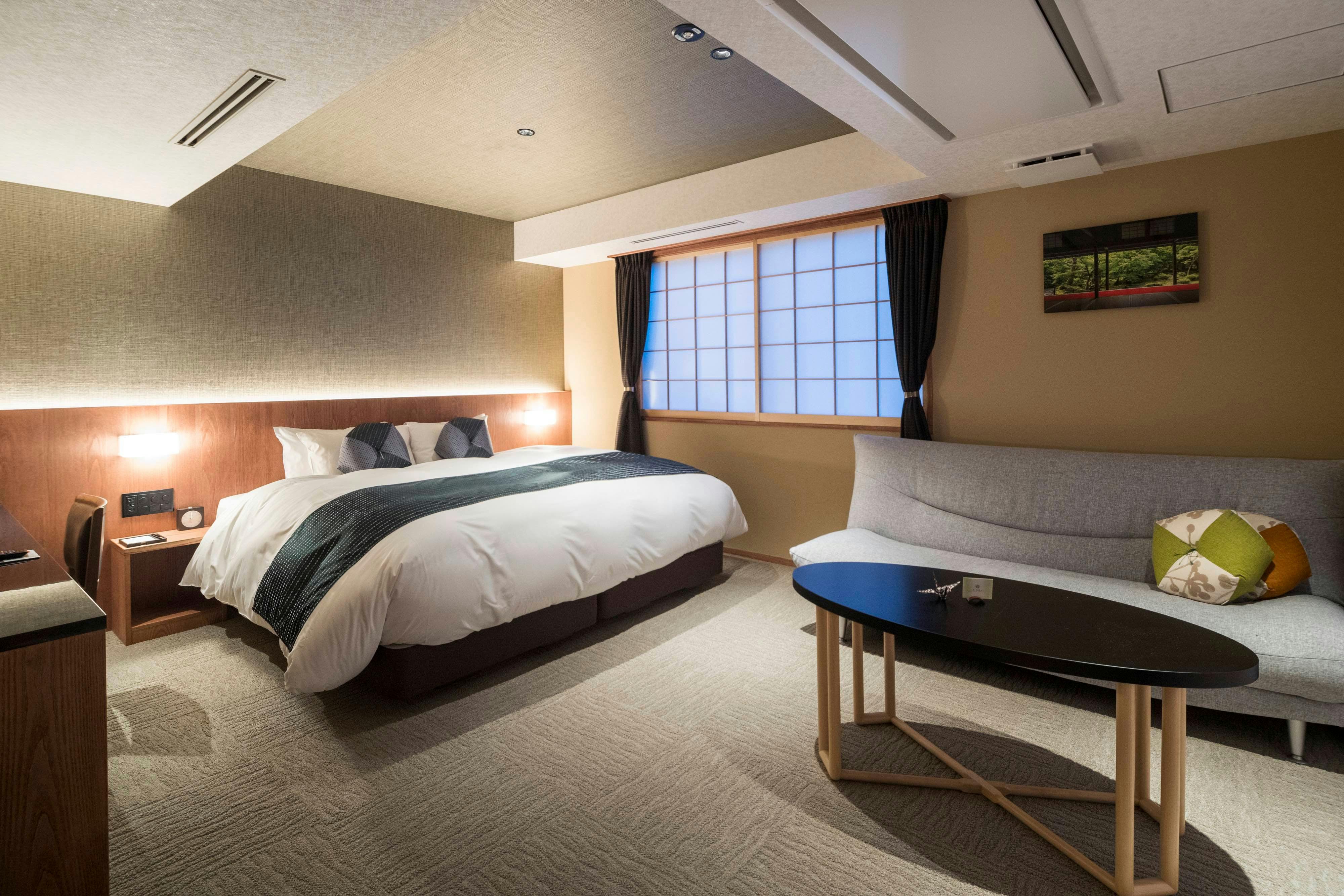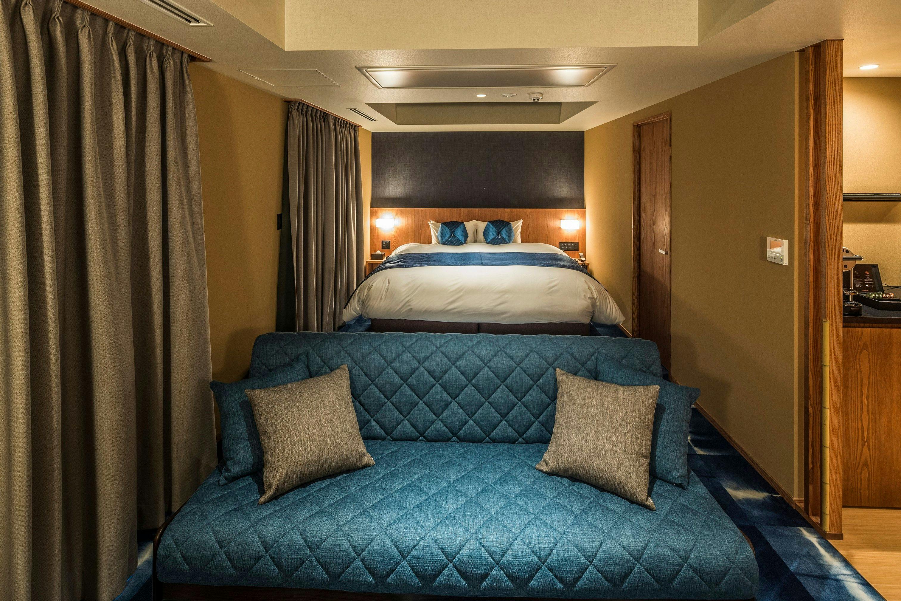 ブルーを基調とした和と洋が融合した上質な空間。ゆとりある超キングサイズベッドや38平米の広めの室内は、ゆったり過ごせる古都での癒しの非日常体験を演出します。幅200×丈200センチのシモンズ社製キングサイズベッドを完備。お二人様でもごゆっくりお寛ぎ頂けます。嬉しい!バス・トイレ完全セパレートネスプレッソマシーン完備食後などにお楽しみくださいませ。