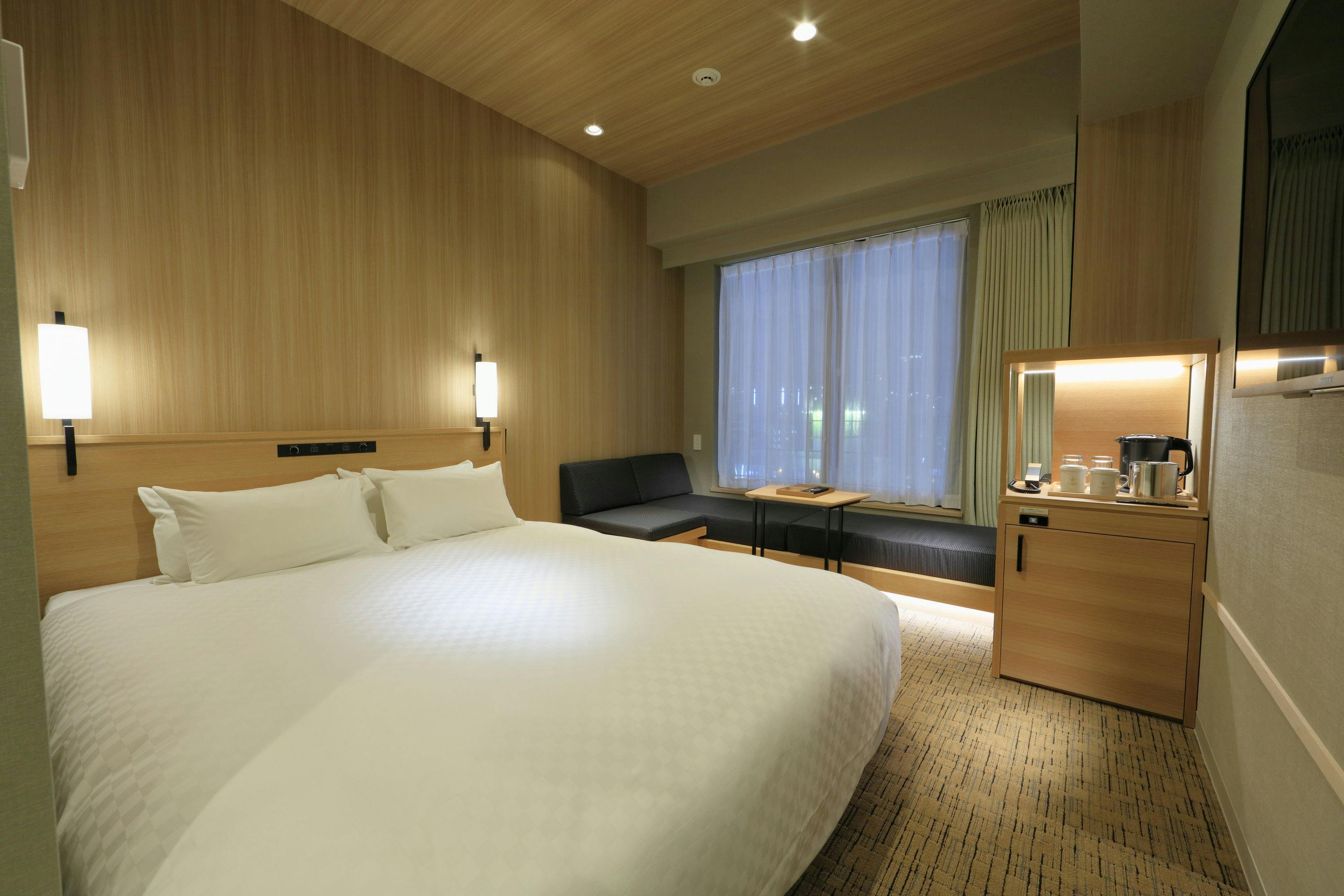 全室禁煙、ベッド幅1600mm、無料WiFi、こあがりソファ、ミニデスク、テレビ、ユニットバス、館内着、スリッパ、ミネラルウォーター