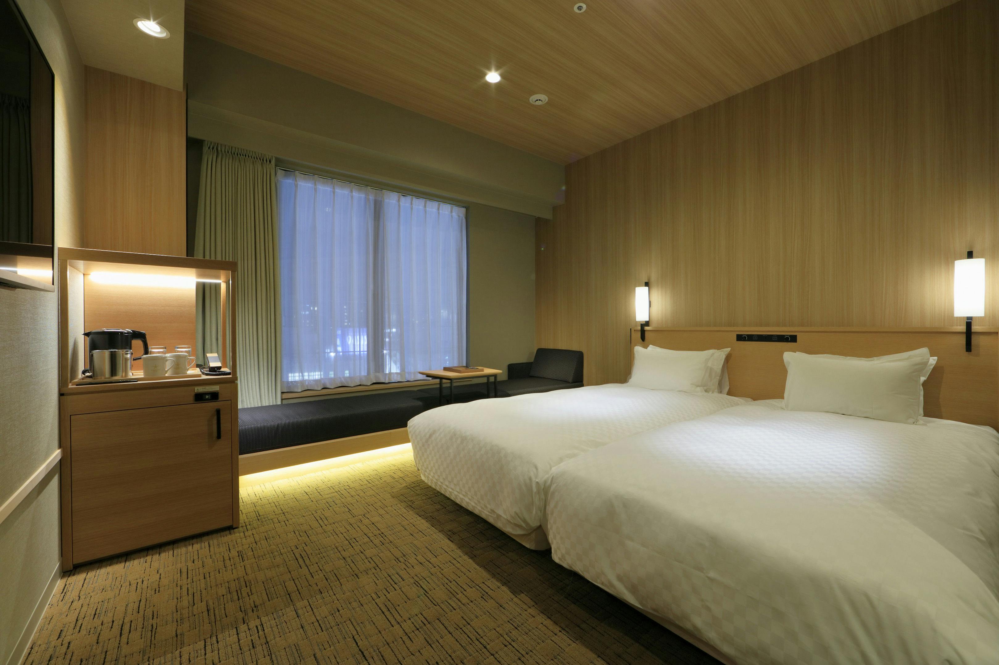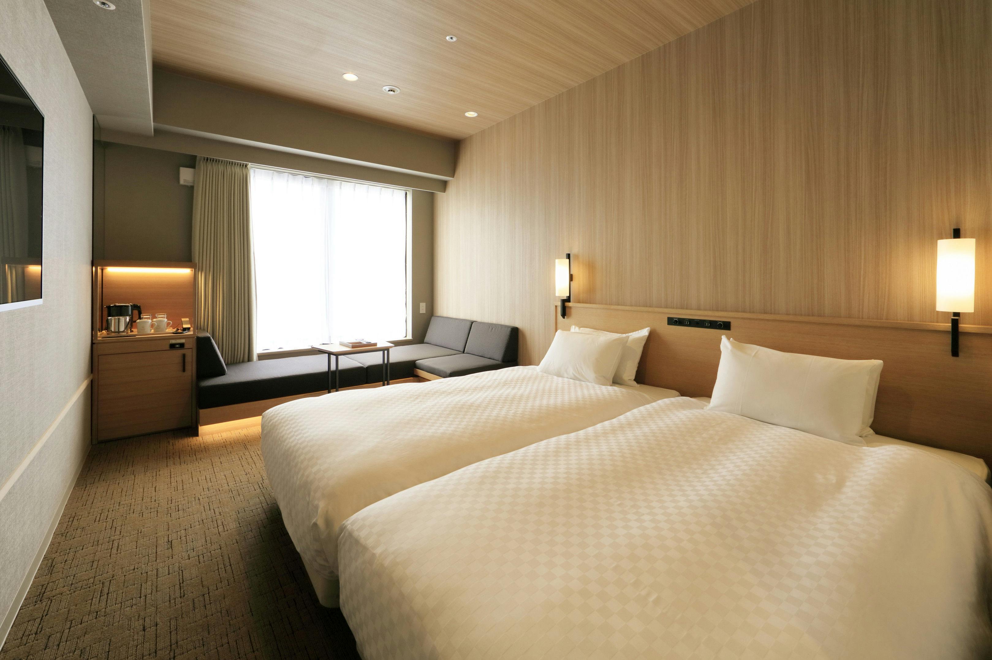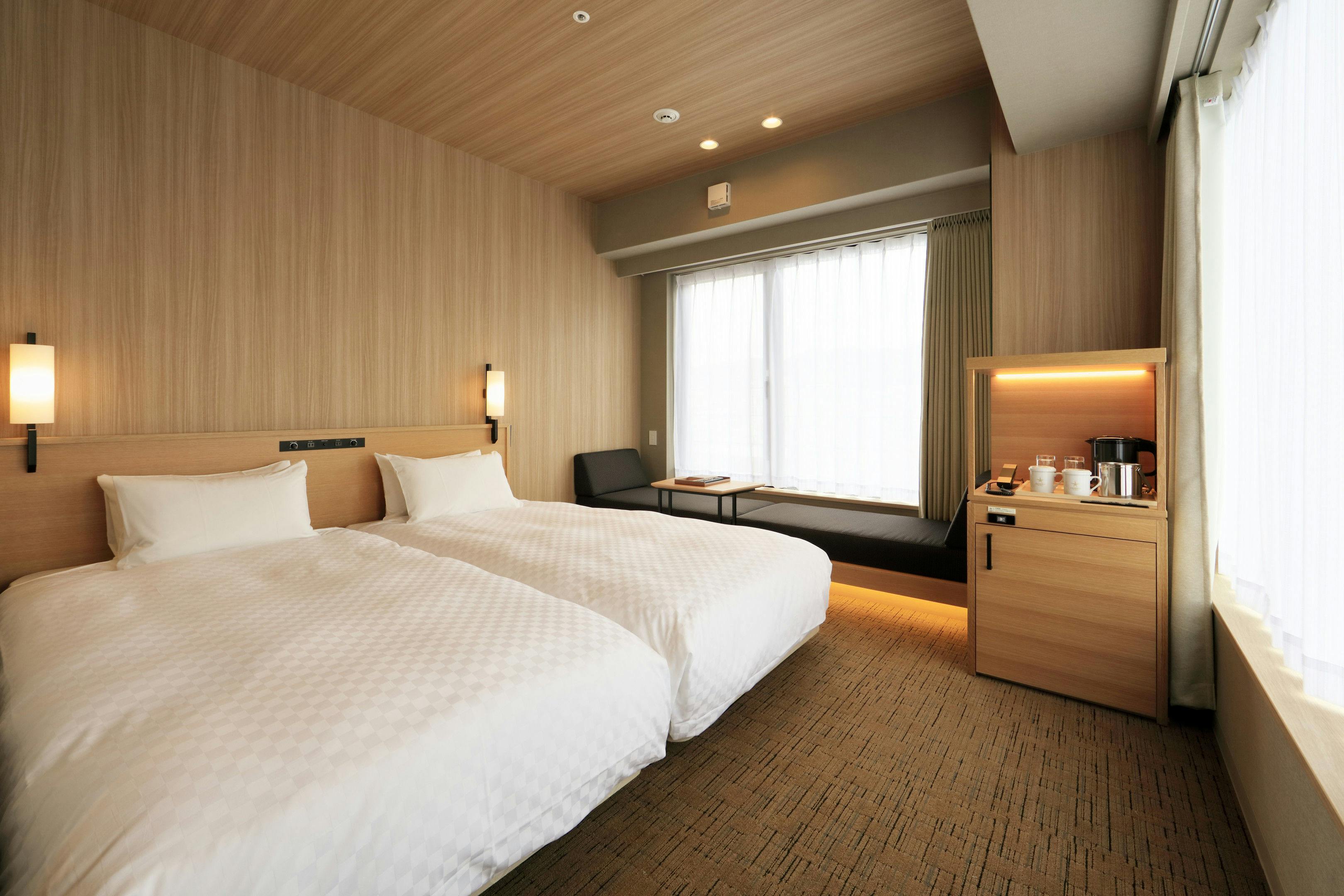 全室禁煙、ベッド幅1100mm×2台、無料WiFi、こあがりソファ、ミニデスク、テレビ、ユニットバス、館内着、スリッパ、ミネラルウォーター大人3名様でご利用の場合、こあがりソファ(幅80cm)をエキストラベッドとしてご使用いただきます