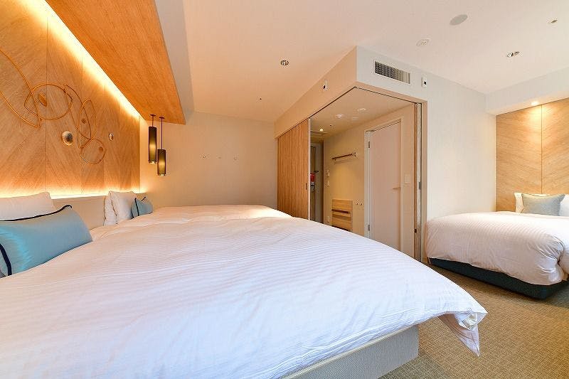 ■客室広さ 27平米■幅140cmのセミダブルベッド2台と90cmのソファベッド1台設置■セミダブルベッドにエアウィーヴマットレスを導入■Wi-Fi・有線LAN完備■加湿機能付き空気清浄機完備■チェックイン14:00、チェックアウト11:00の最長21時間ステイ