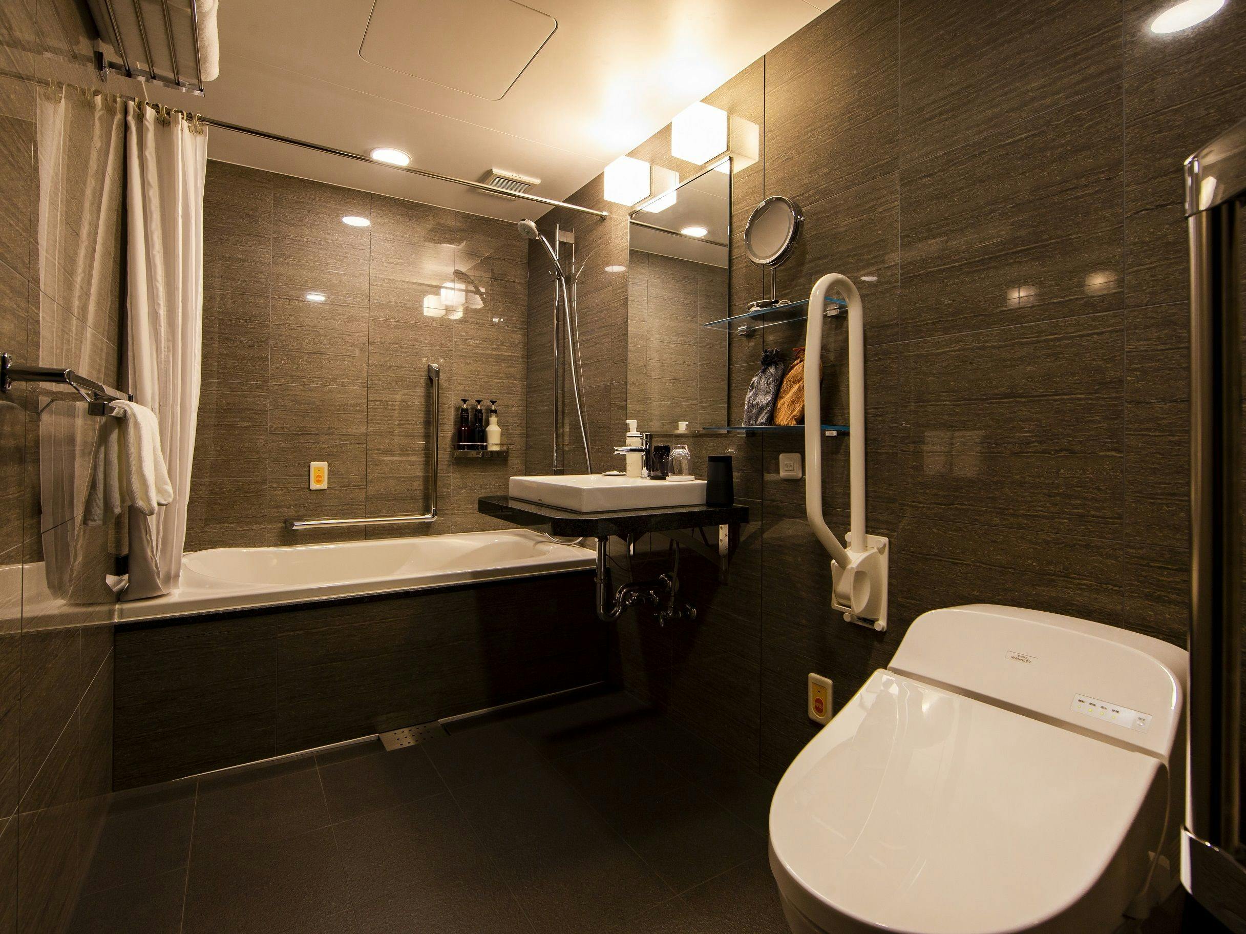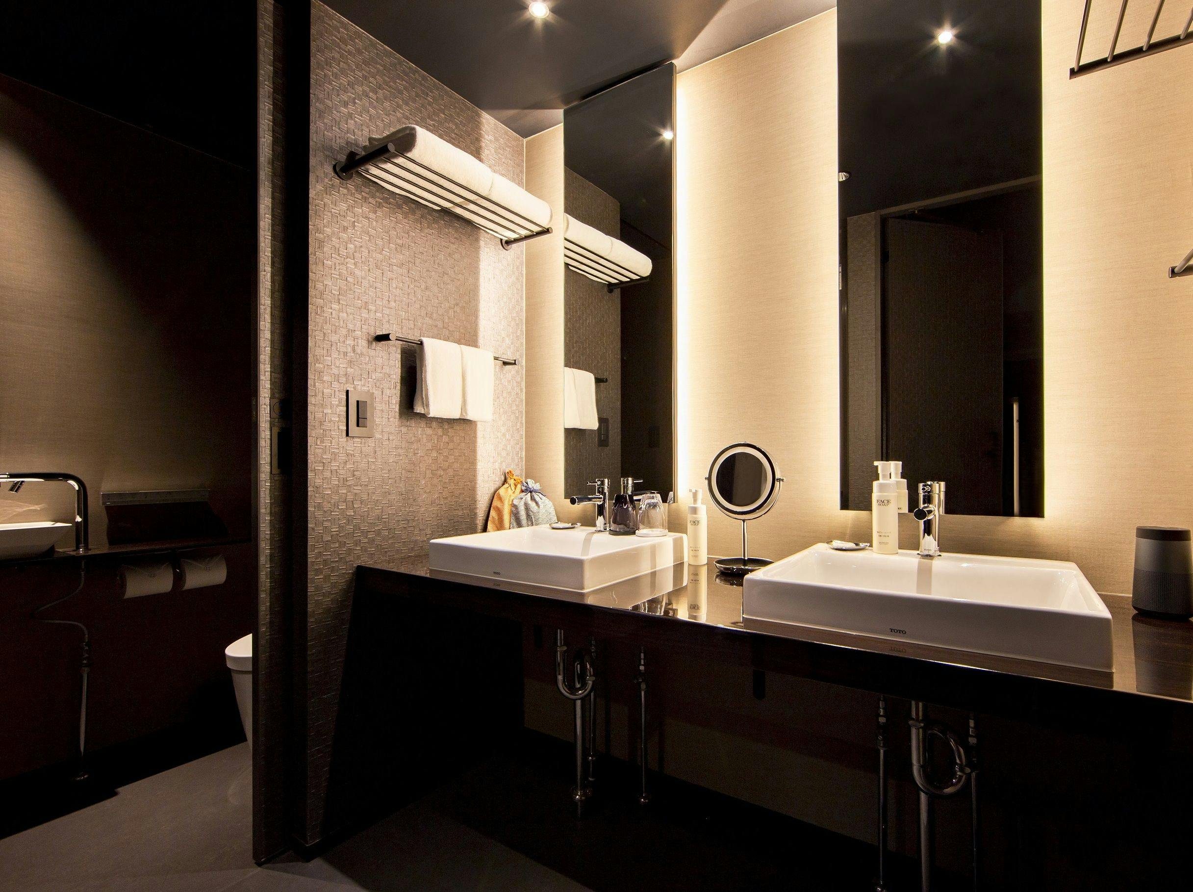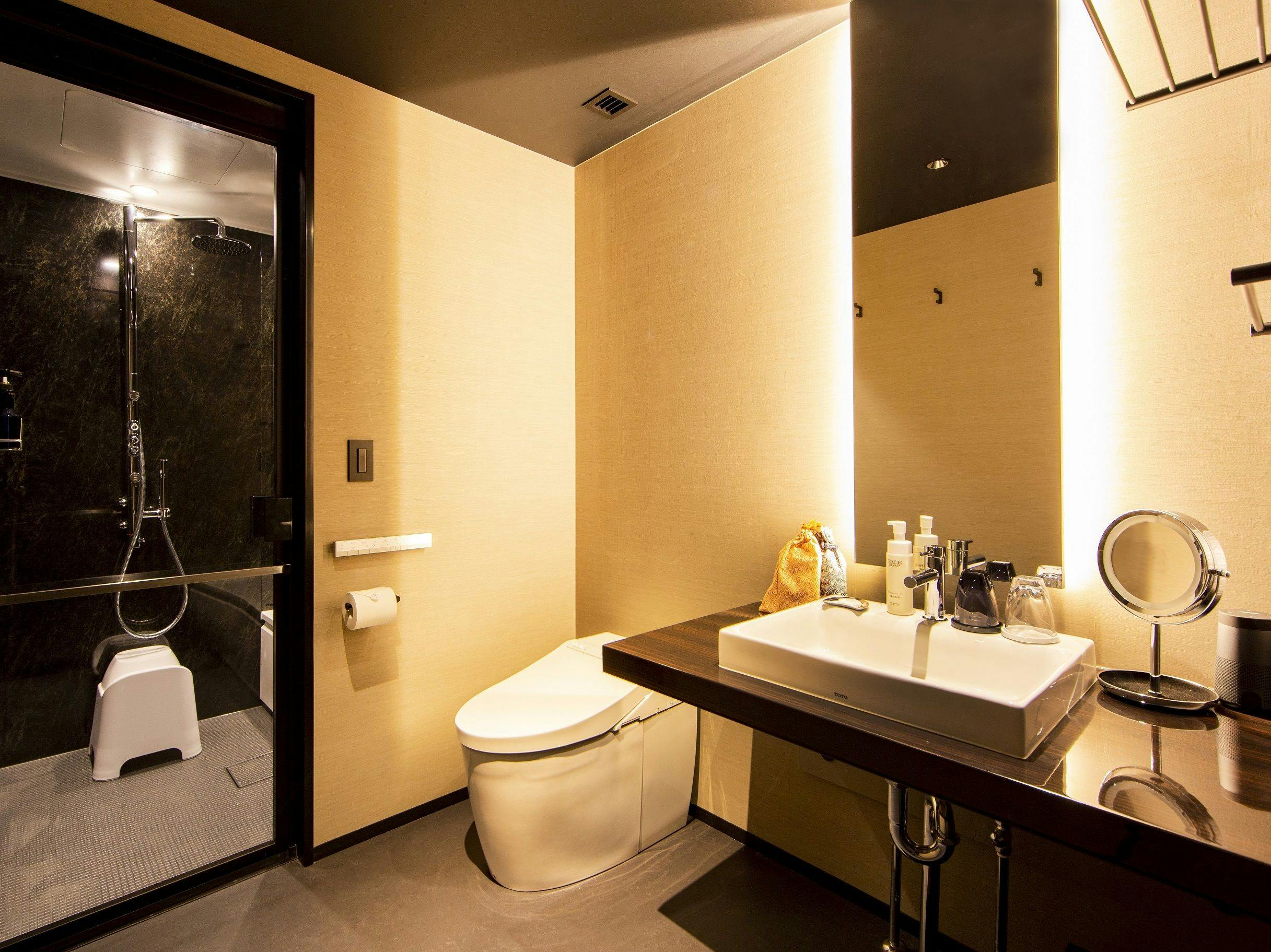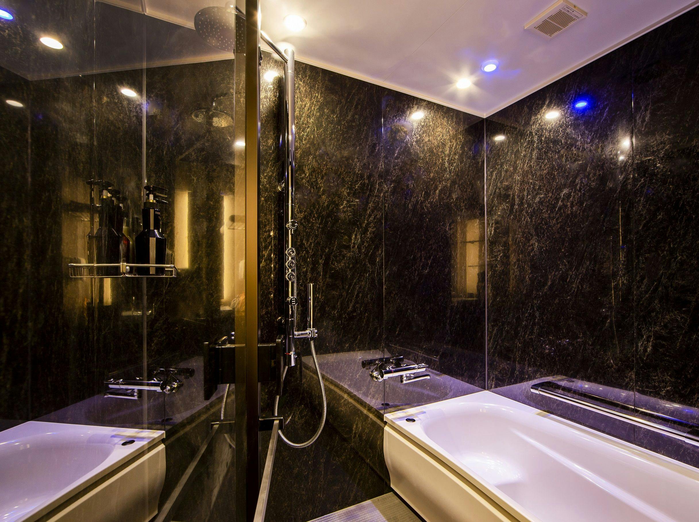 プロスタイル旅館 横浜馬車道を象徴するスイートルームです。ベッドルームとリビングに分かれリビングスペースには大きなソファとテーブルを設置し大人4名様でも十分な広さと独立したパウダールーム、バスルームにレインシャワーも完備。広々とした浴槽はご家族のご利用でもゆったりとご利用頂けます。