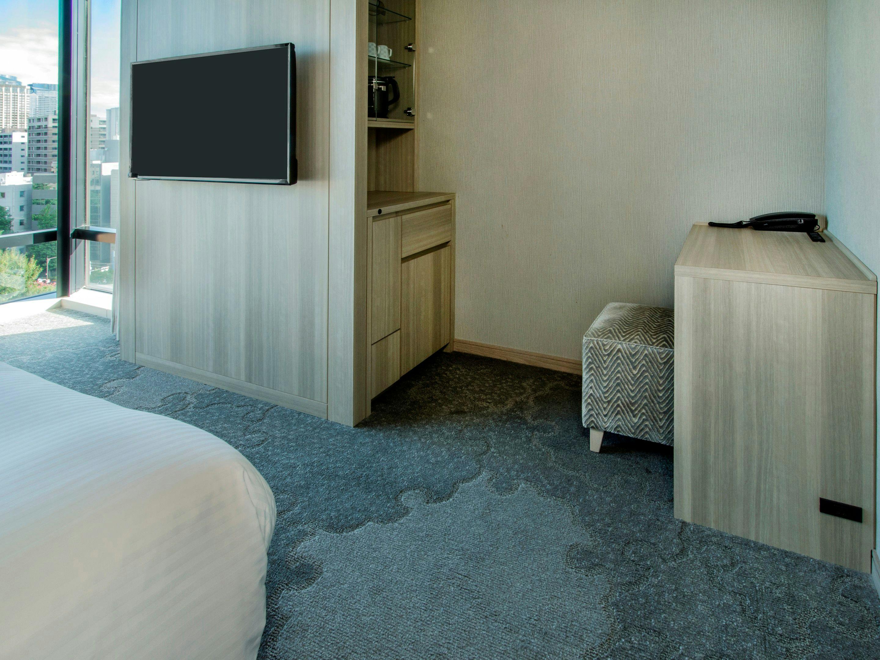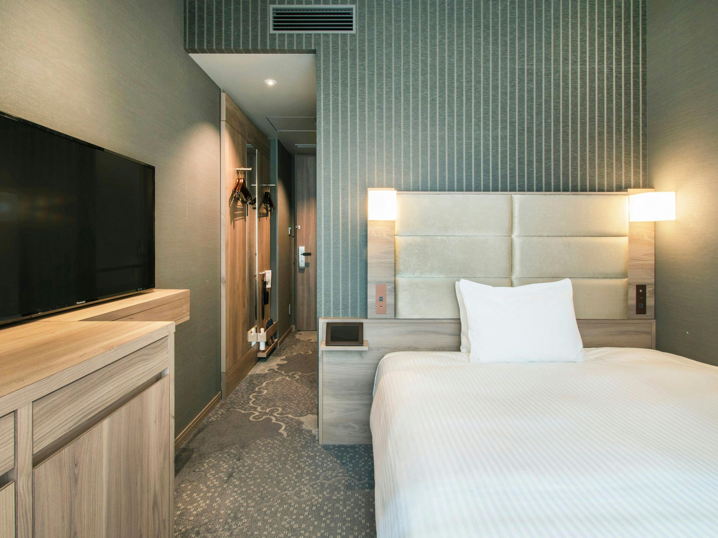 幅160cmまたは180cmの広々ダブルベッドでゆったりとお休みいただけます。