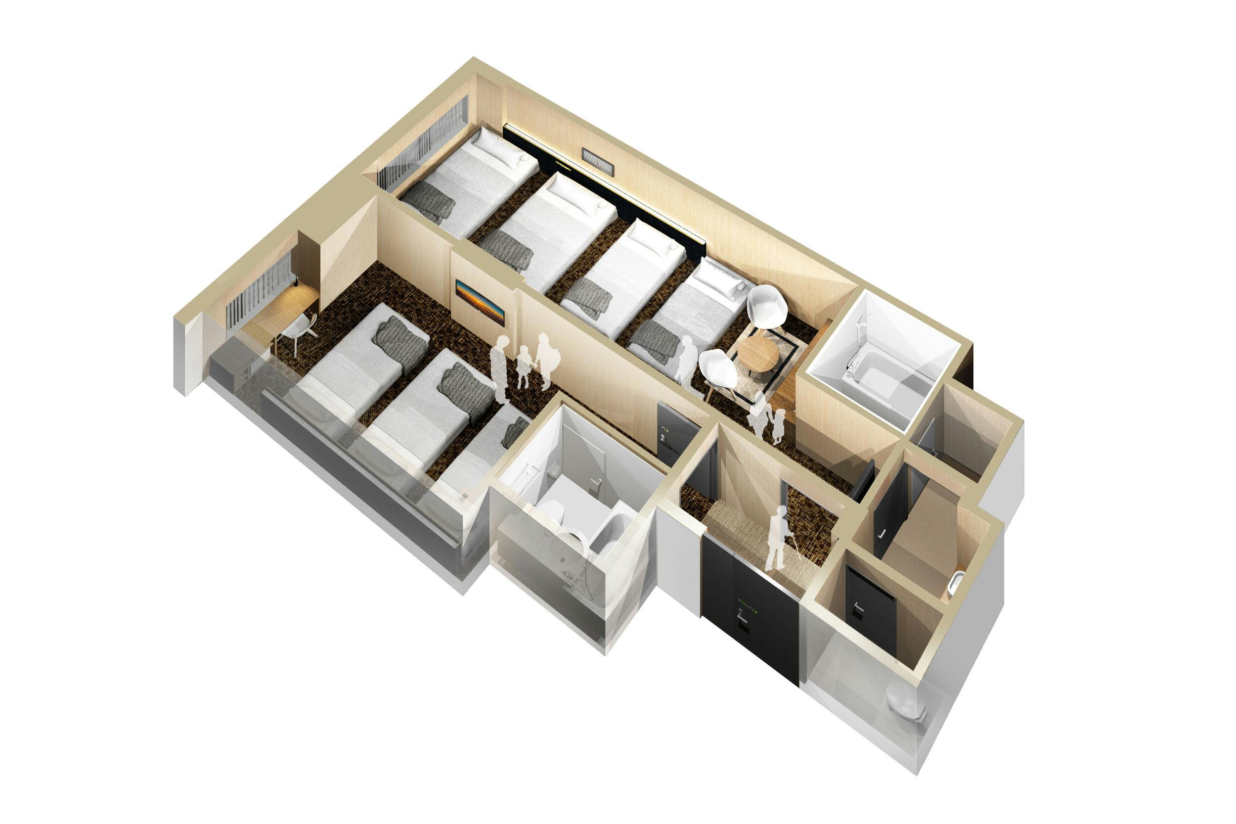 コンフォートツインルームとデラックスツインルーム。2部屋は外側にある扉でプライベートを確保します。デラックスツインルームはシングルベッド2台とスタッキングベッド(122×195cm)1台、デイベッド(95×198cm)1台、コンフォートツインルームはシングルベッド2台とスタッキングベッド(97×195cm)1台となります。