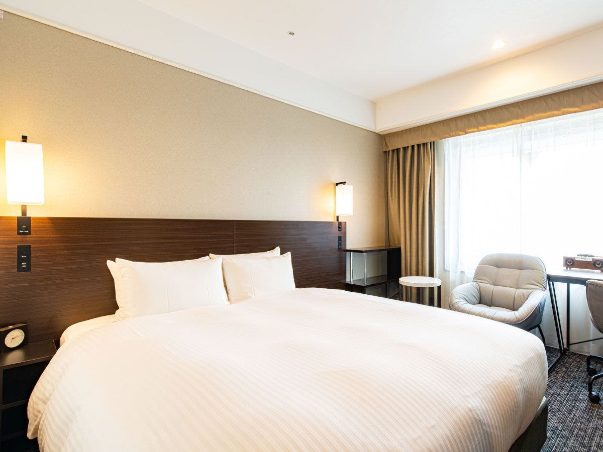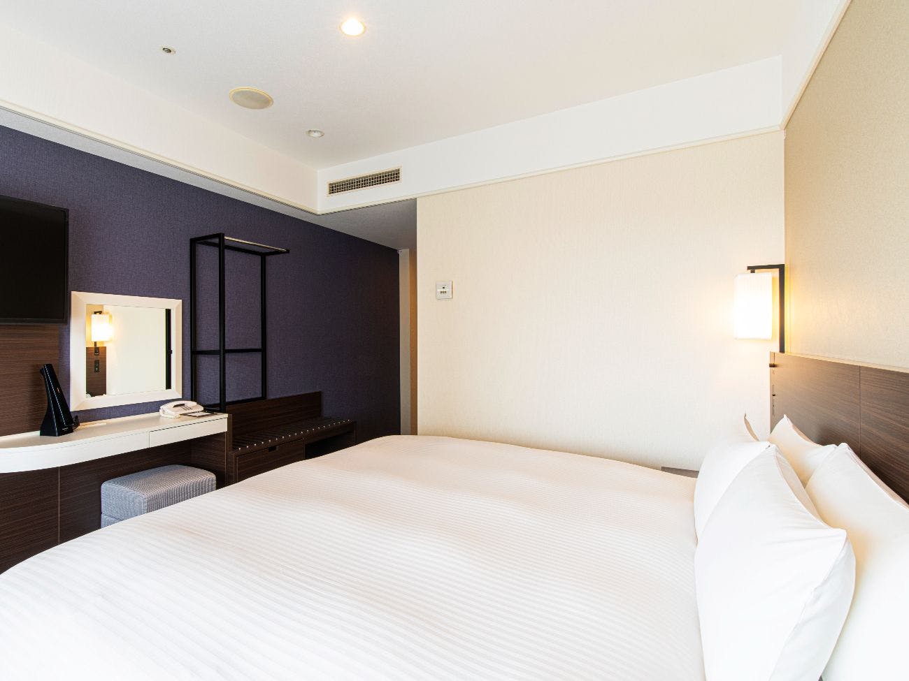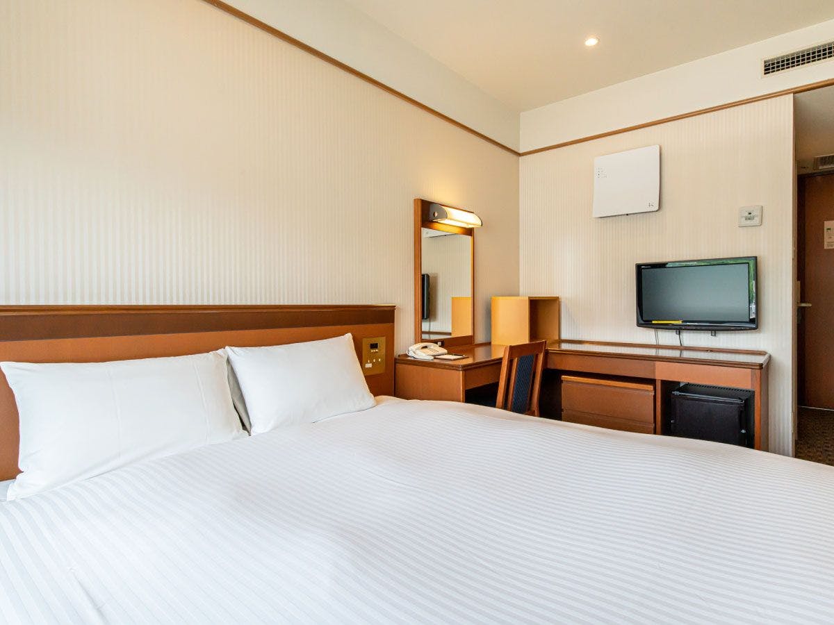 21平米のお部屋に2名様でもぐっすりとお休みいただけるダブルサイズベッド1台と