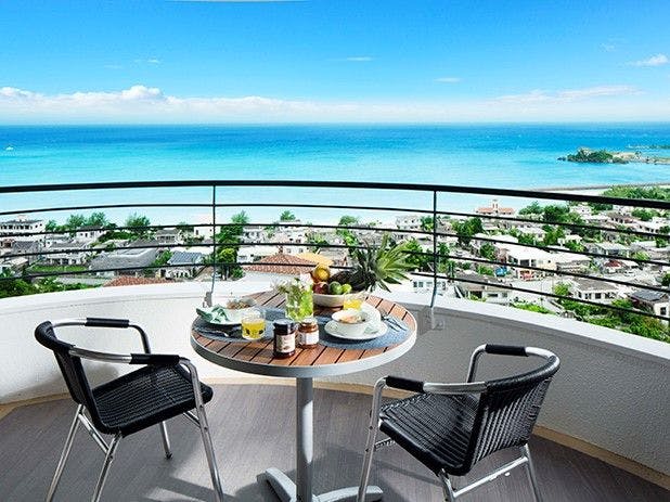 そして、広めのバルコニーにはテーブルがあり、リーフがあるからこそ見ることのできる淡い青と藍色の青の海を眺めることができます。晴れの日は遠くに伊江島のを望み、そのシンボルでもあるタッチューを眺めることもできます。