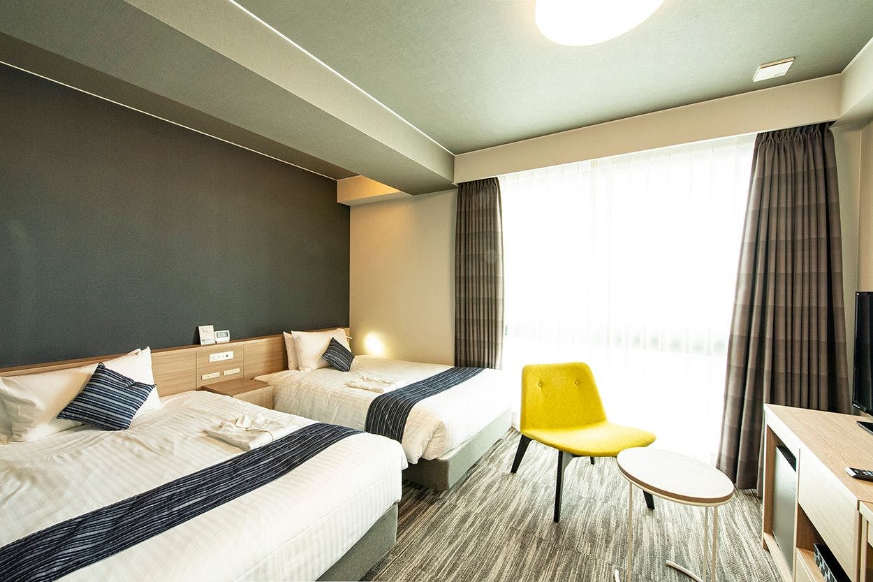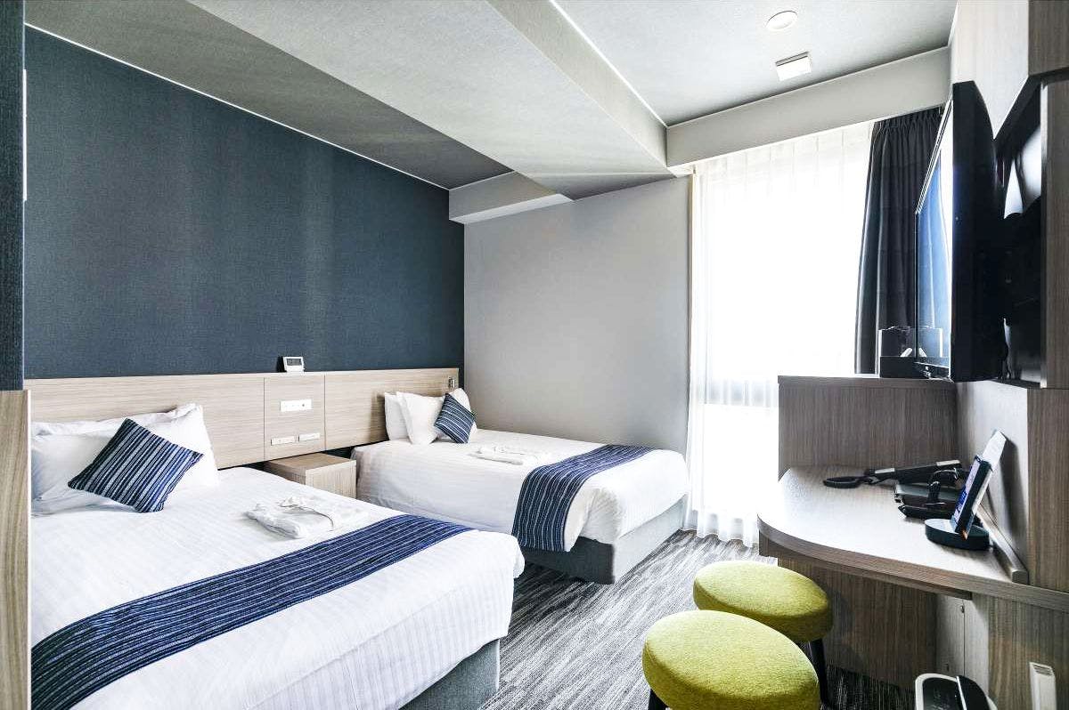 アウトフレーム構造のスッキリした客室、シングルサイズベッド2台、ユニットバス、博多織のベッドスロー