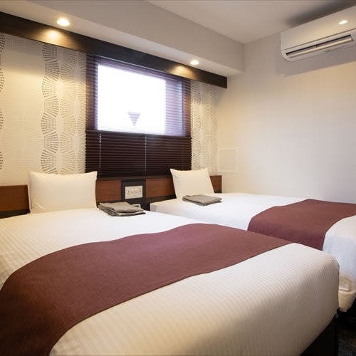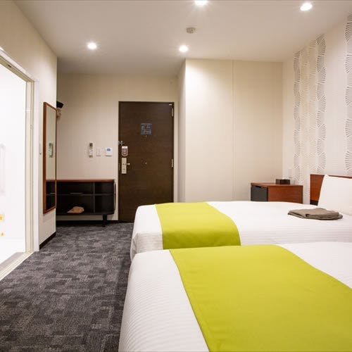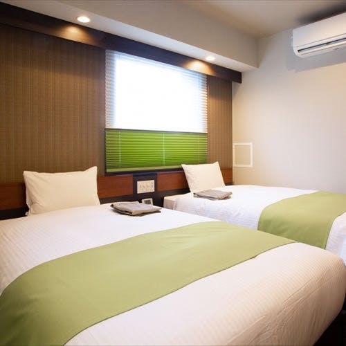 【禁煙】コーナーツインです(ミニキッチン付き)。ベッド100x200/き/Wi-Fi完備。各階1部屋のみ設けた角部屋で、駅側に面したお部屋です。広めのバスルームが特徴です。