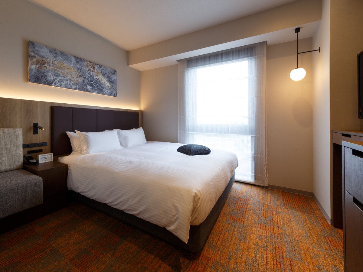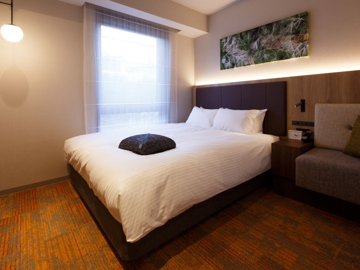 【ご注意】こちらのお部屋タイプにはデスク、テーブルはございません。ご希望の際はビジネスダブルルームまたはツインルームをご予約ください150cm幅ダブルベッド1台/全館禁煙・加湿空気清浄機・マッサージ機能付クッション・フットマッサージャー