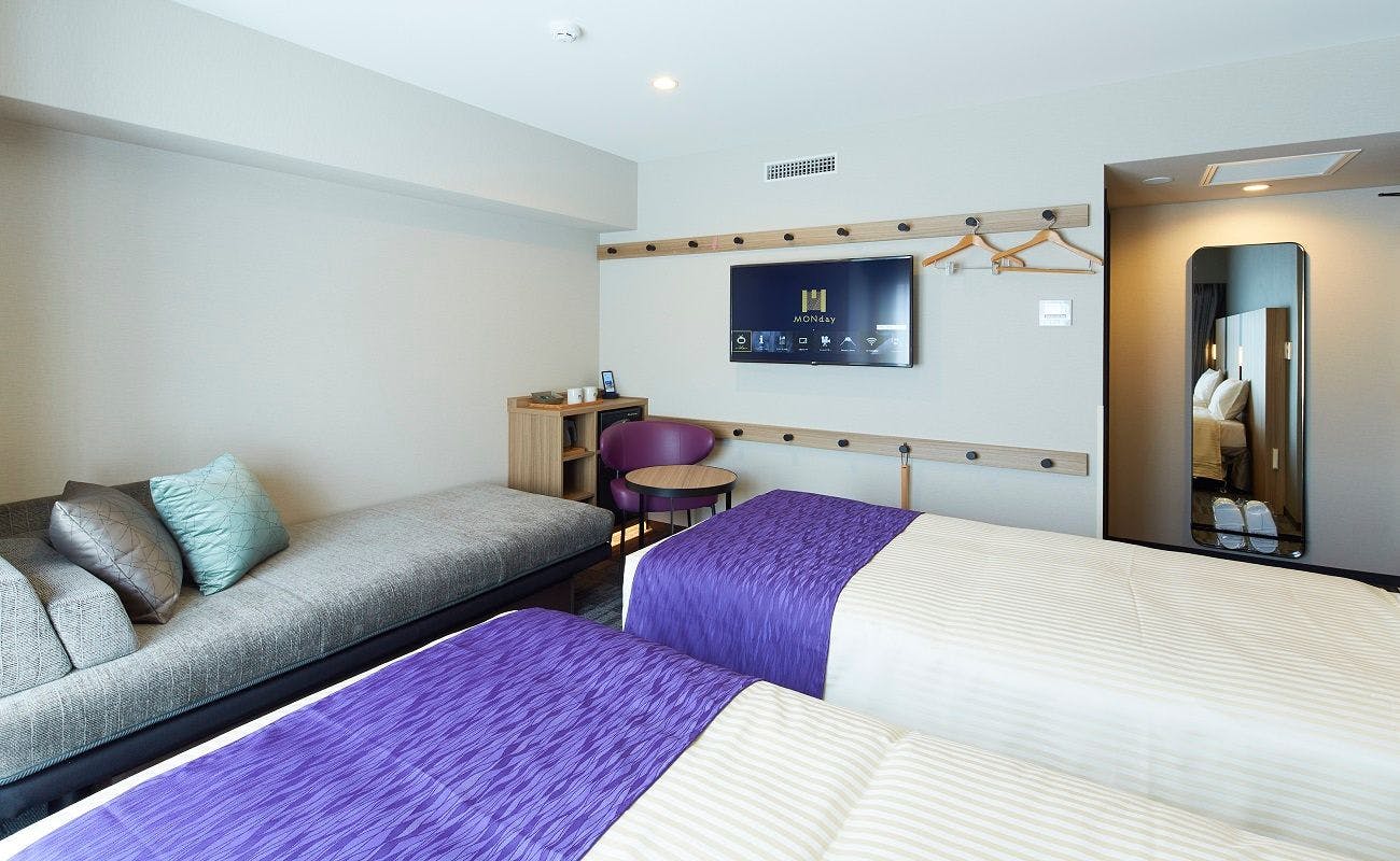 ツインベッドにソファベッドを配置したお部屋。約21平米~とゆったりしており、添い寝も可能でご家族やグループでのご利用におすすめ!!※3名様でご利用の場合、ソファをベッドへ組み替えてご用意いたしております。予めご了承くださいませ。○全室WI-FI無料○オリジナルマットレス〇シャワー