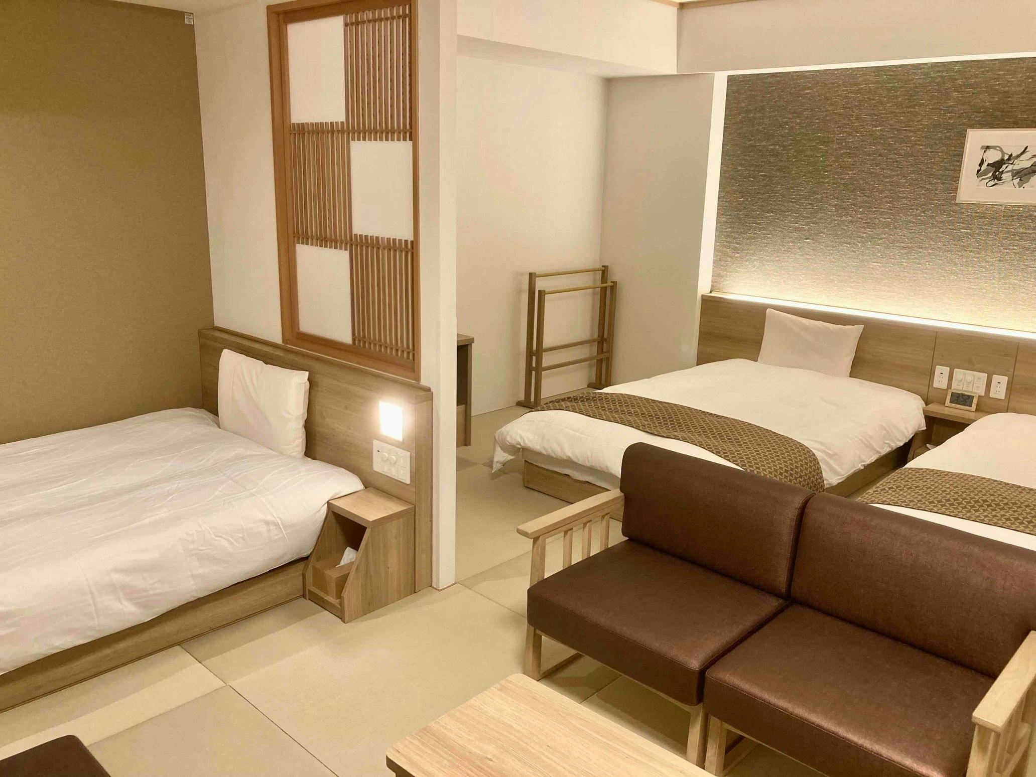 【禁煙】 ■33.3平米-35.7平米 ベッドサイズ(110×195cm)×3台 ■檜風呂 ■55型有機ELテレビ ■加湿空気清浄機完備