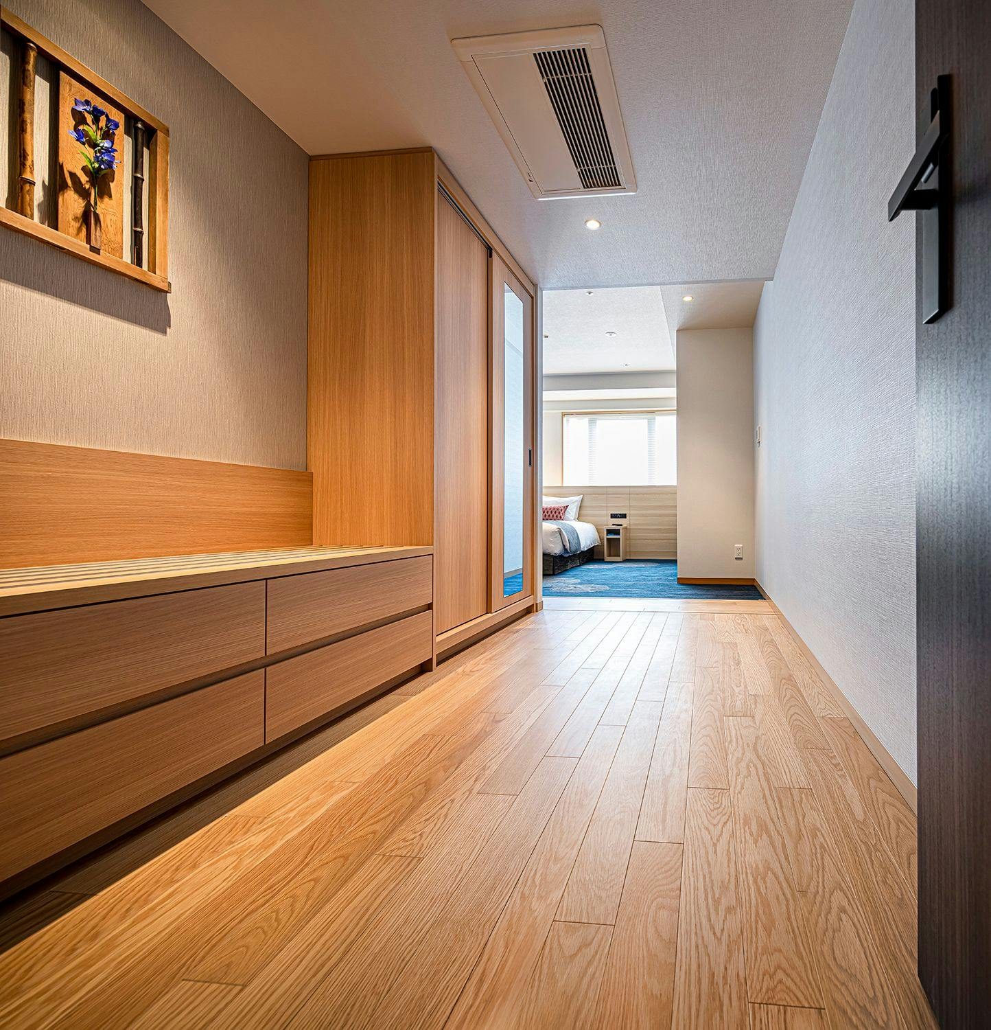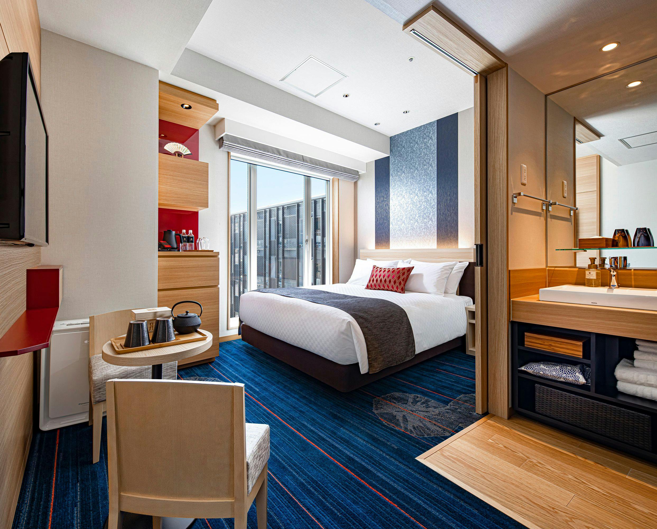 京都駅八条東口から徒歩3分の好立地。観光やビジネス利用者に最適のロケーション。洗い場付きバスルーム、独立洗面台&お手洗いを完備。無料のお飲物を楽しめる宿泊者専用ラウンジもあり。