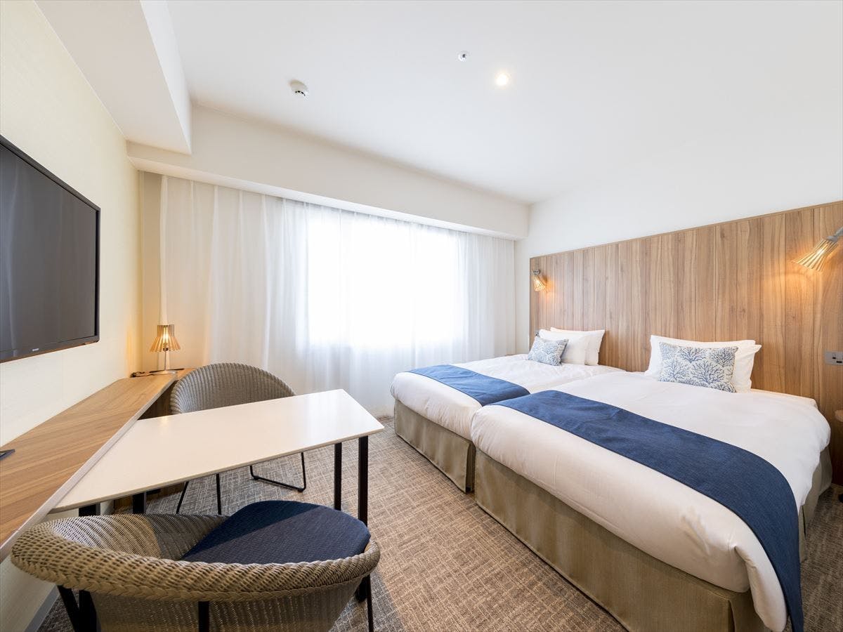 ベッドはハリウッドツインタイプ(ベッドとベッドを隙間なく設置)でカップル、ご夫婦、ご家族のご利用に最適なお部屋です。小さな子供も安心して一緒にお休みいただけます。お部屋は31平米とゆったりめの広さとなっております。二人で広々過ごすしても良し、ご家族や親しいお仲間とワイワイ過ごすのも良し、ソファーセットを配置しているので、ゆったりとした時間をすごしたい方におすすめ。