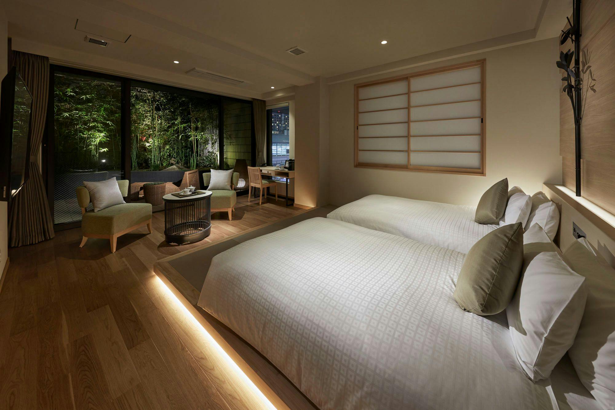ベッド幅120cmX2台/専用露天風呂(特大檜風呂)/専用庭園/バルコニー付/ウォシュレット/レインシャワー/加湿空気清浄機/無料Wi-Fi/コーヒーマシン