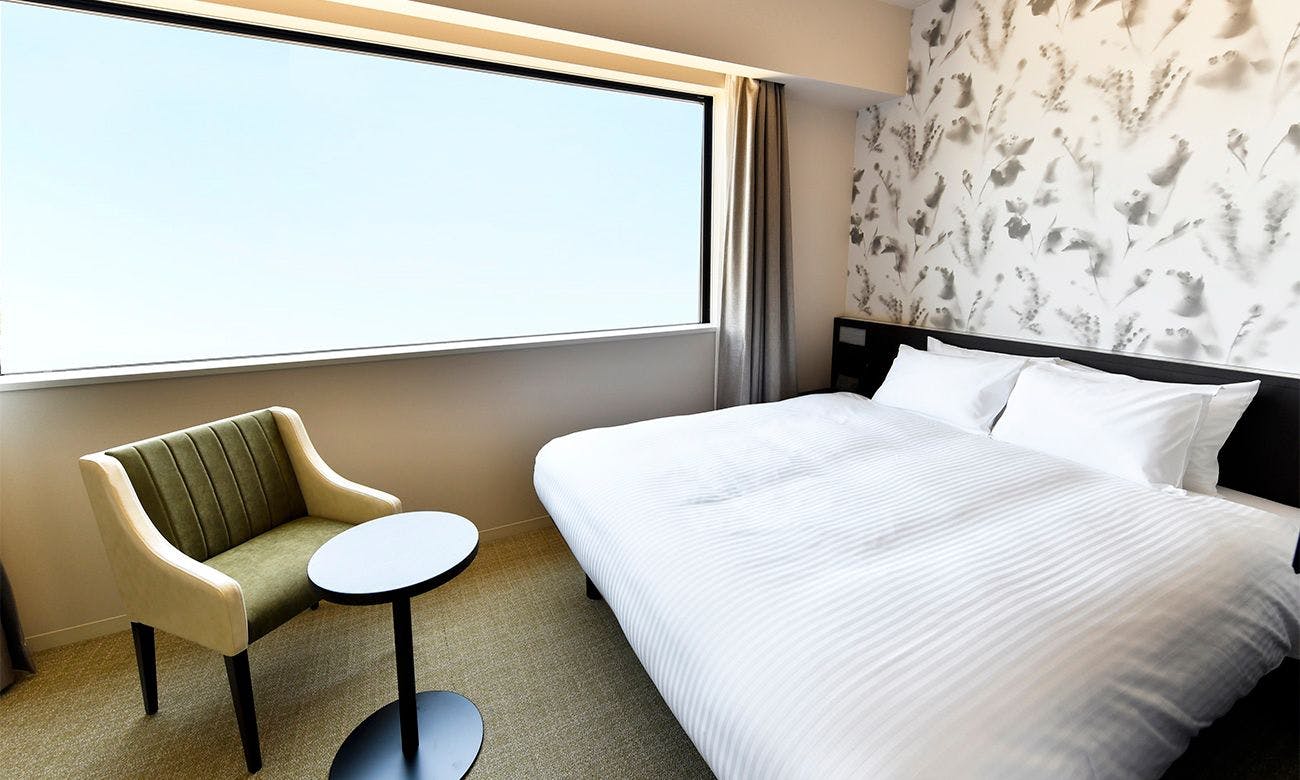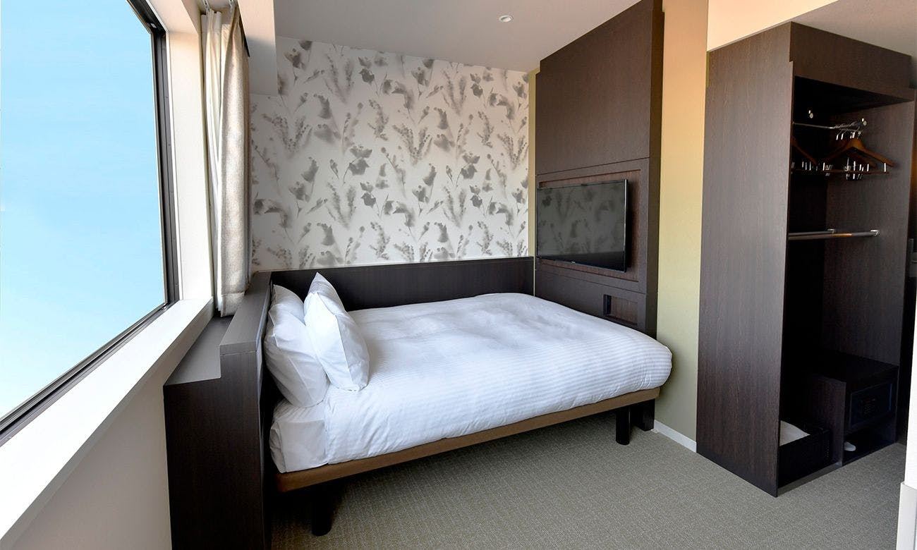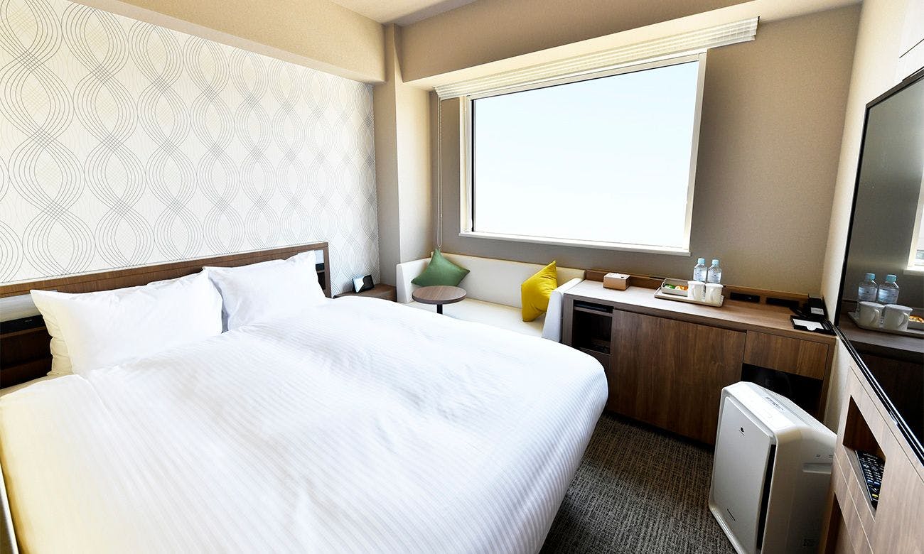 ■ 部屋の広さ 22.6平米 ベッド 160cm×203cm ■大きな窓が特徴の開放感あふれるダブルルーム洗い場付きバスルーム、トイレ、洗面台を独立【 全タイプ共通設備(全室禁煙)】 ・Wi-Fi・枕元USB&コンセント・空気清浄機・寝心地を追求したスランバーランド製ベッド