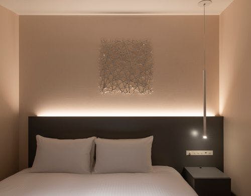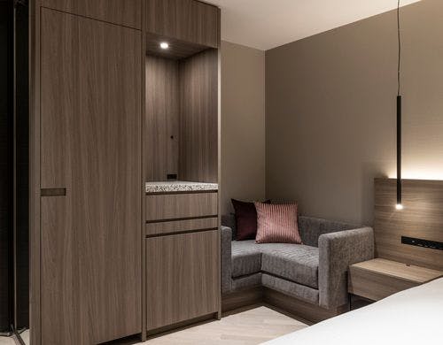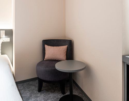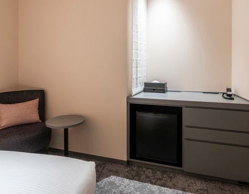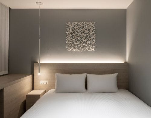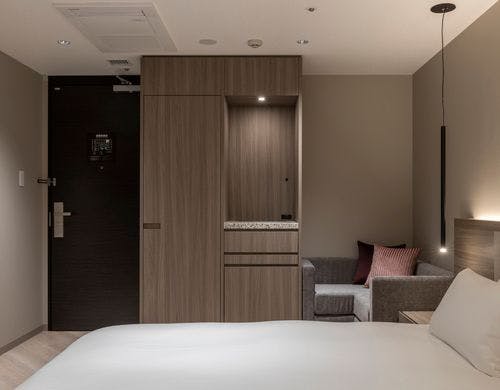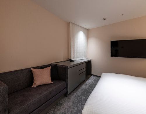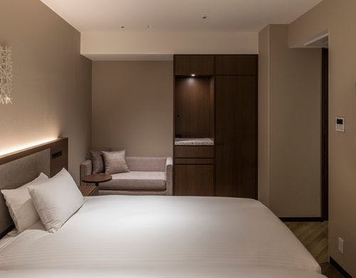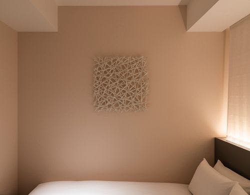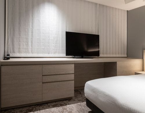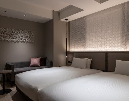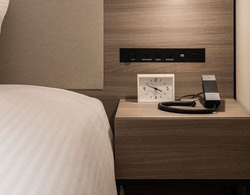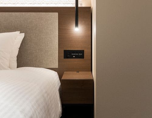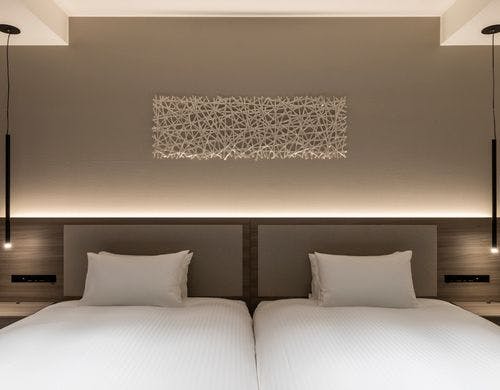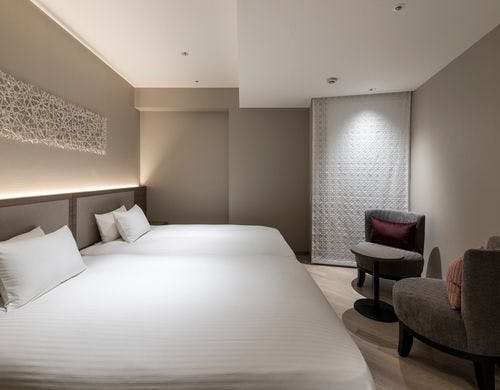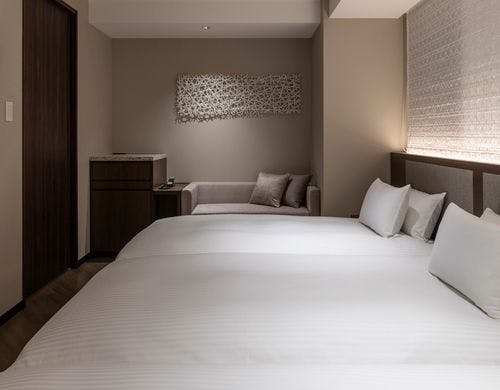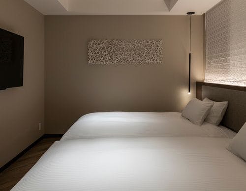 「居心地のよさ」と「よい目覚め」を提供するため、照明やインテリア、備品など細部までこだわった落ち着きのある空間に、シモンズ製のシングルサイズのベッド2台をすき間なく並べたハリウッドタイプです。