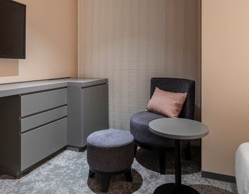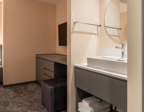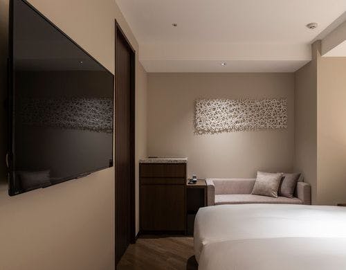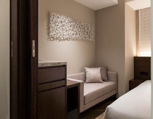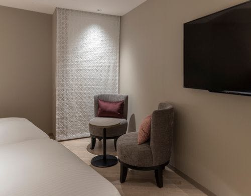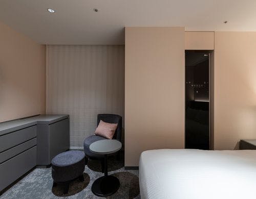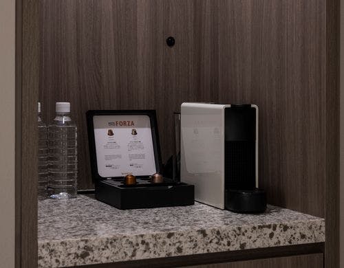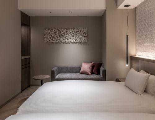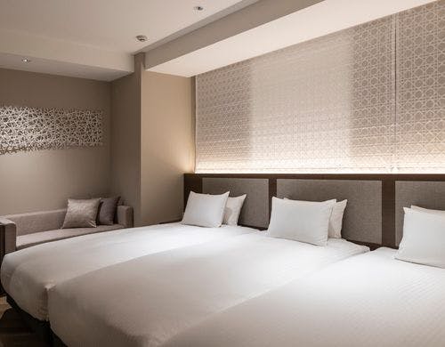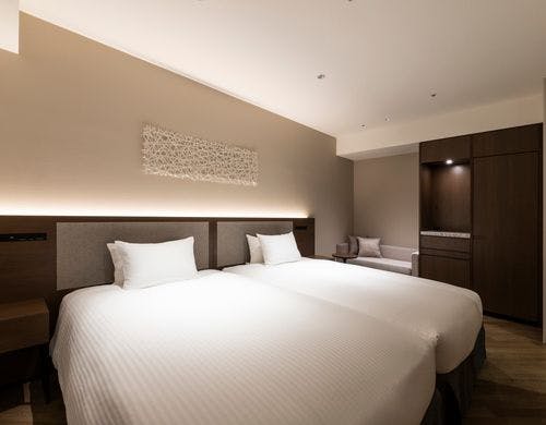 ご滞在をより快適にお過ごしいただくため、ネスプレッソマシーン、お風呂用スピーカーの他、女性に人気のライト付きメイクアップミラーを備えた特別なお部屋をご用意いたしました。ベッドはシモンズ製のシングルサイズ2台を隙間なく並べたハリウッドツインタイプです。