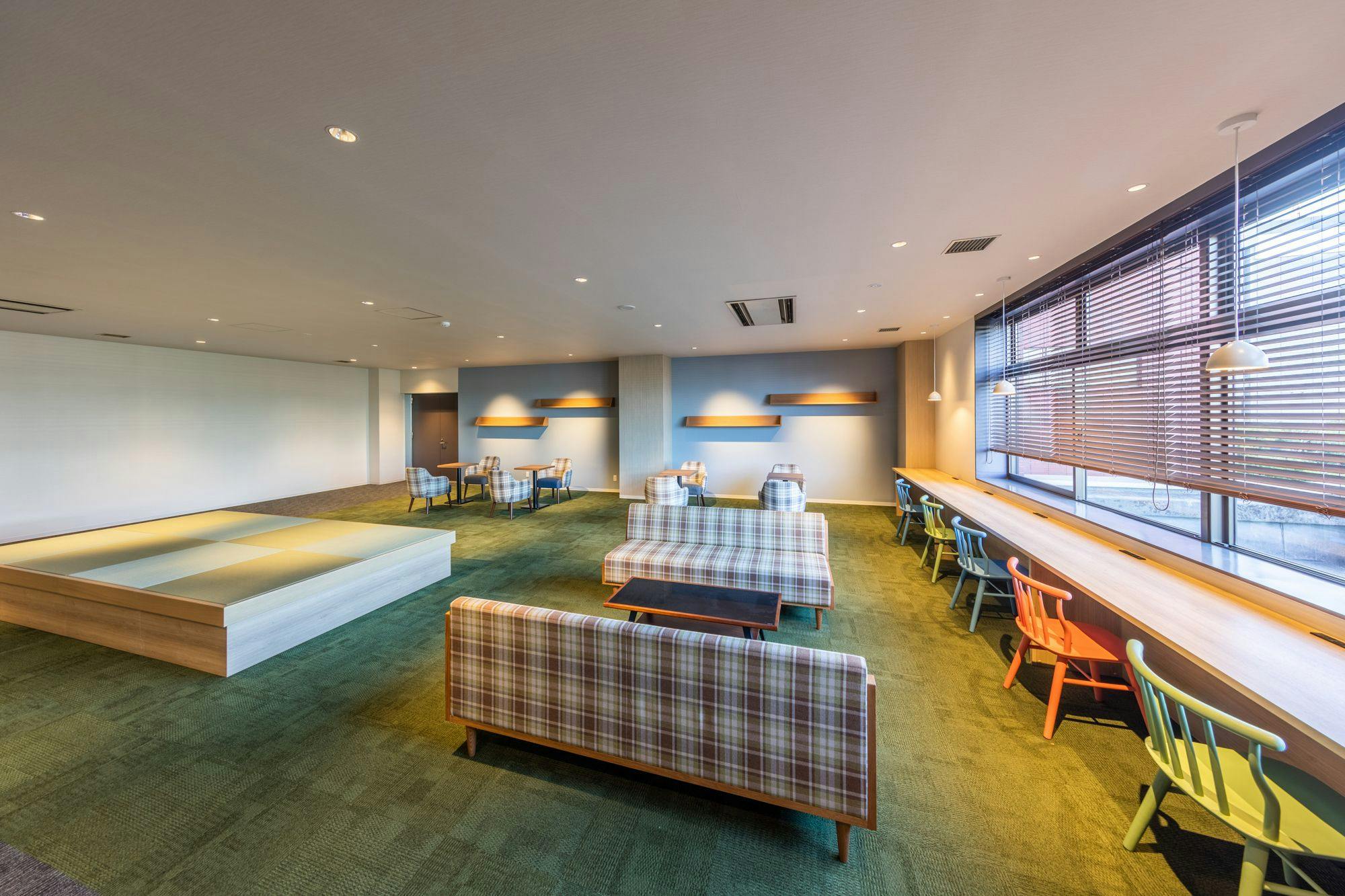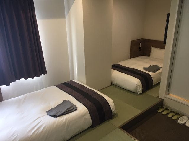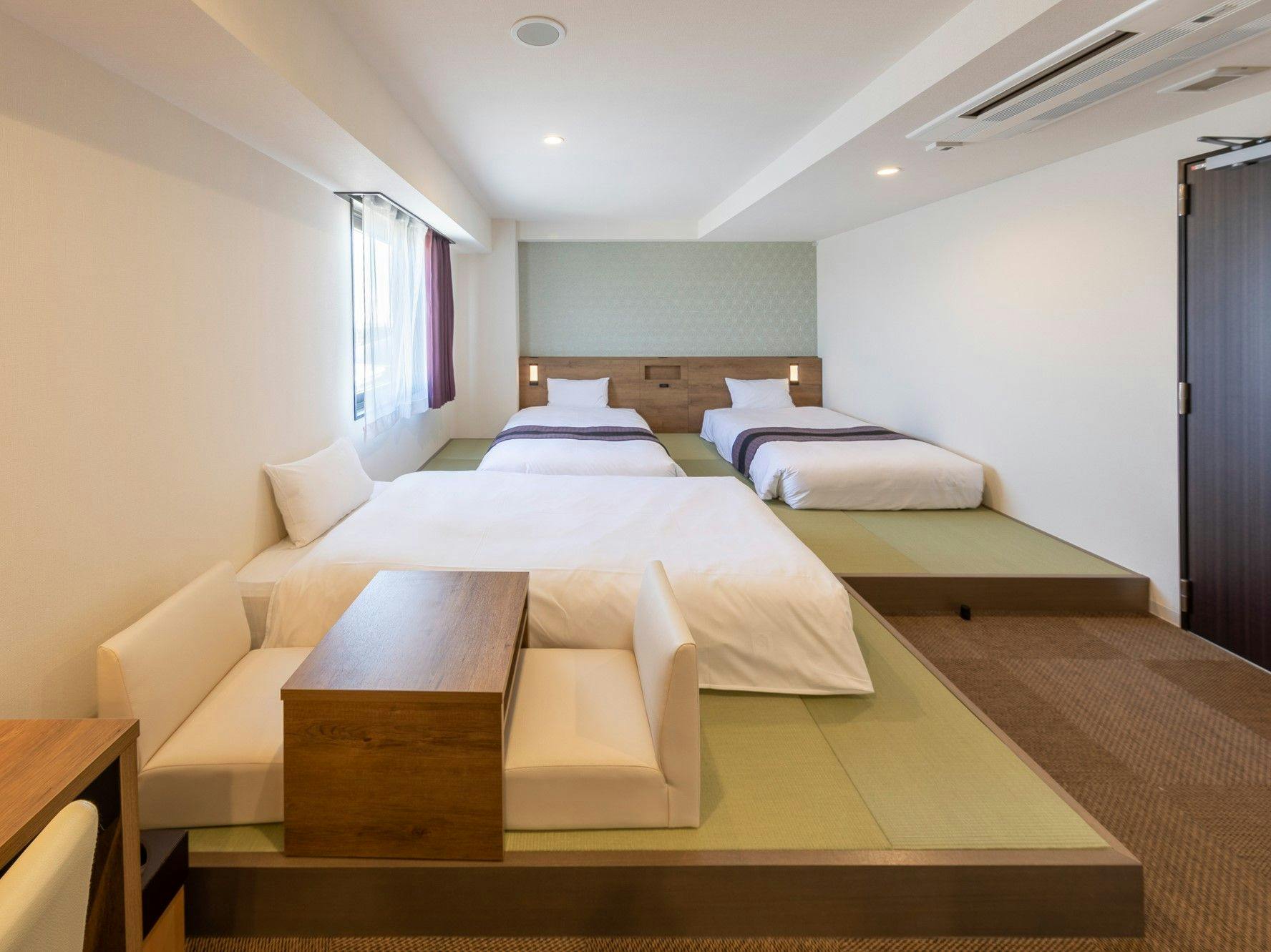 17平米の客室に畳貼りの小上りを設けた和モダンテイストなお部屋です。カップルやファミリーに適したお部屋です。NURO回線でWiFiはサクサク。複数口あるUSBコンセントは外出中も充電可能です。客室標準装備40型液晶TV シモンズ社製ベッド 羽毛布団(デュベスタイル) USBコンセント(複数口) 加湿空気清浄機 シャワートイレ マイナスイオンドライヤー 静音冷蔵庫(空) 電気ケトル他