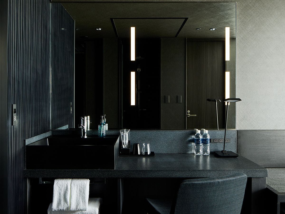 洗面から収納、デスク作業までが美しく集約された黒のバックステージエリアと、やさしい光に白と木目で仕上げられたベッドエリアで、機能的ながら心身ともに安らぐことができるお部屋です。