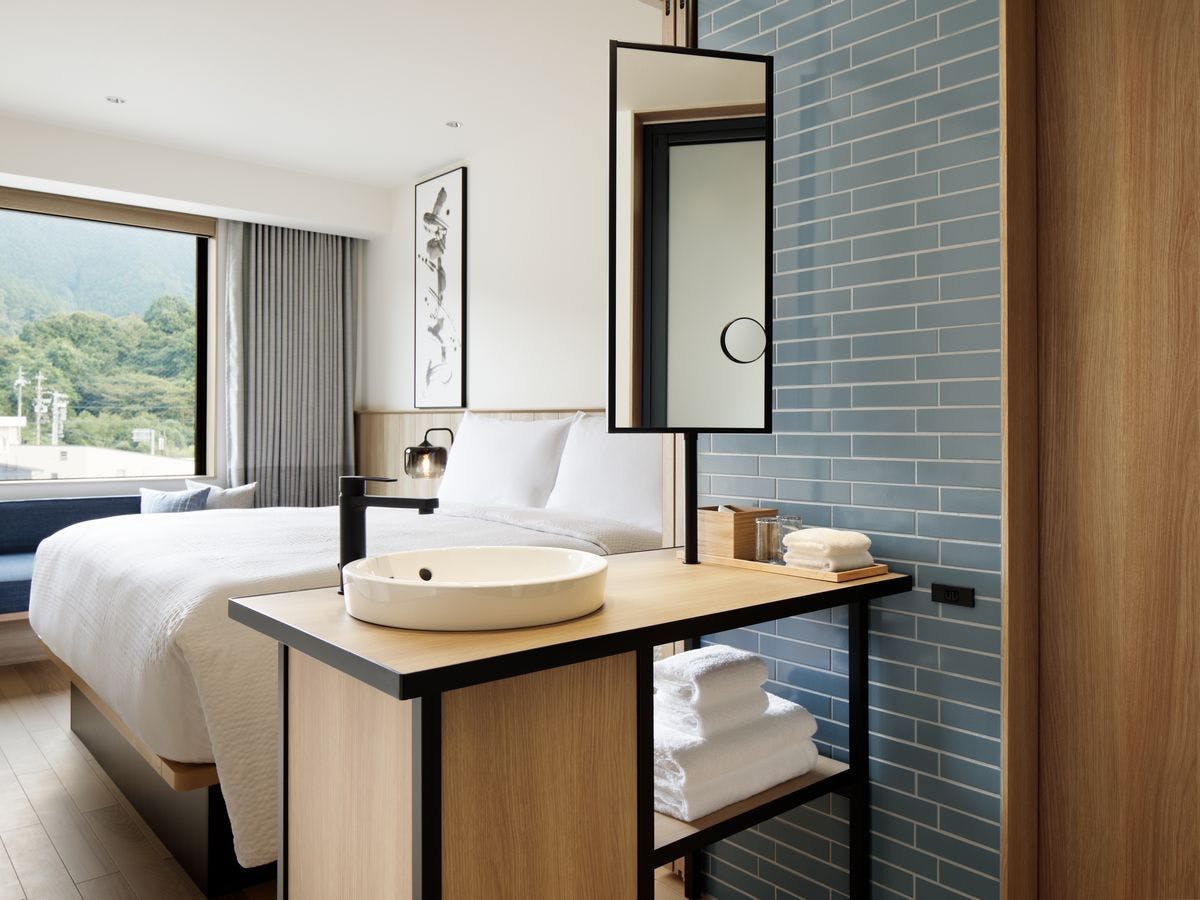 63室の客室は平均25平米とコンパクトながら、シャワーブースを設けることで、シンプルでゆとりのある空間を実現しました。寝心地のいいベッドはもちろん、無料Wi-Fiも備えており、快適に過ごしていただけます。
