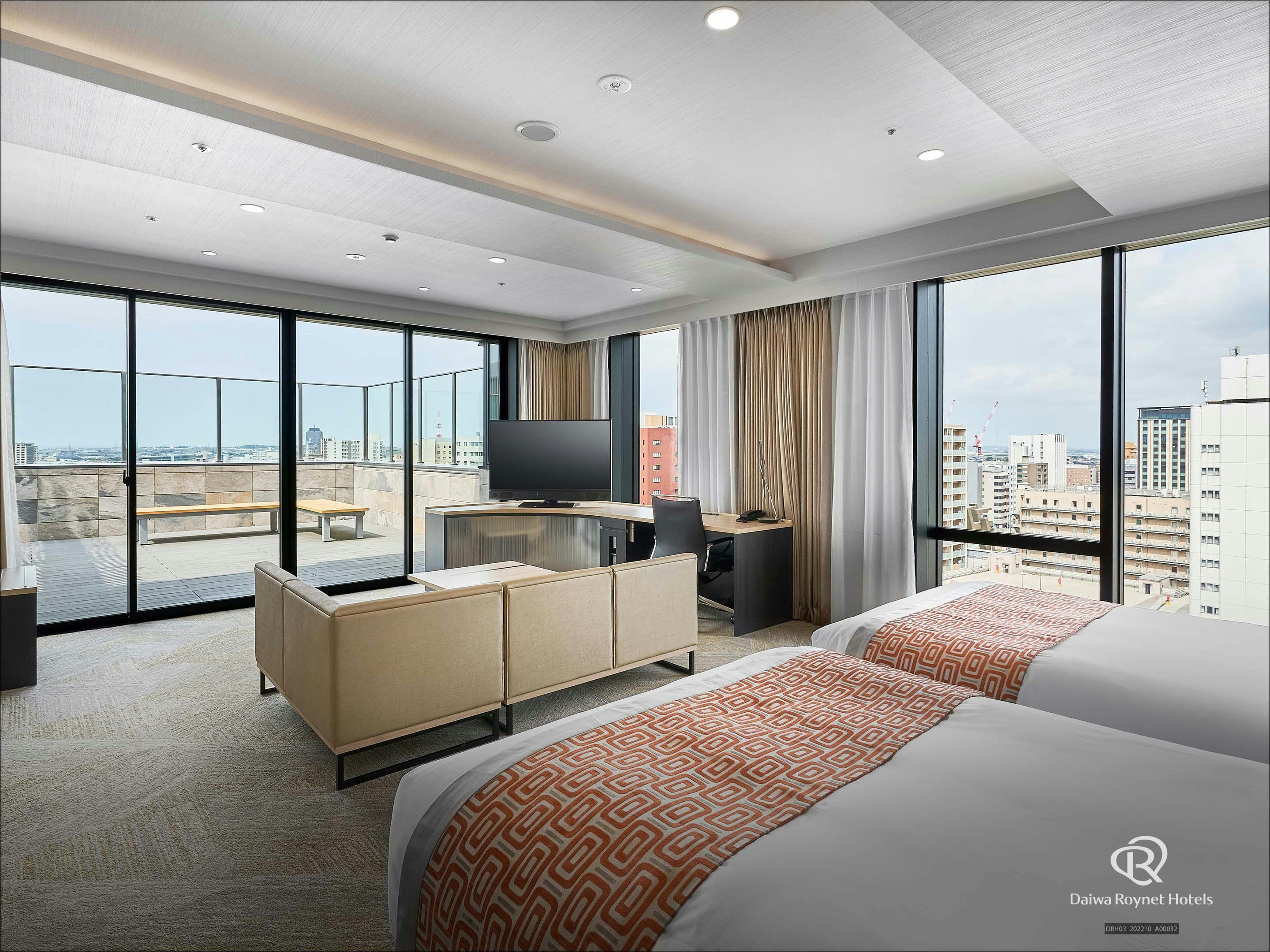 【お部屋案内】・広さ50平米+専用バルコニー/ベッド幅ベッド140cm×2台+エキストラベッド97cm×2台(※ご予約人数に合わせて設置いたします)・セパレートバス・トイレ・女性に大人気なReFa製品完備(ドライヤー、ヘアアイロン、シャワーヘッド)・雨のように優しく降り注ぐオーバーヘッドシャワー・セキュリティボックス・Wi-Fi無料接続・スマホやタブレットから動画や画像を映せるミラーリング機能付き50型テレビ・各社対応型携帯充電器完備・各室個別空調システム・マッサージチェア