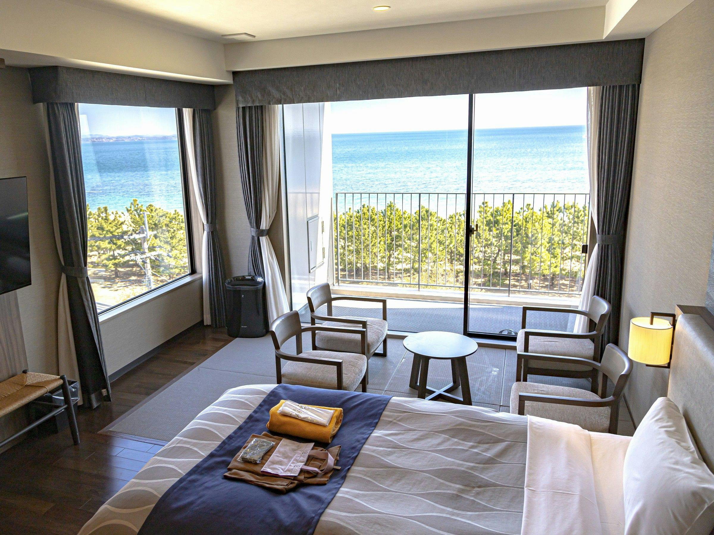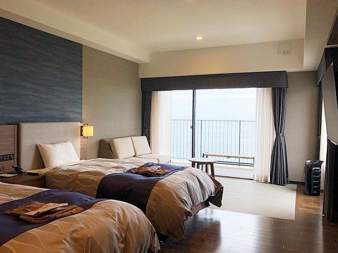 ■客室 別府湾を一望できるオーシャンビュー。全室禁煙。バスルーム付き。お部屋は角部屋のゆったり34平米。無料Wi-Fi。ゆっくりくつろげる琉球畳スペース。全室別府湾を一望するバルコニー付き。3名利用時は1名エキストラベッド対応になります。