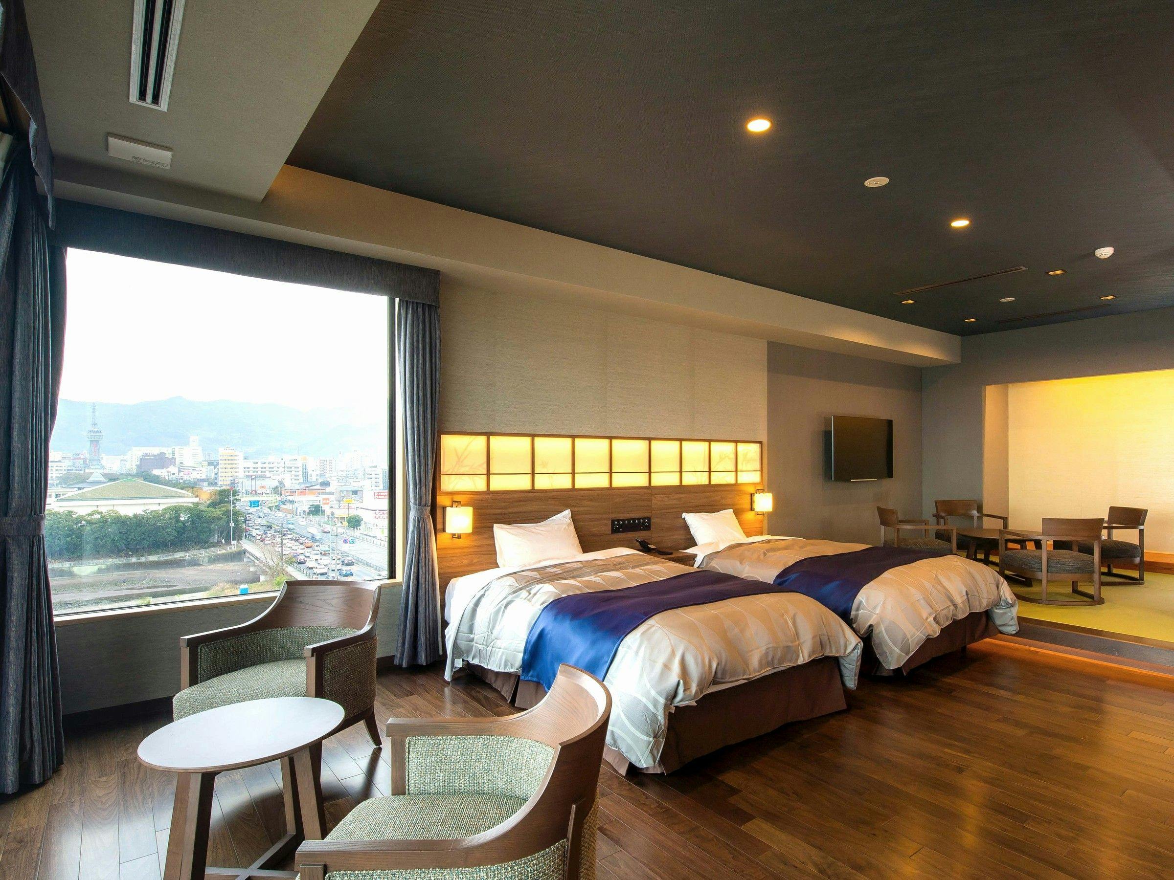 別府湾を一望できる源泉掛け流し露天風呂付き和洋室。客室は全室禁煙。お部屋は広々63平米。洋室(ゼミダブルベッド2台のツインルーム)と琉球畳。シャワールームあり。全室別府湾の絶景を望むバルコニー付き。無料Wi-Fi。3名以上は布団対応となります。