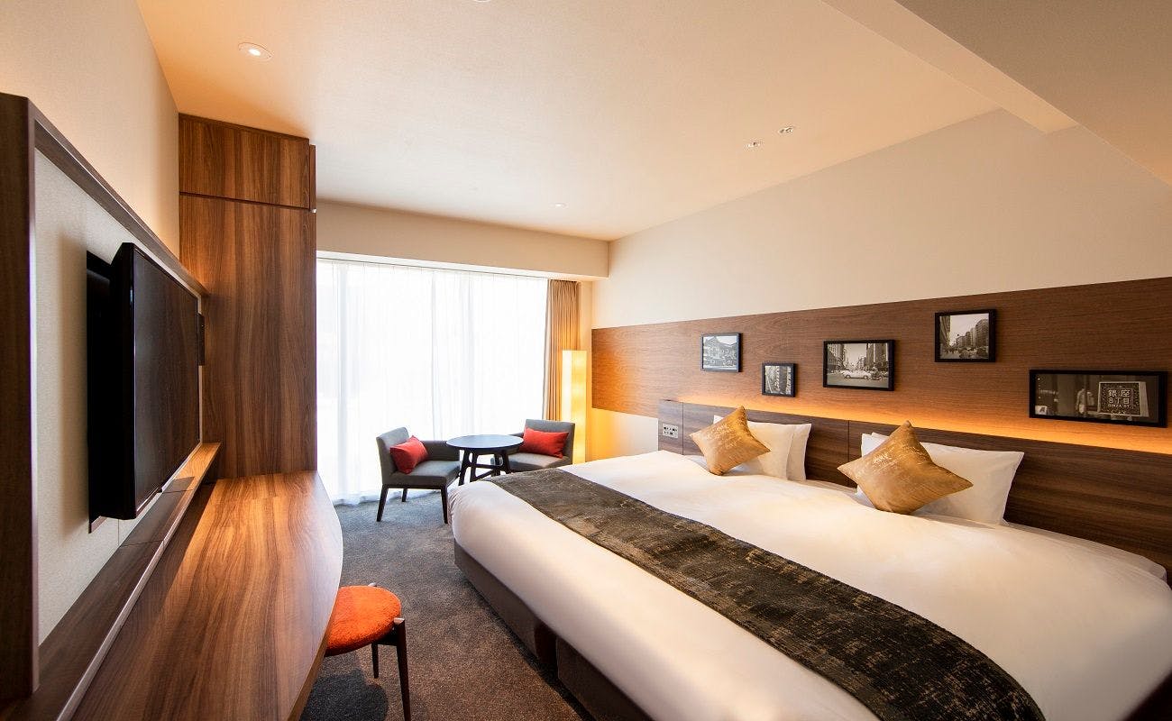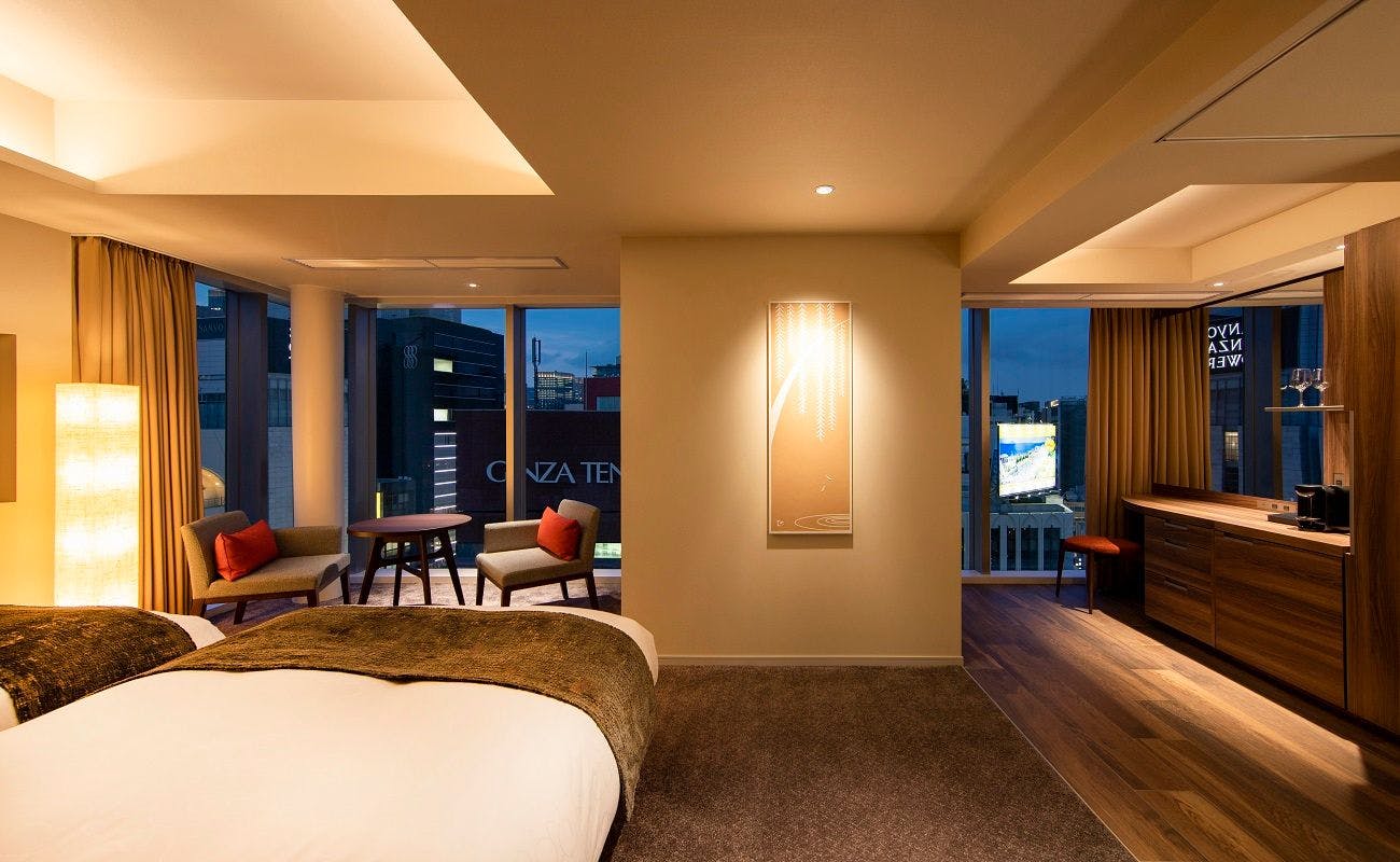 36平米の広々としたお部屋はお手荷物の多いお客様にもおすすめです。床からの大きな窓からは、昼夜で表情を変える銀座の街を望むことができます。