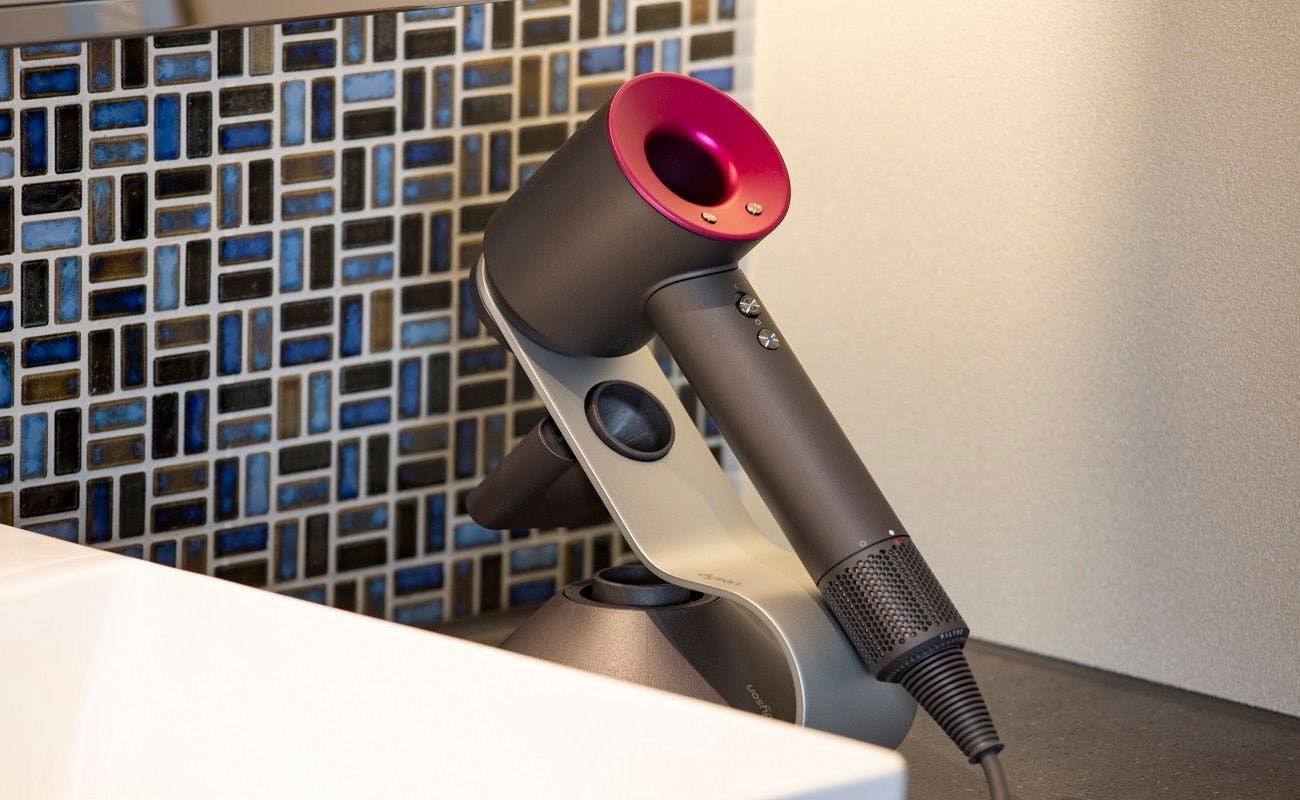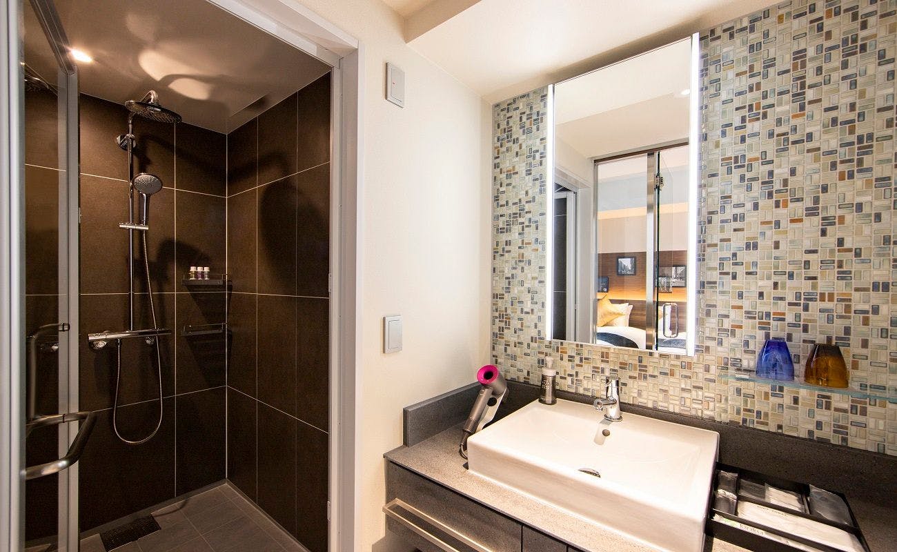 レインシャワーも楽しめるオーダーメイドのバスルームで、心ゆくまでおくつろぎください。バスローブ、ダイソン(ダイソンヘアスタイラー付き)もご用意しております。