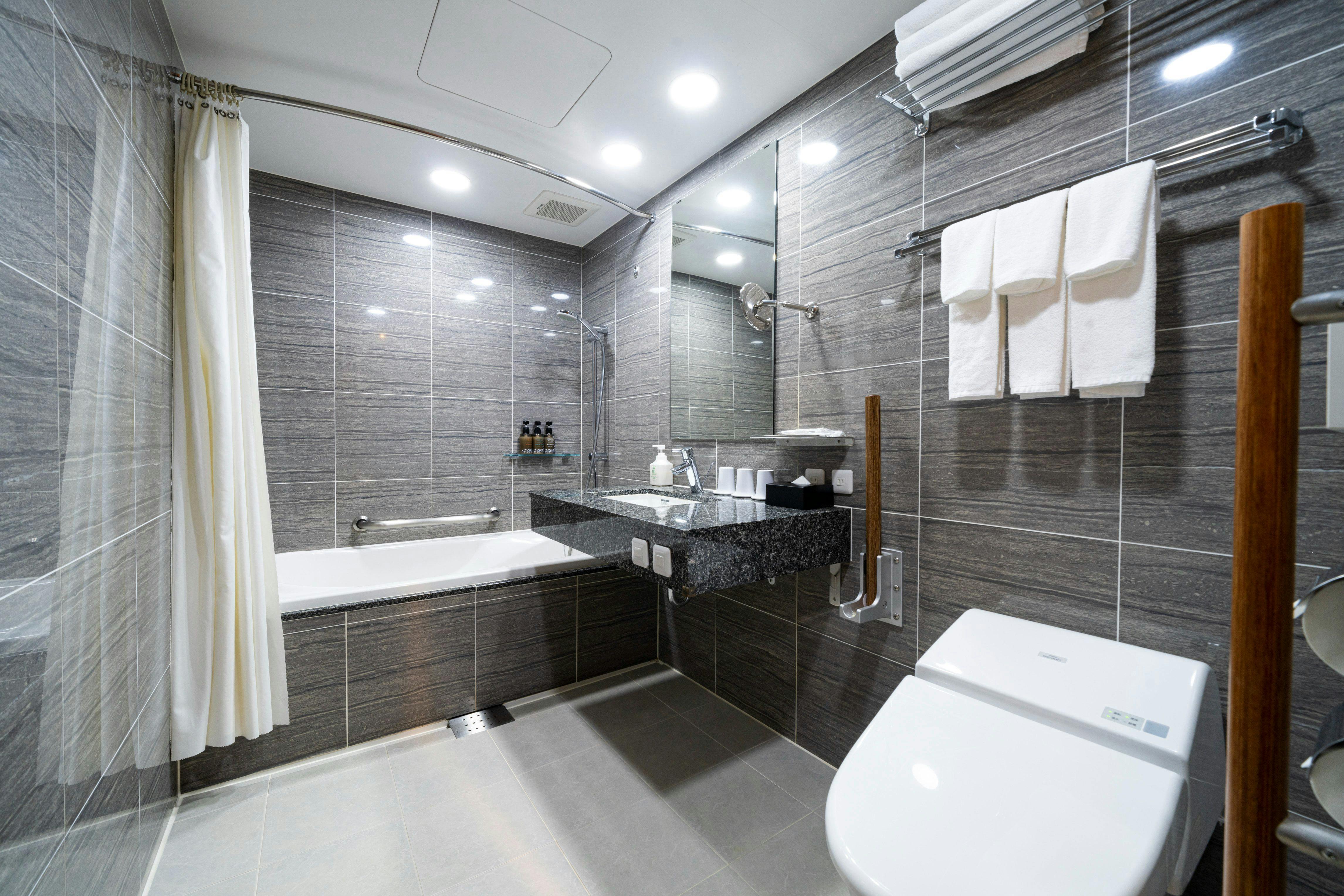 質が高く幅140cmの広々としたベッド、広いバスタブで快適な滞在を演出します。