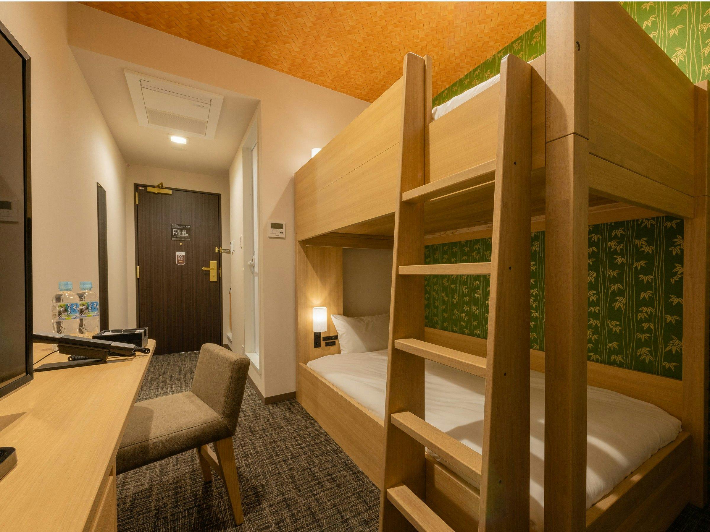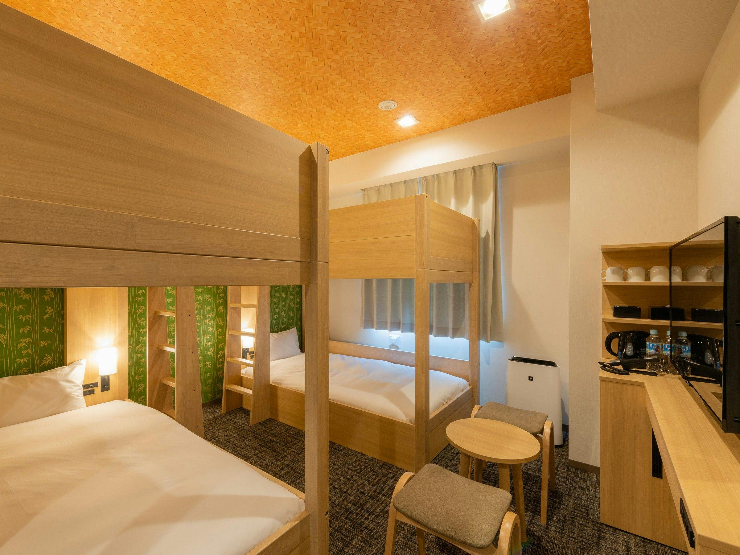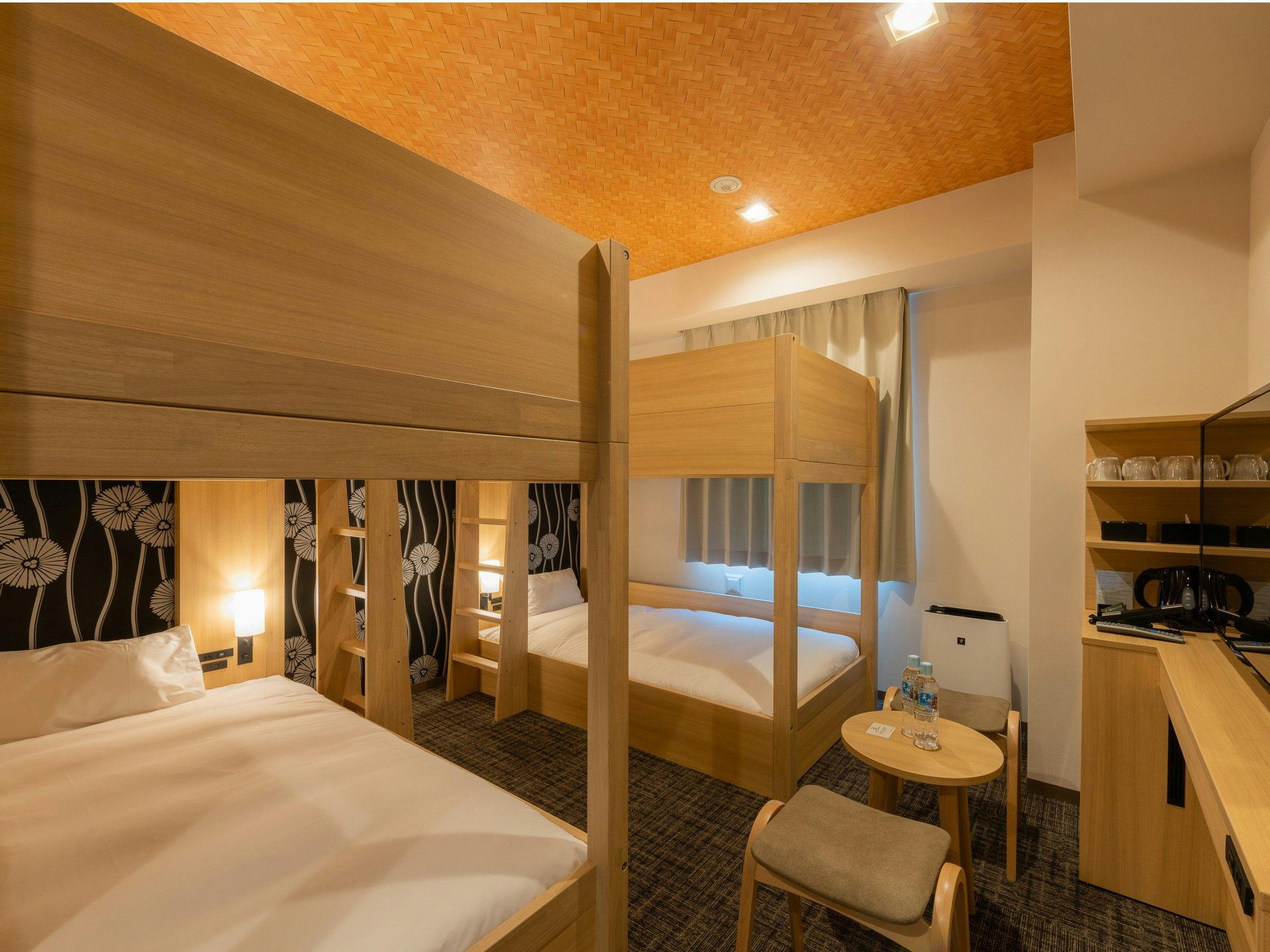 2段ベッドを2台備えたお部屋は、4名様までご利用いただけるファミリールーム仕様です。お子様連れの家族はもちろん、お仲間同士にもおすすめです!2段ベッドにも高品質を追求。国内生産のオリジナル特注ベッド、マットレスは2段ベッドでの採用は稀なシモンズ社製ポケットコイルを導入。快適な睡眠をサポートいたします。ローテーブルとミニチェアも装備したお部屋で、ご家族様やお仲間同士で楽しいひと時をお過ごしください。