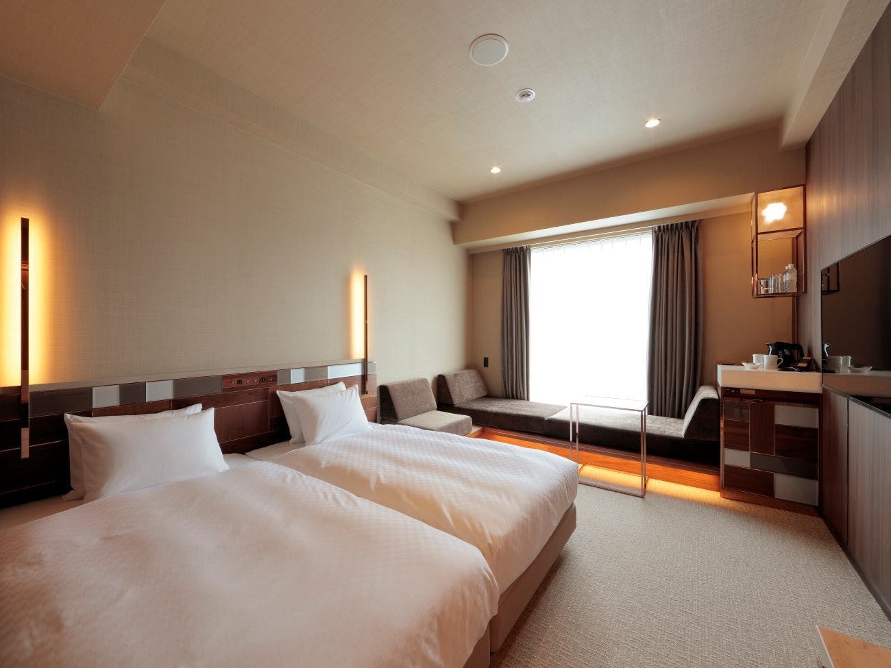 ※3名利用の場合は、1台はエキストラベッドになります。■全室禁煙/■広さ:22平米/■ベッド幅:1,100mm×2台(シモンズベッド社製)/■客室設備:無料Wi-Fi、こあがりソファ、ミニデスク、テレビ、シャワーブース/■客室アメニティ:館内着(浴衣)・スリッパ、シャンプー、コンディショナー、ボディソープ、バスタオル、フェイスタオル、ドライヤー、電気ポット、マグカップ、金庫