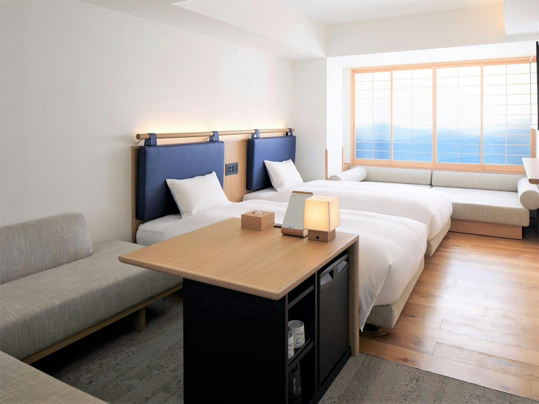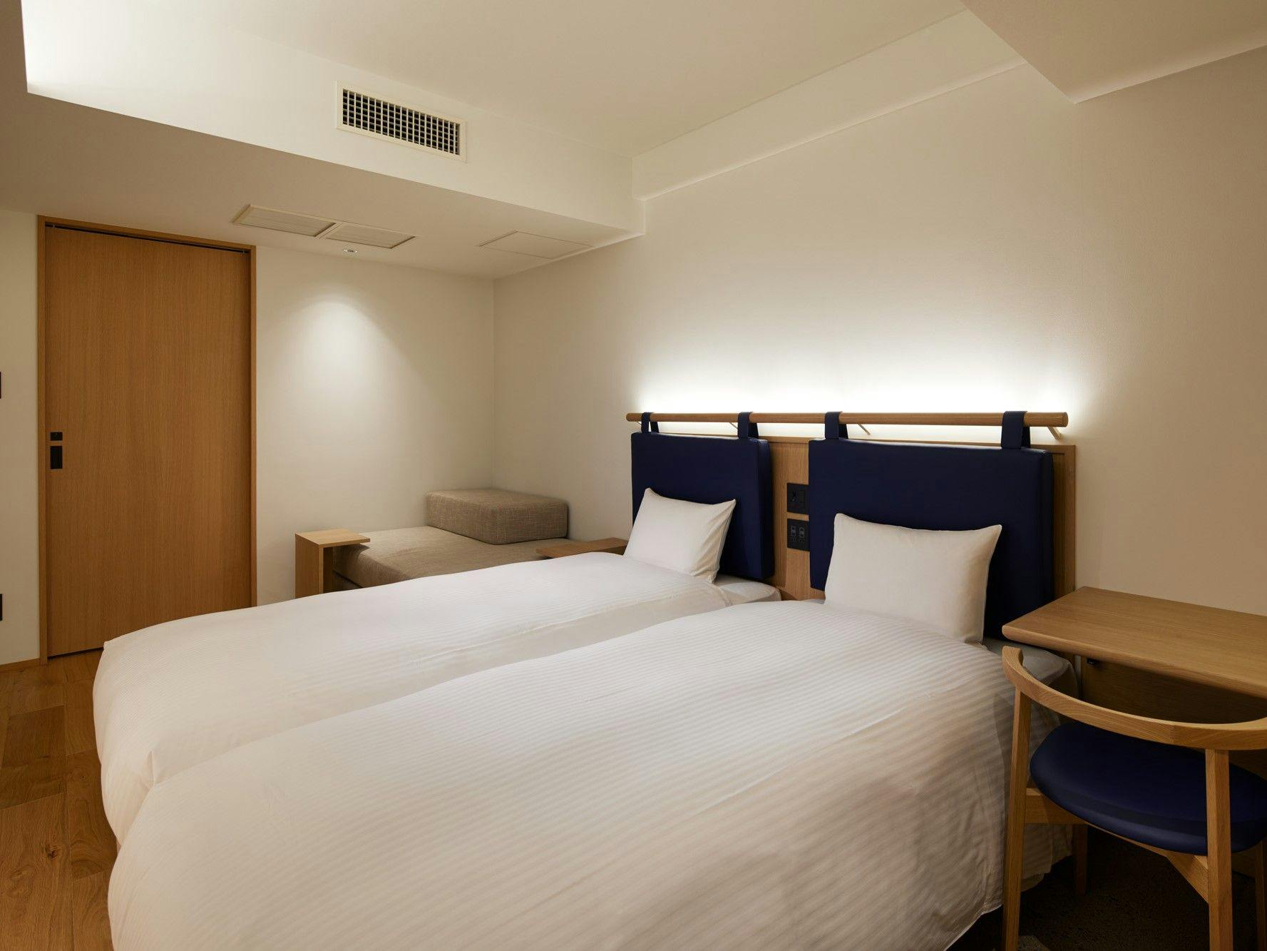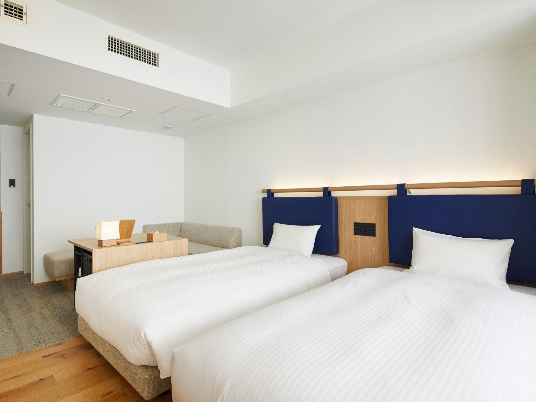 20平米の客室に幅1100mmベッドを2台備え、ソファベッドを活用することで3名様までご宿泊いただけます。ユニットバスもゆとりのあるサイズを備えています。歯ブラシが客室に常設からレセプション提供に変わります。