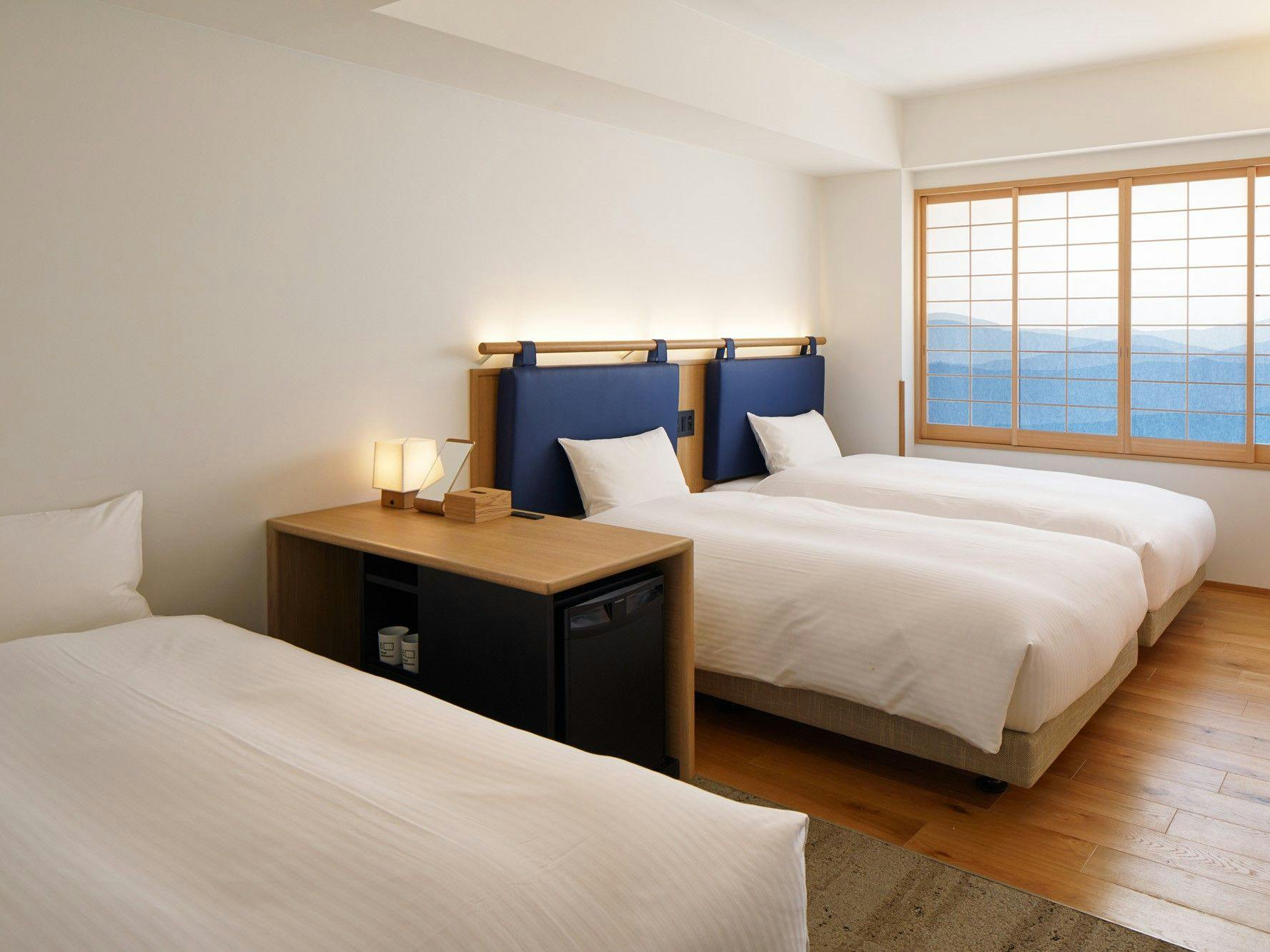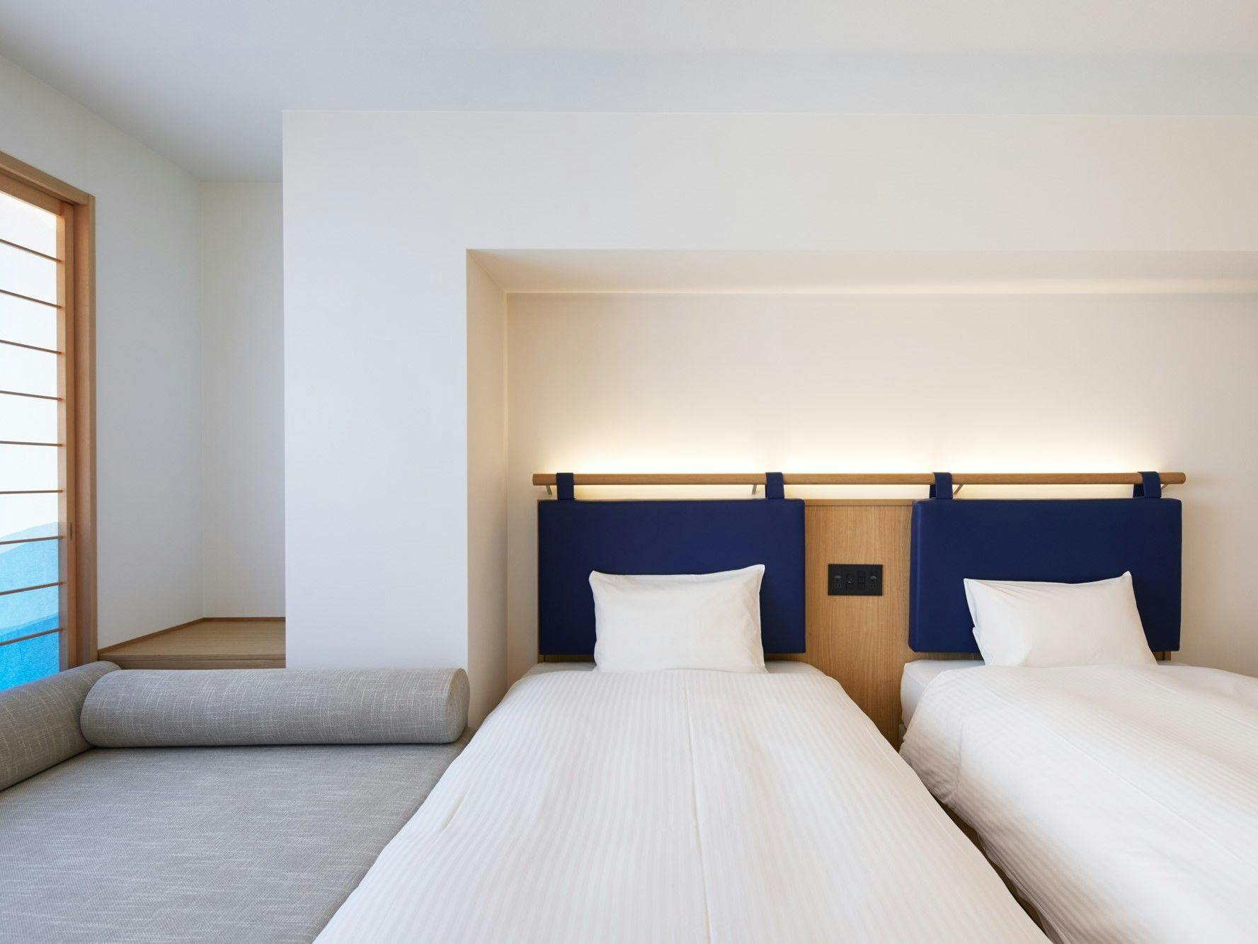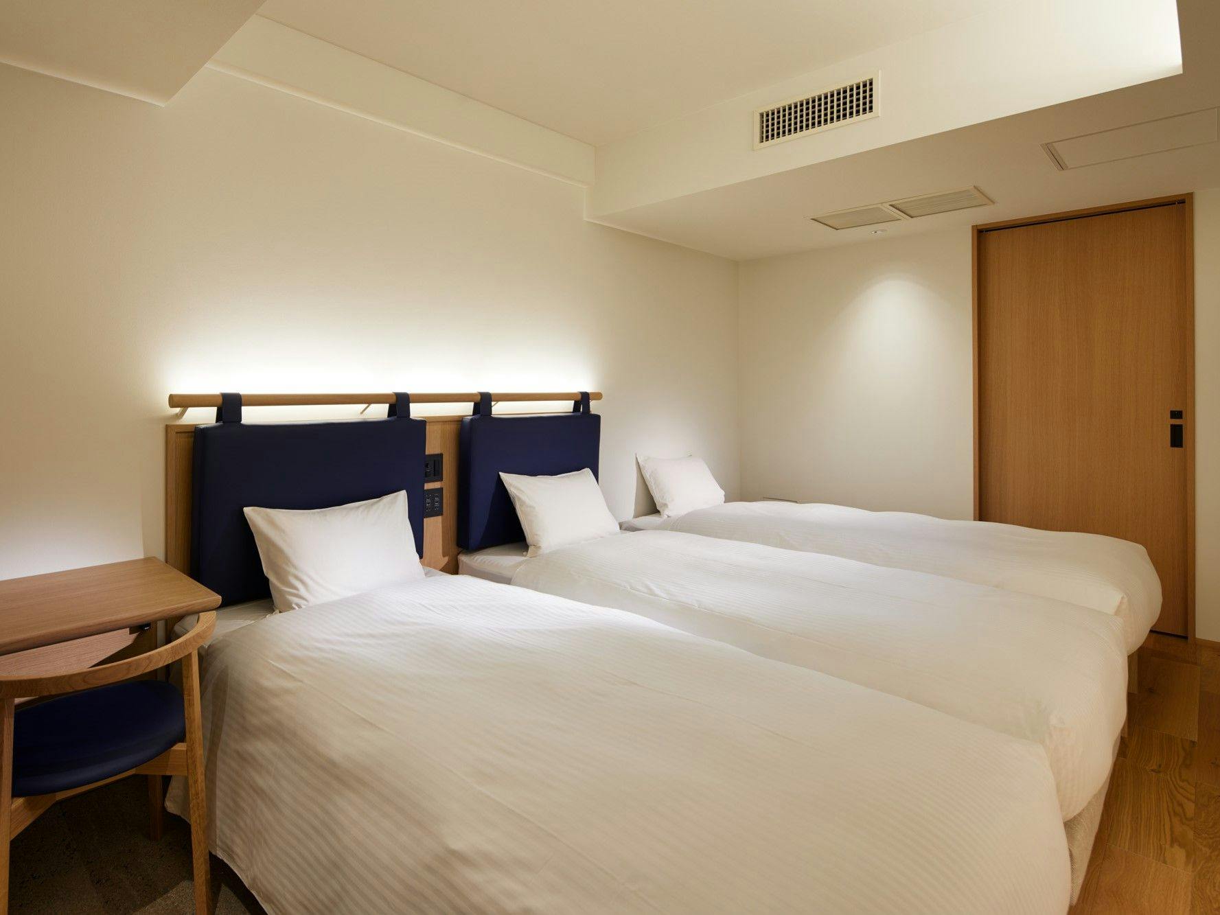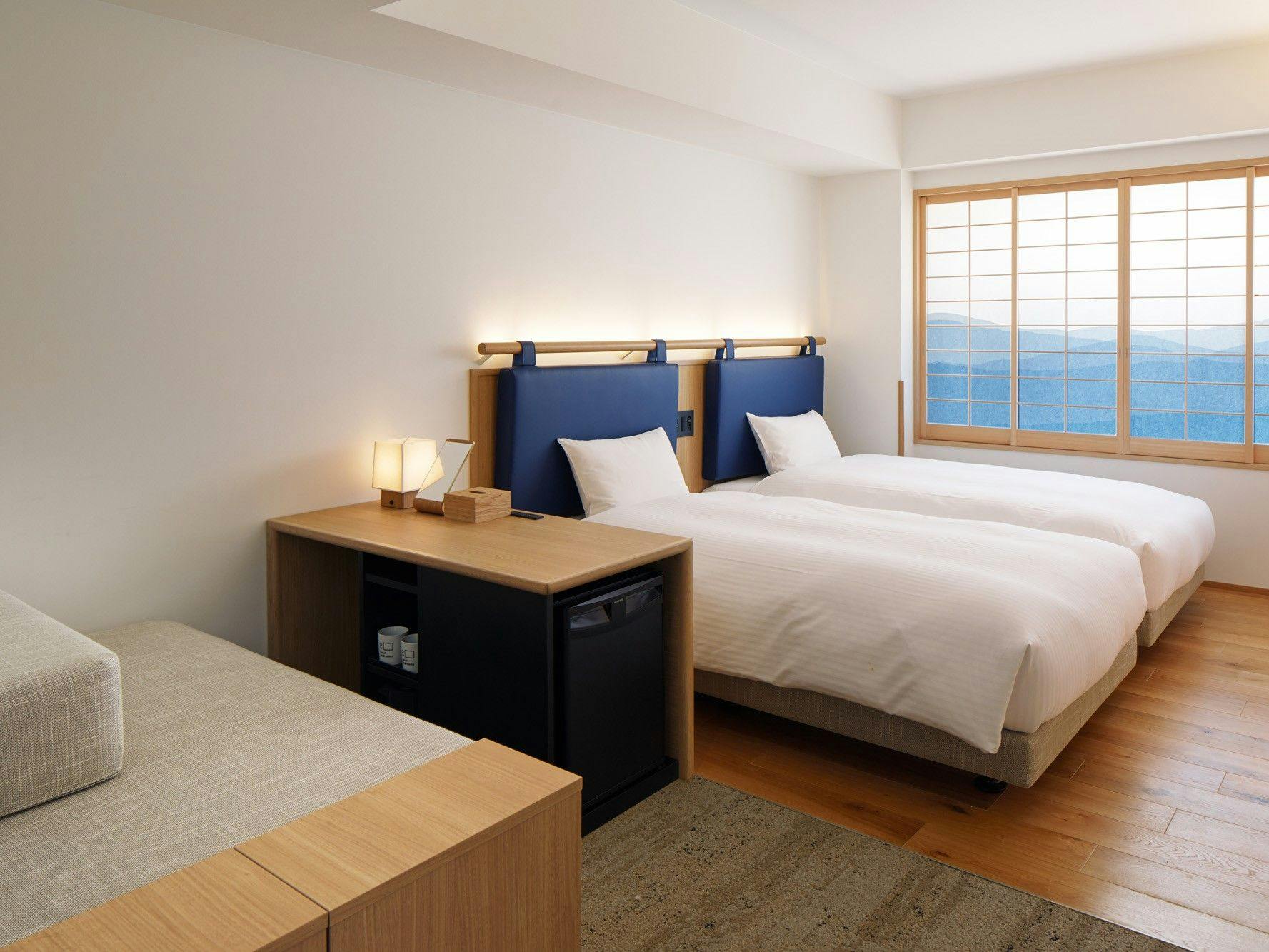20平米の客室に幅1100mmベッドを2台備え、ソファベッドを活用することで3名様までご宿泊いただけます。ユニットバスもゆとりのあるサイズを備えています。歯ブラシが客室に常設からレセプション提供に変わります。